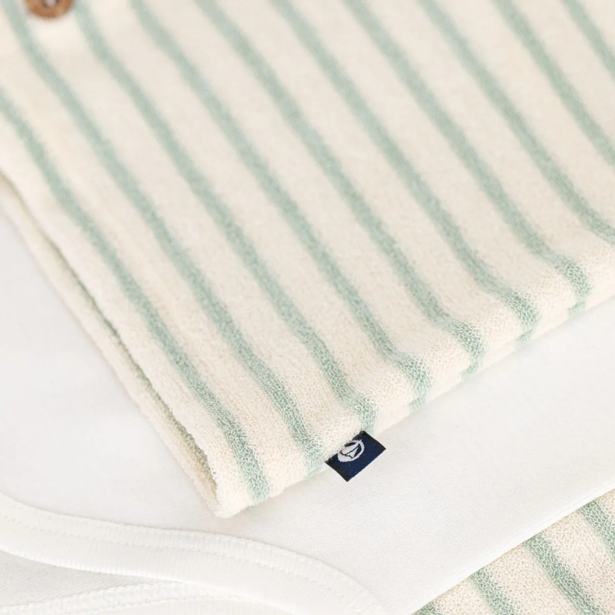 Completo unisex in spugna bouclette a righe, un materiale soffice, leggero e confortevole. Apertura con bottoni sul davanti del cardigan e pantaloni con vita elasticizzata per una facile vestibilità.