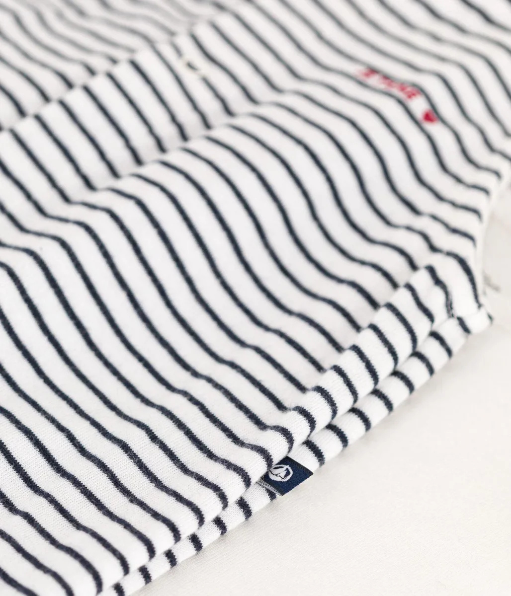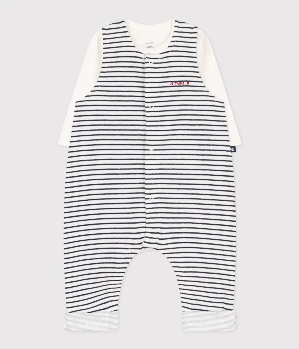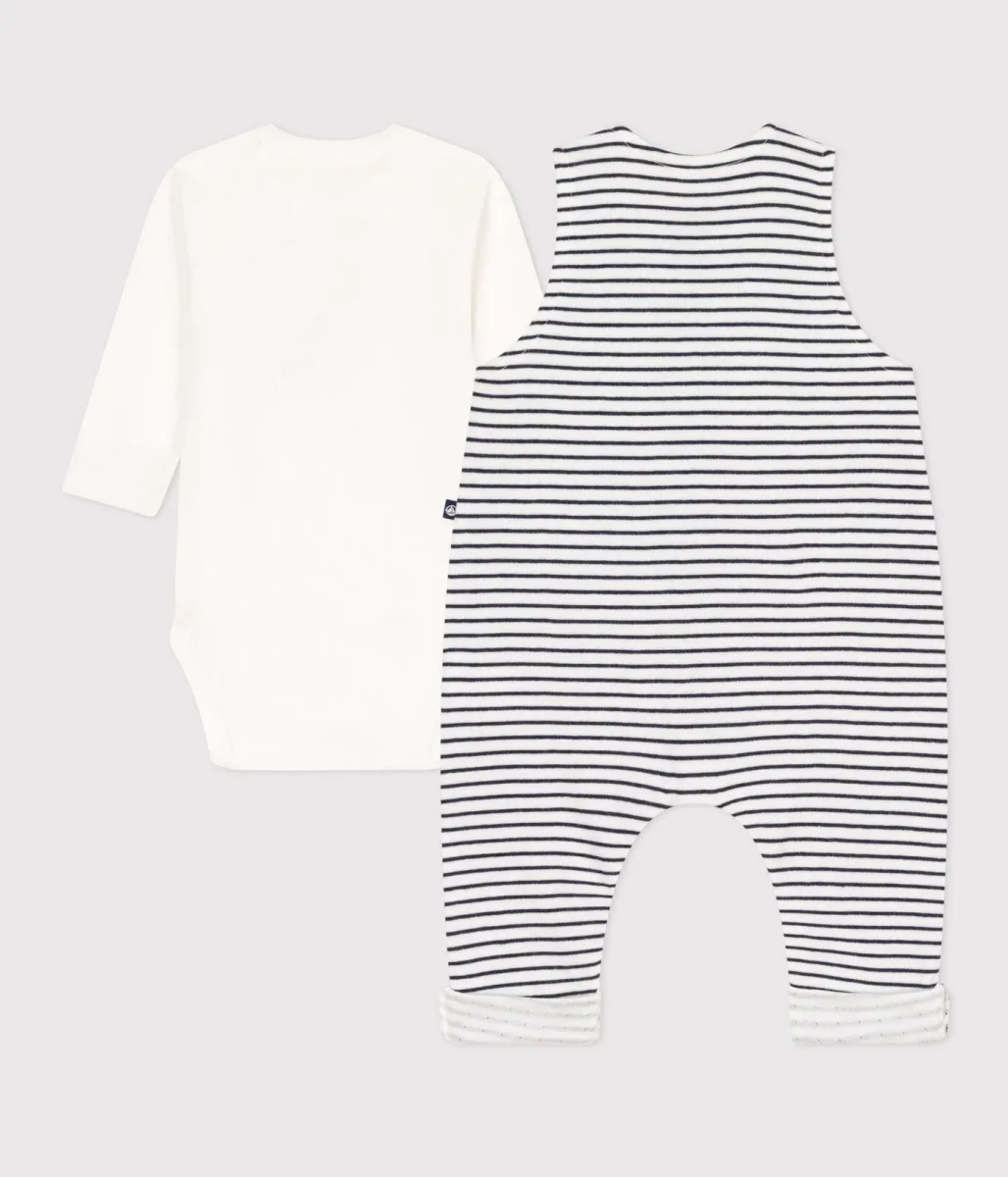 Completo composto da una tutina smanicata a righe in tubique e un body in cotone.