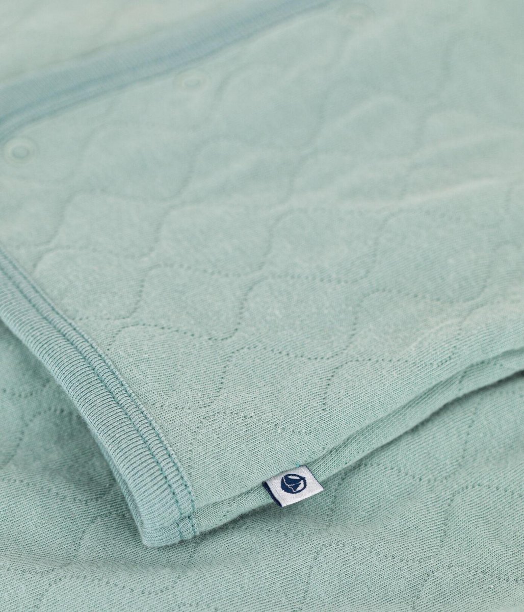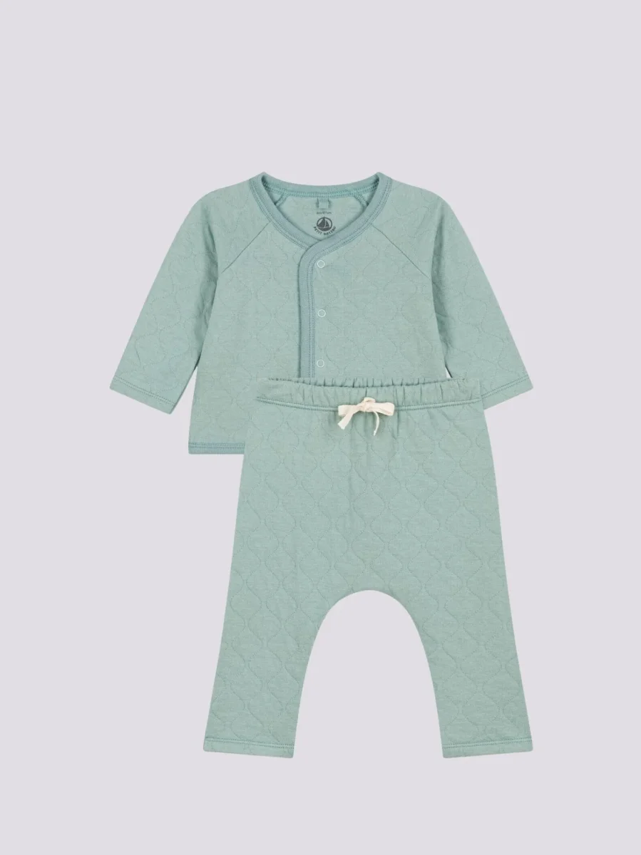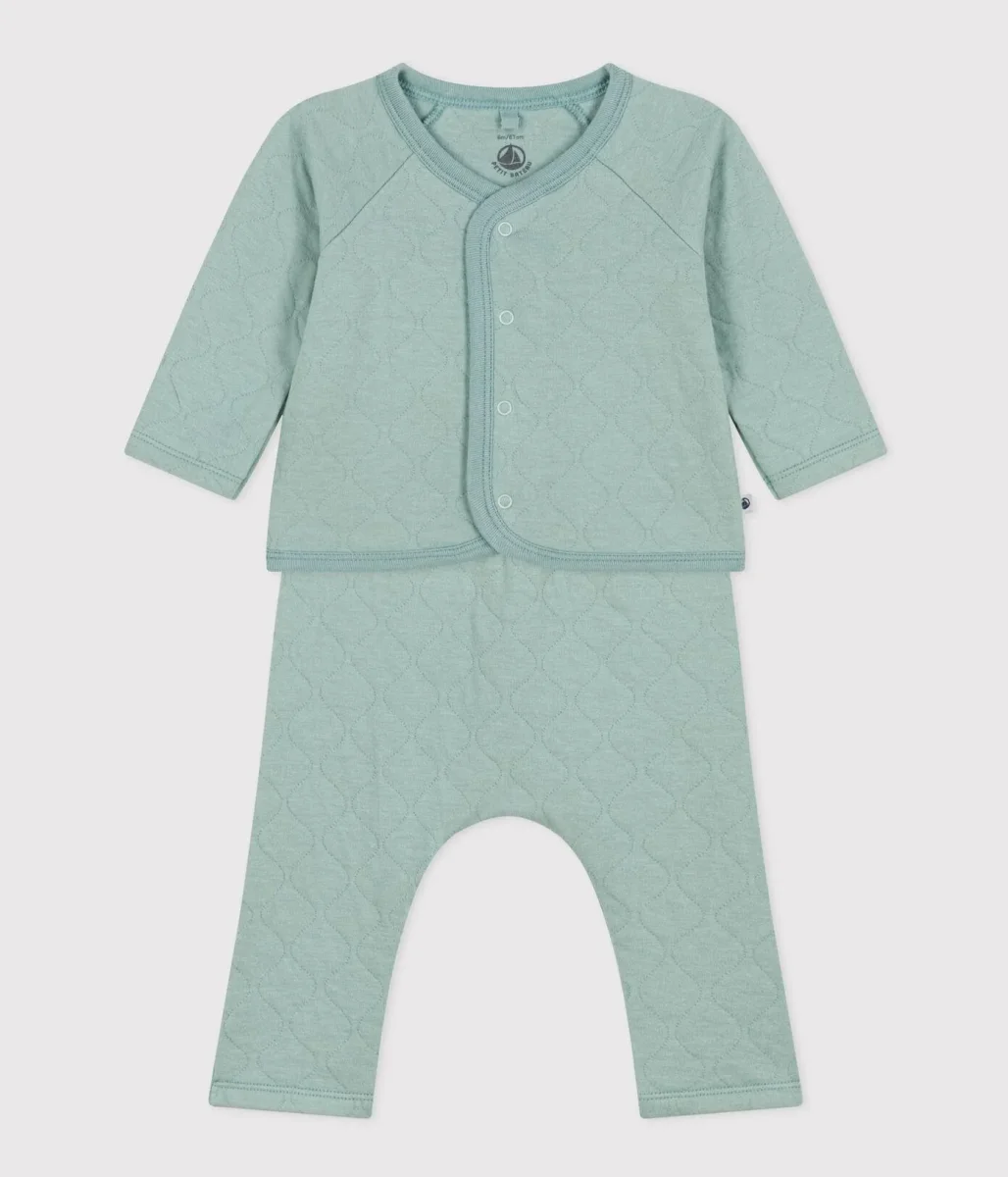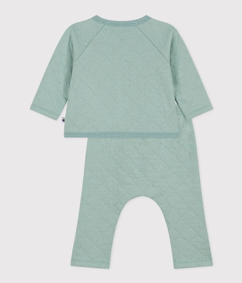 Completo composto da un cardigan e un pantalone in tubique trapuntato: due maglie estremamente morbide unite per essere ancora più soffici. Apertura integrale tramite automatici sul davanti del cardigan e coulisse sui pantaloni per una facile vestibilità.