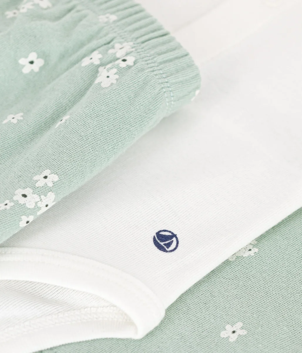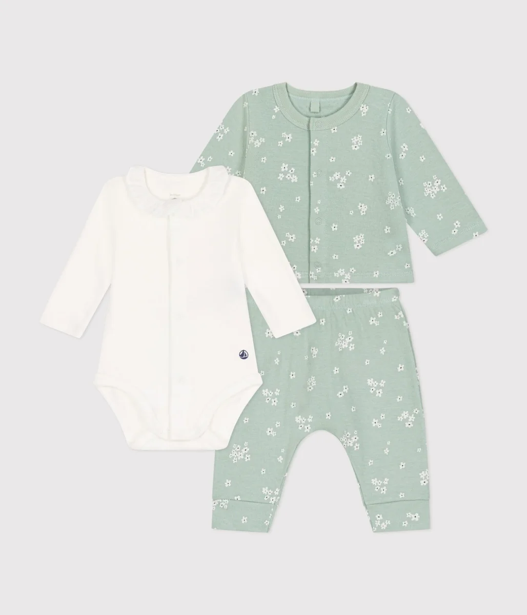 Completo verde pastello con stampa floreale. Cardigan e pantaloni in tubique, un tessuto morbido e comodo. Body con colletto a costine 1×1, il tessuto emblematico di Petit Bateau.