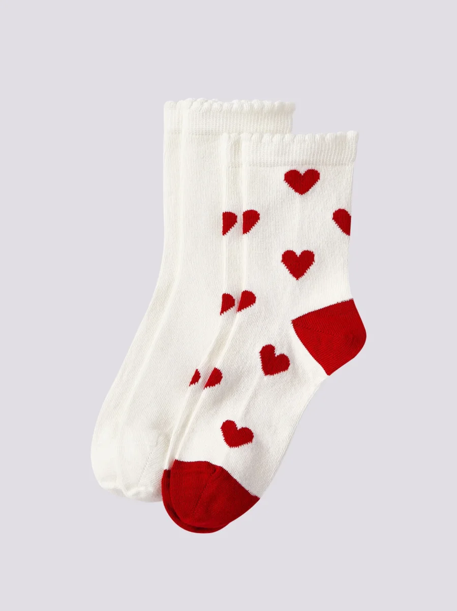 Confezione di due paia di calzini in cotone elastan, un paio a tinta unita e uno in fantasia a cuori.