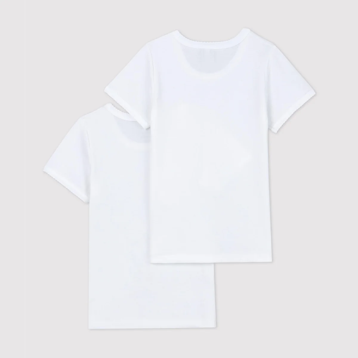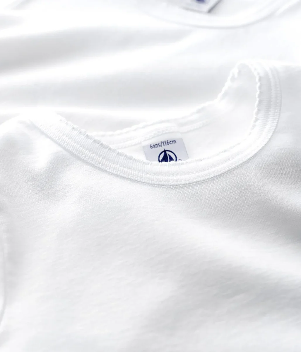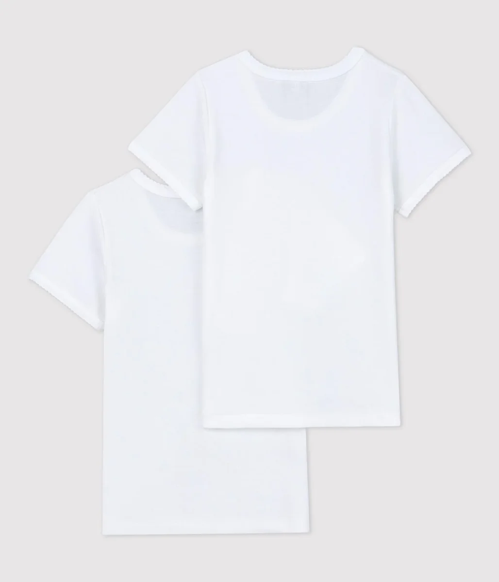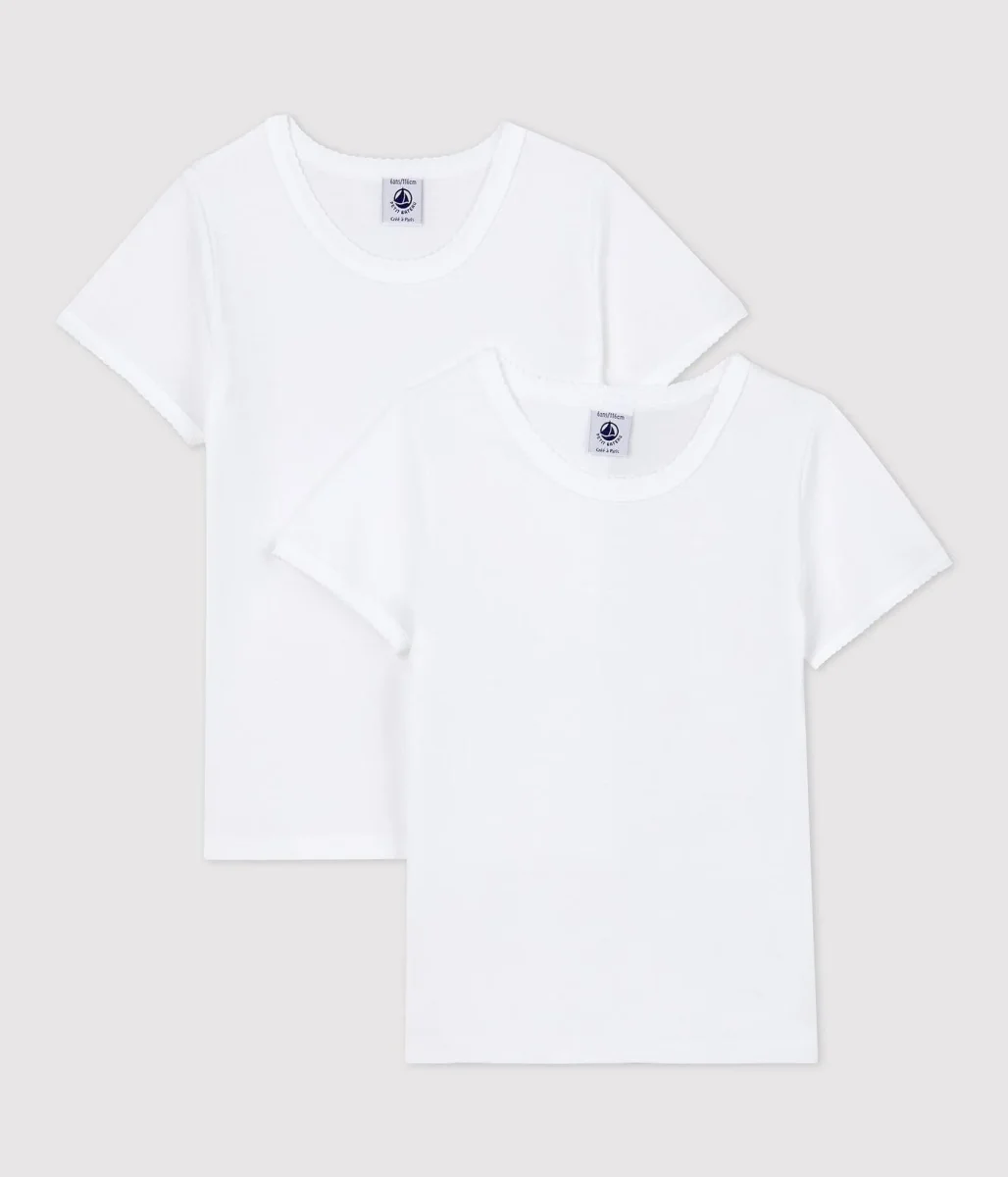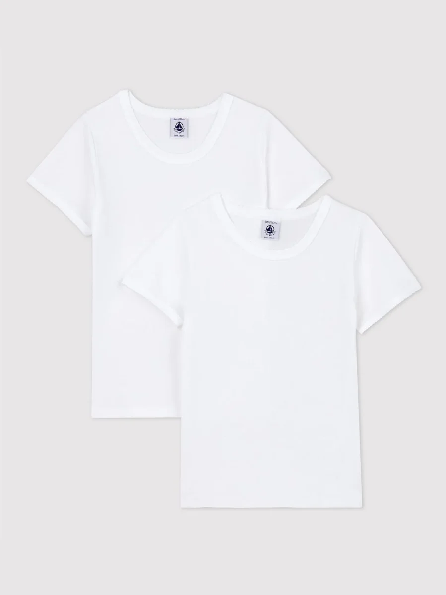 2 t-shirt manica corta a costine, il tessuto emblematico di Petit Bateau. Finiture picot. Da abbinare agli slip o alle mutandine coordinate. Prodotto certificato Standard 100 Oeko-Tex che garantisce il rispetto della pelle.