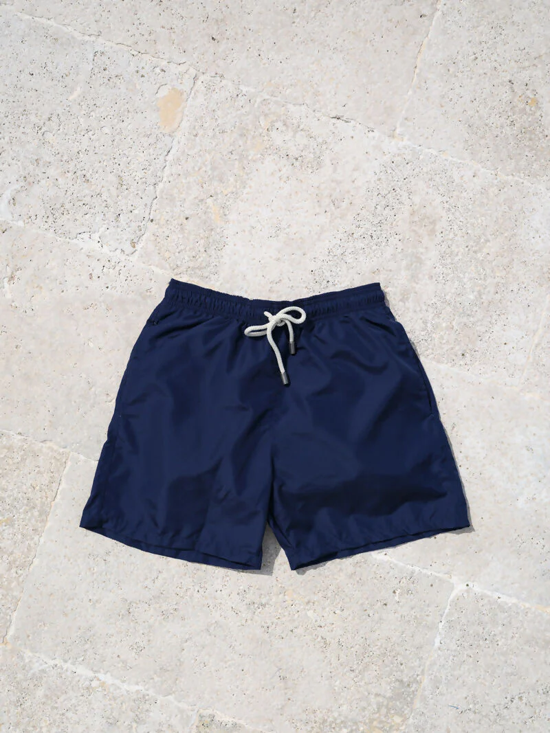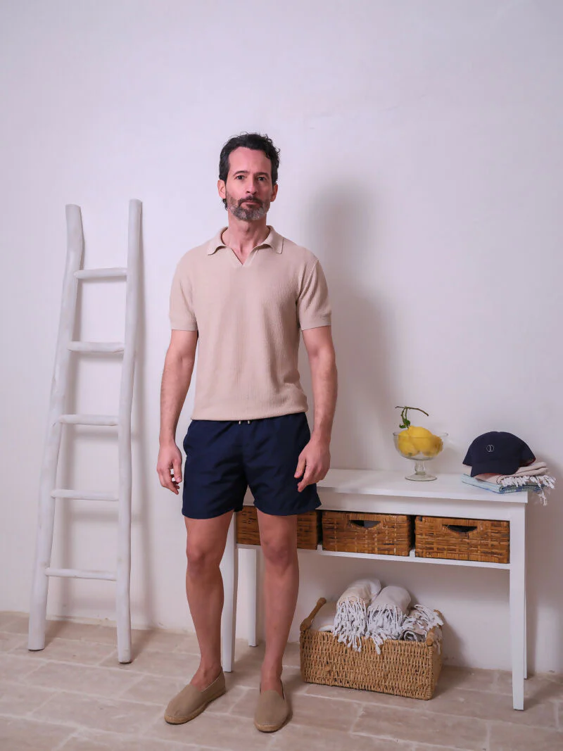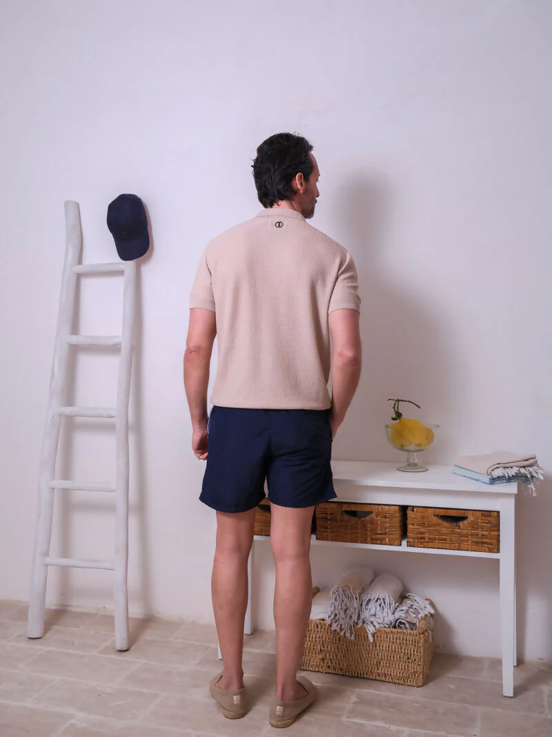 Costume da uomo a pantaloncino in tessuto tecnico leggero e idrorepellente. Realizzato in 100% poliestere e prodotto interamente in Italia, garantisce asciugatura rapida e vestibilità comoda grazie all’elastico in vita con coulisse regolabile. Elastico in vita a quattro battiture con cordino ecrù.