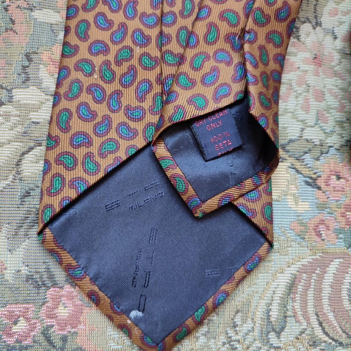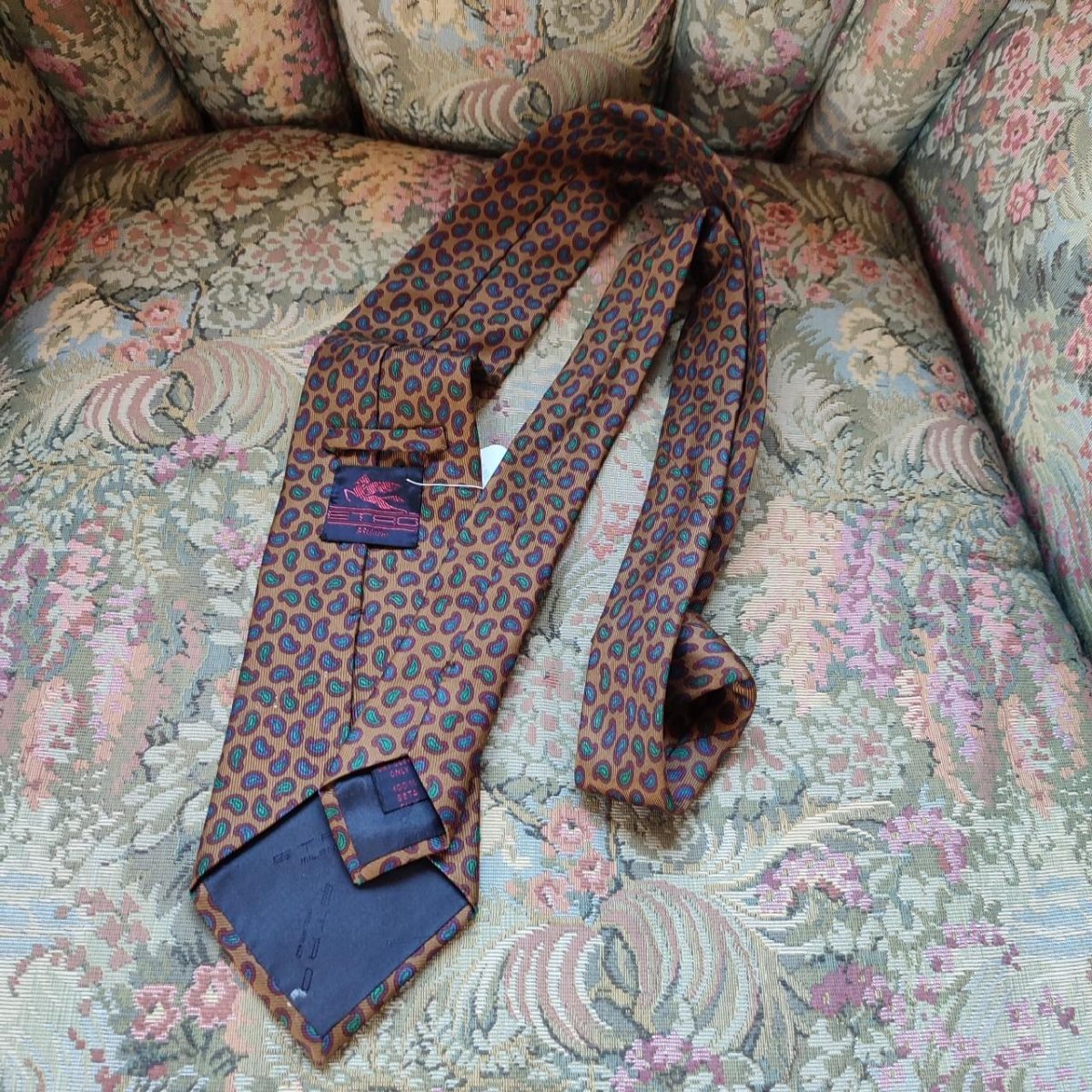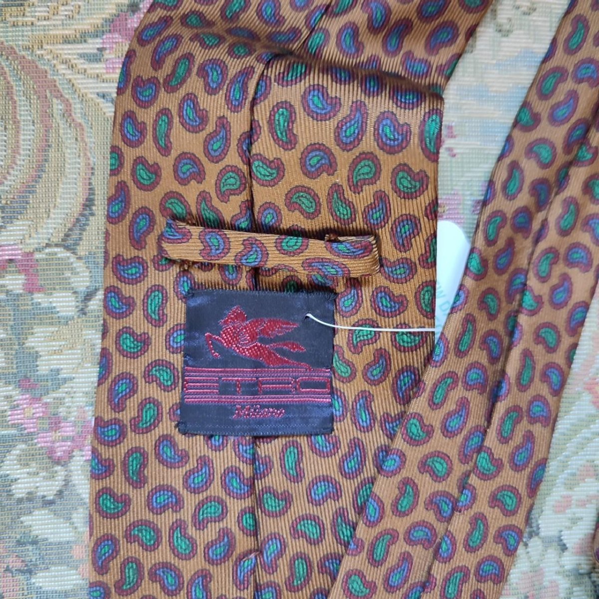 Cravatta 100% Seta. Marca Etro Milano. Fantasia Paisley Bordeaux, Verde e Blu su fondo Marrone Tabacco. Nel retro, la fodera reca il nome del Brand con realizzato con il chiaro e scuro dell’ordito. L’etichetta cucita, riporta sempre il nome ed il logo della Maison e sotto il passante cosi’ da fermare la parte sottile una volta indossata. Rispetto alle foto il fondo risulta essere leggermente piu’ scuro. Buone condizioni.