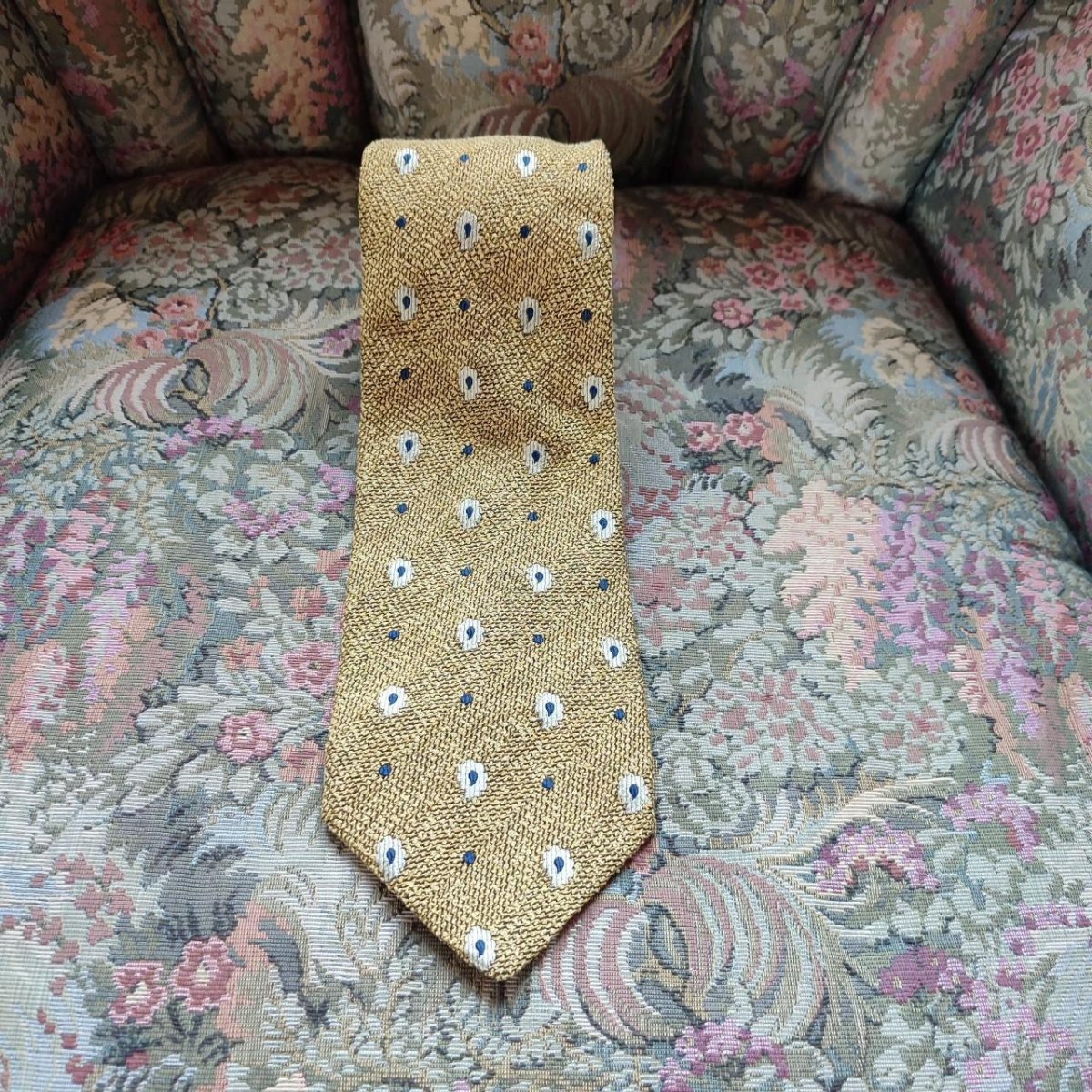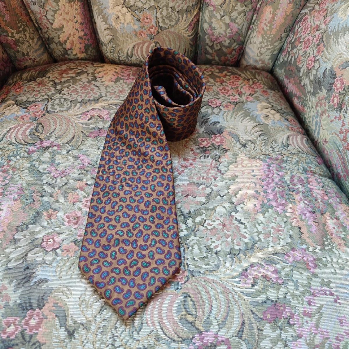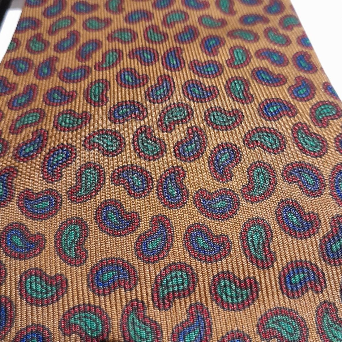 Cravatta 100% Seta. Marca Etro Milano. Fantasia Paisley Bordeaux, Verde e Blu su fondo Marrone Tabacco. Nel retro, la fodera reca il nome del Brand con realizzato con il chiaro e scuro dell’ordito. L’etichetta cucita, riporta sempre il nome ed il logo della Maison e sotto il passante cosi’ da fermare la parte sottile una volta indossata. Rispetto alle foto il fondo risulta essere leggermente piu’ scuro. Buone condizioni.