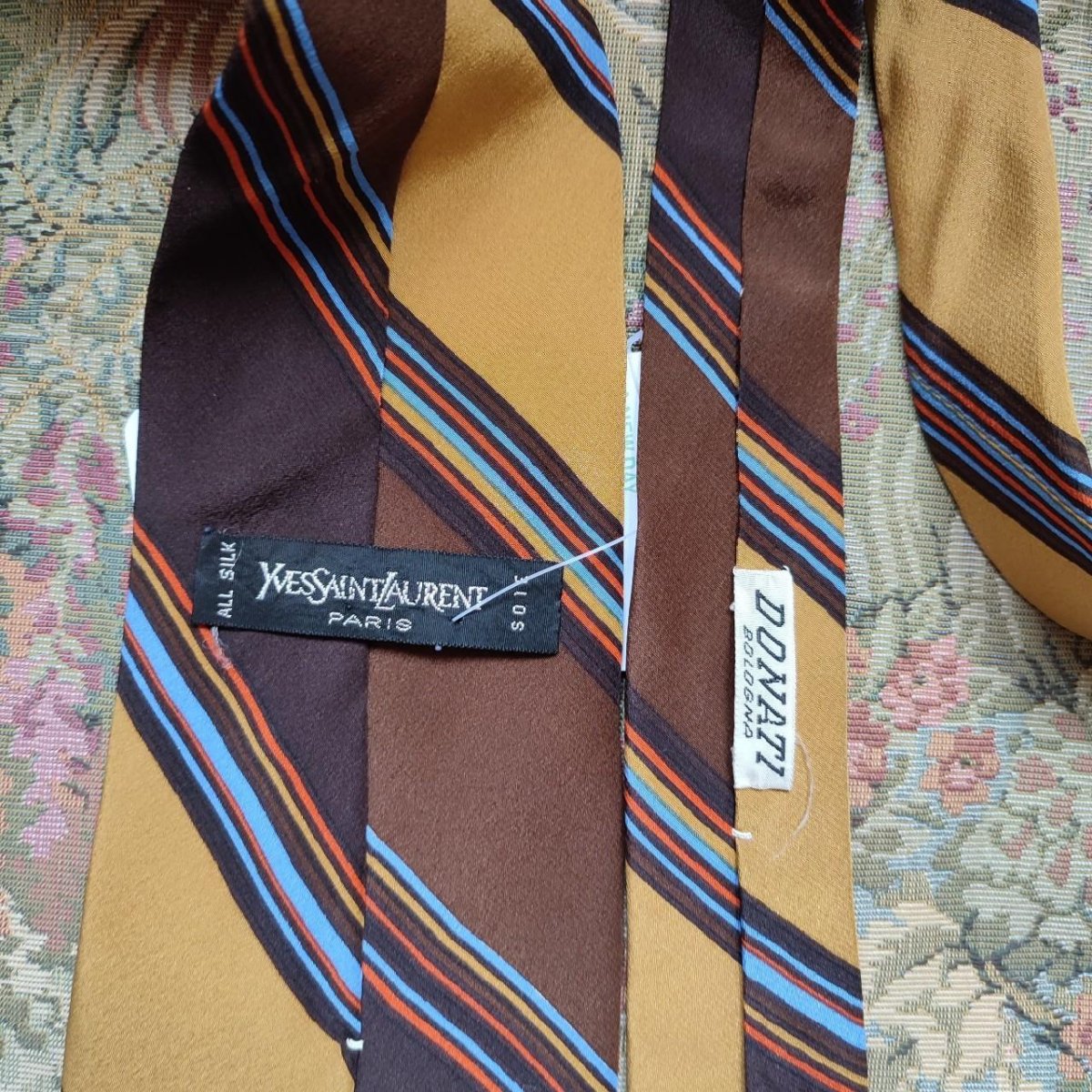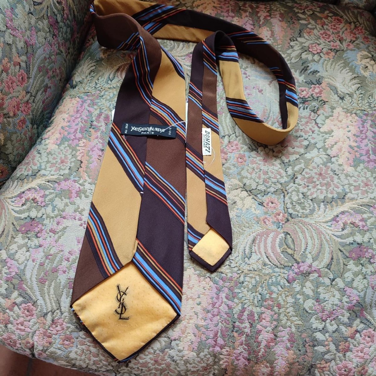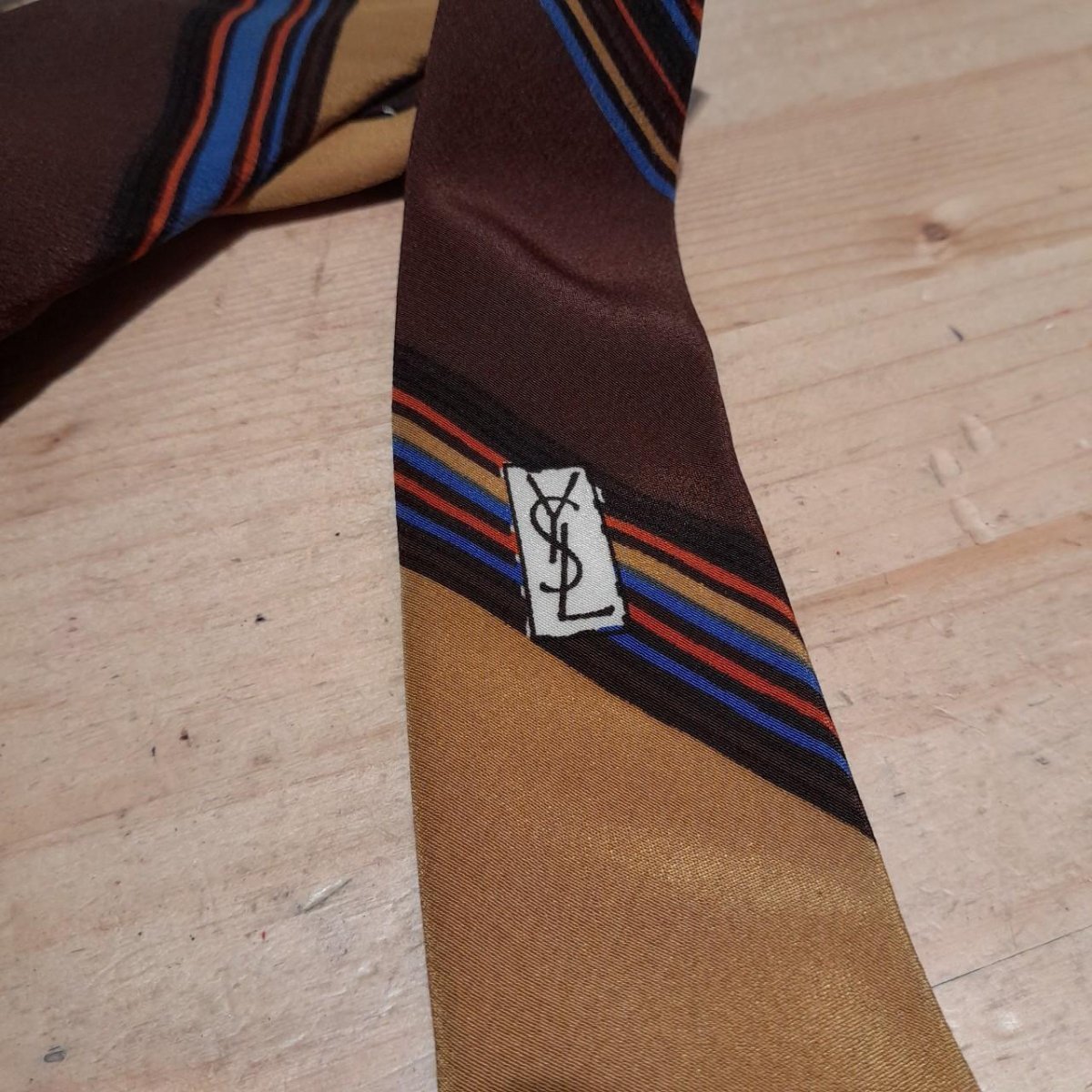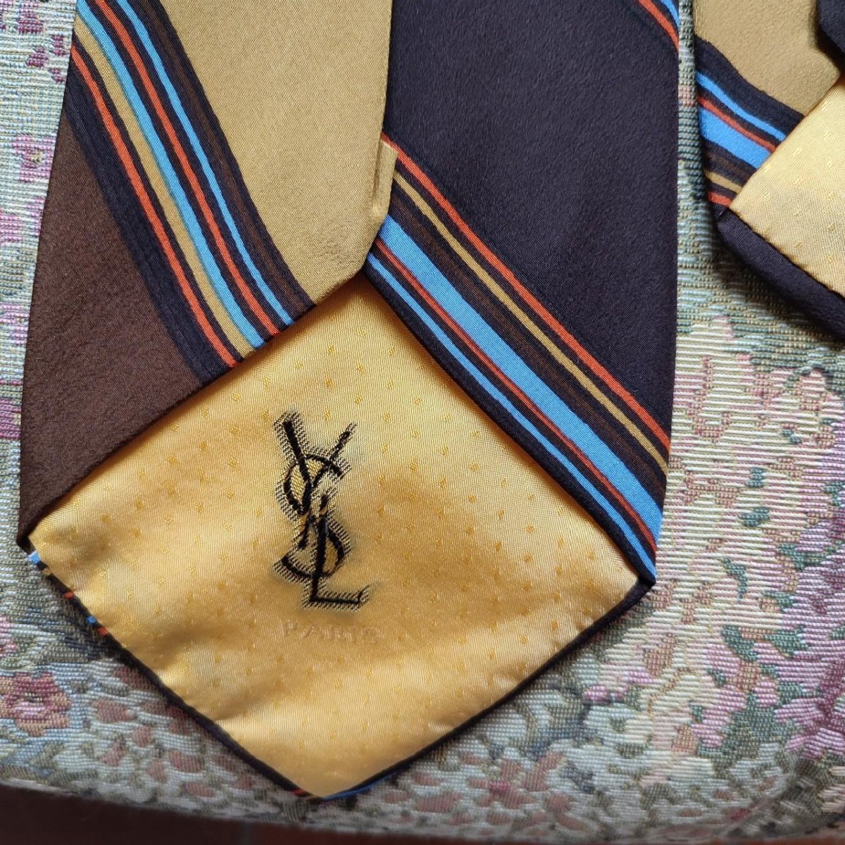 Cravatta 100% Seta. Marca Yves Saint Laurent. Fantasia regimental nelle tonalitè del Marrone Testa di Moro, Marrone Tabacco e Ocra Scuro, con Parti Multicolor a contrasto e in tonalità. La seta utilizzata è di altissima qualità. Internamente, nella punta piu’ larga il logo del Brand. Mentre, nella punta piu’ stretta, esternamente, le cifre della Maison, sono nella stampa del tessuto, su fondo Bianco. Accessorio che conferisce estrema eleganza a chi lo indossa. Una piccolissima macchiolina, come da foto, che non ne pregiudica la bellezza. Buone condizioni.