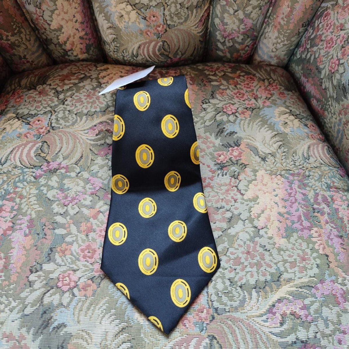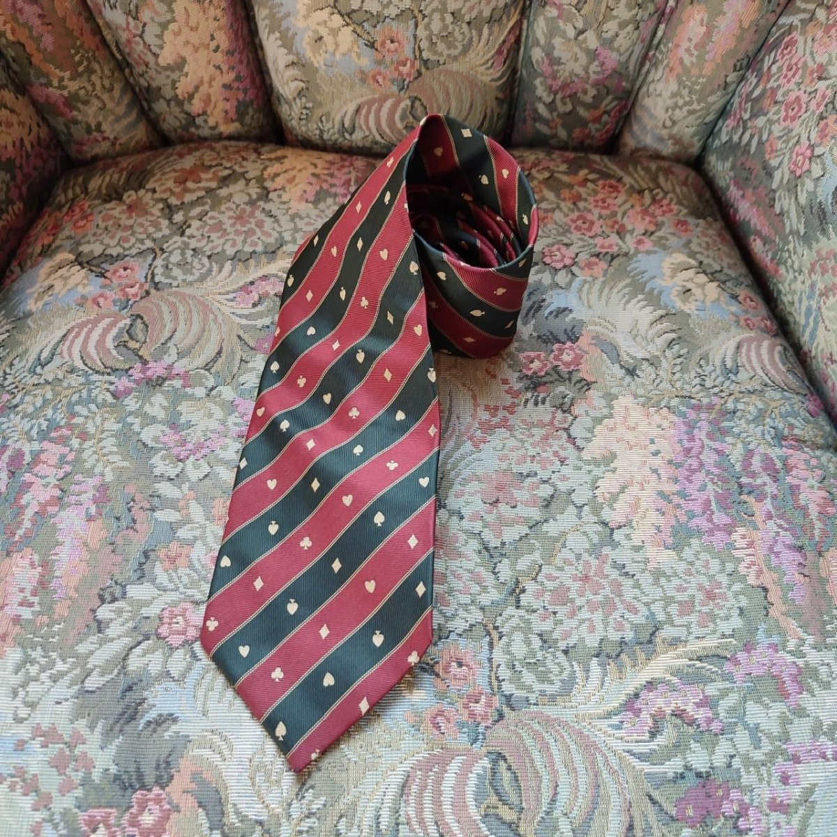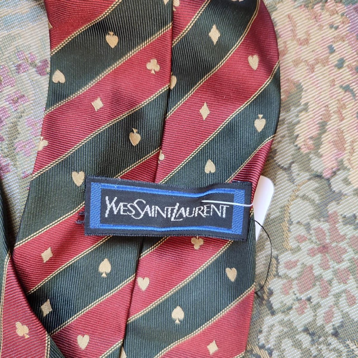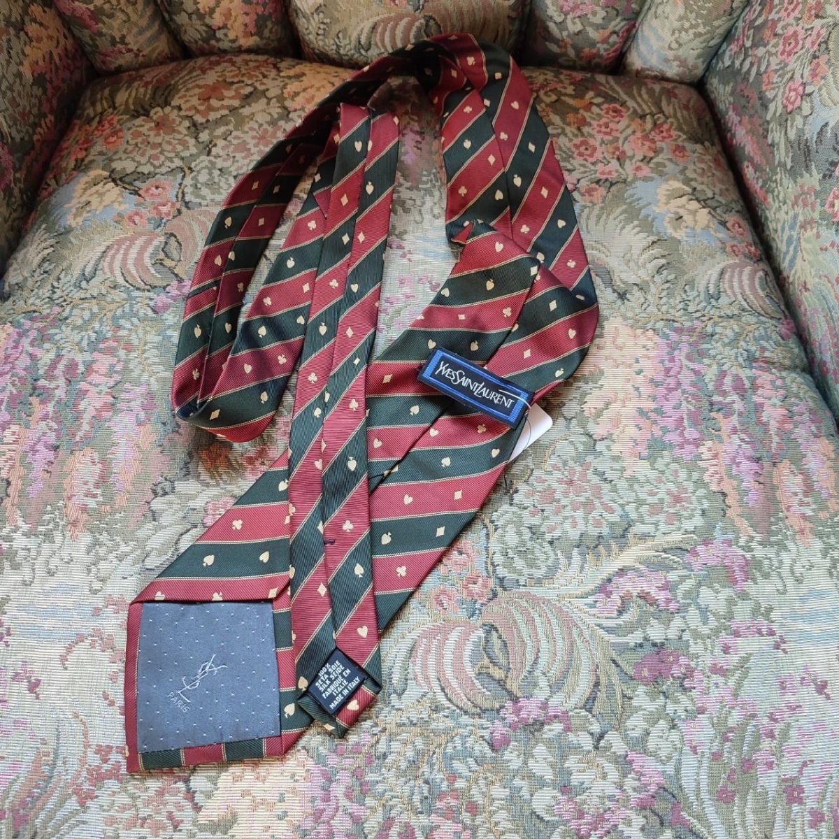 Cravatta 100% Seta. Marca Yves Saint Laurent. Fantasia Regimental Colore Verde Scuro Alga Marina e Bordeaux con dettagli in color Oro Brunito. La fantasia viene sapientemente costellata da i semi delle carte francesi, che creano eleganti punti focali ed illuminano l’articolo. Nella fodera in un gioco di chiaro e scuro vengono riportate le Cifre del brand. Un’etichetta cucita, che pero’ da una lato andrebbe megio assicurata, riporta invece il Nome della Maison per esteso. Buone condizioni.