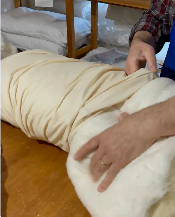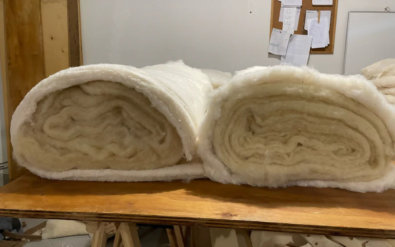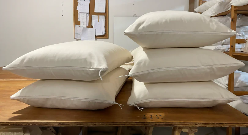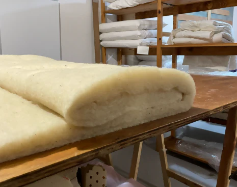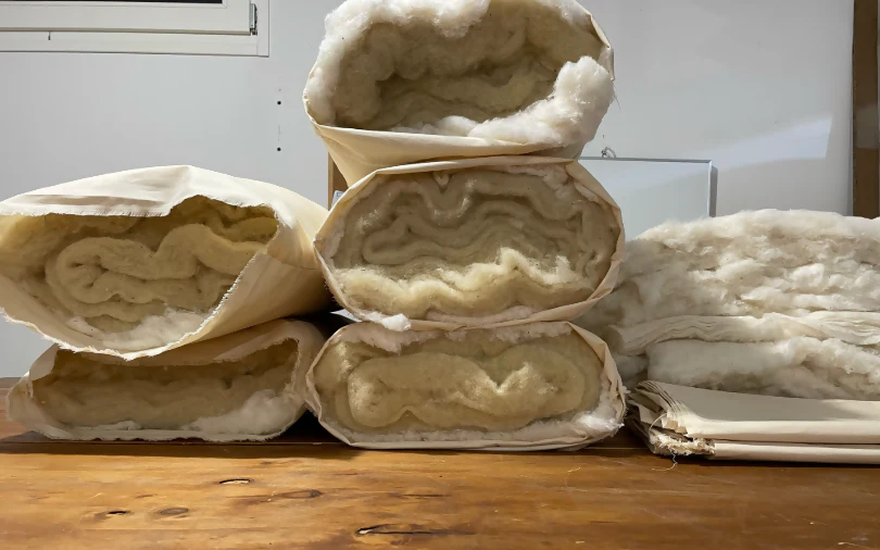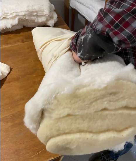 Il cuscino viene assemblato inserendo più strati cardati in modo che il giro esterno sia di cotone di 1° scelta e l’interno di lana.