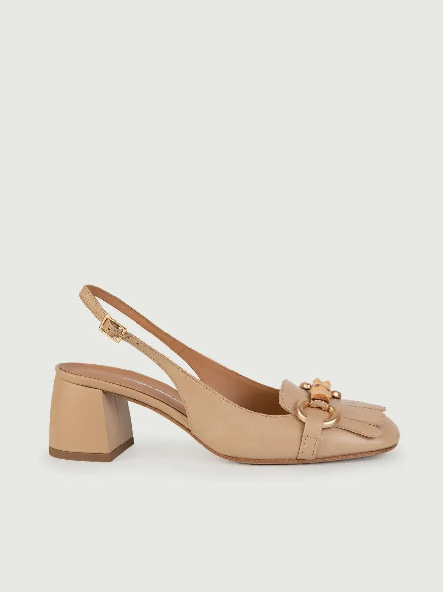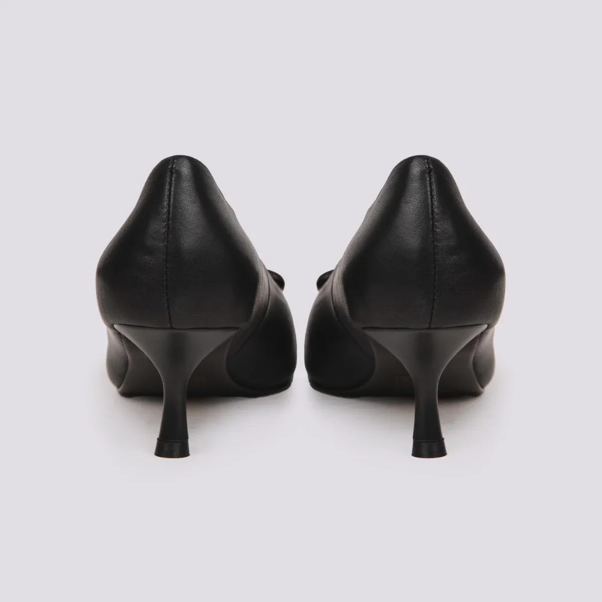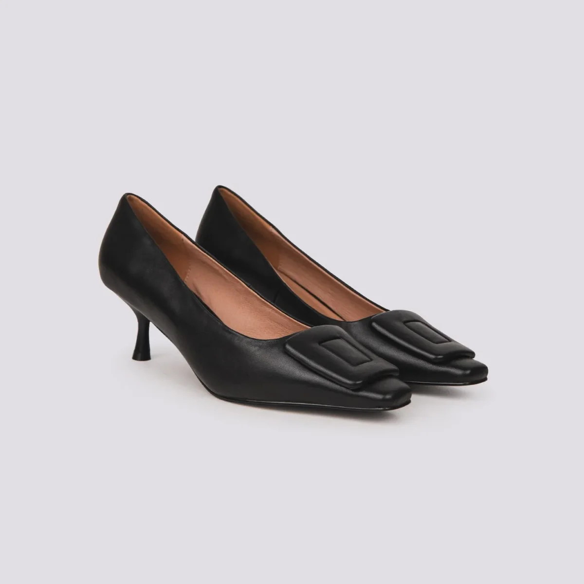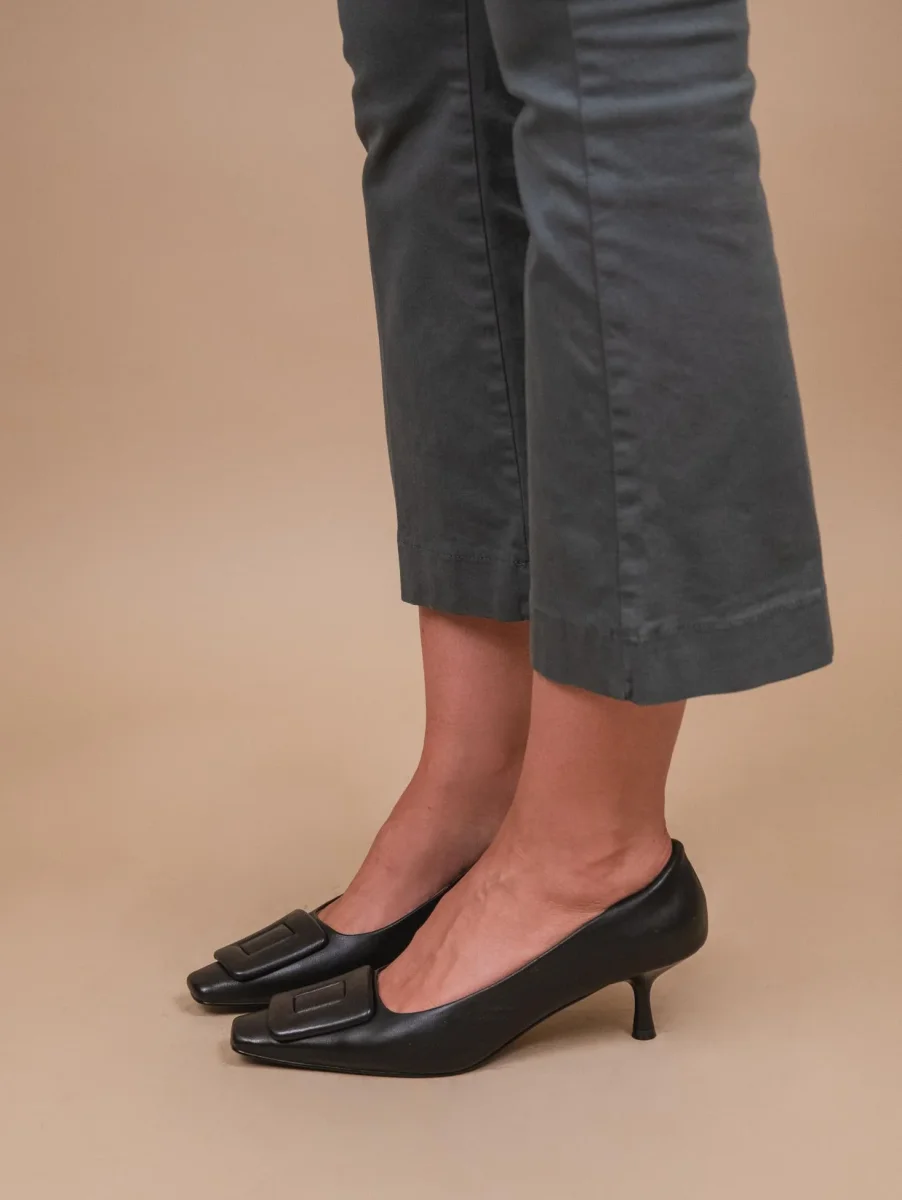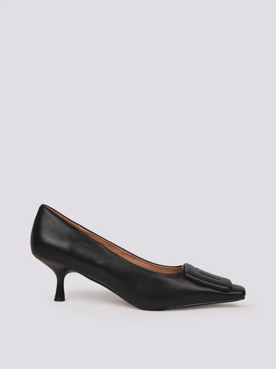 Decollete in morbida pelle nappa nera con applicazione in pelle frontale in pelle in tonalità. Altezza tacco a rocchetto: 5 cm ideale per essere portato anche per giornate intere. Punta affusolata leggermente squadrata. Calzata regolare. Tomaia e fodera in vera pelle. Suola in gomma.