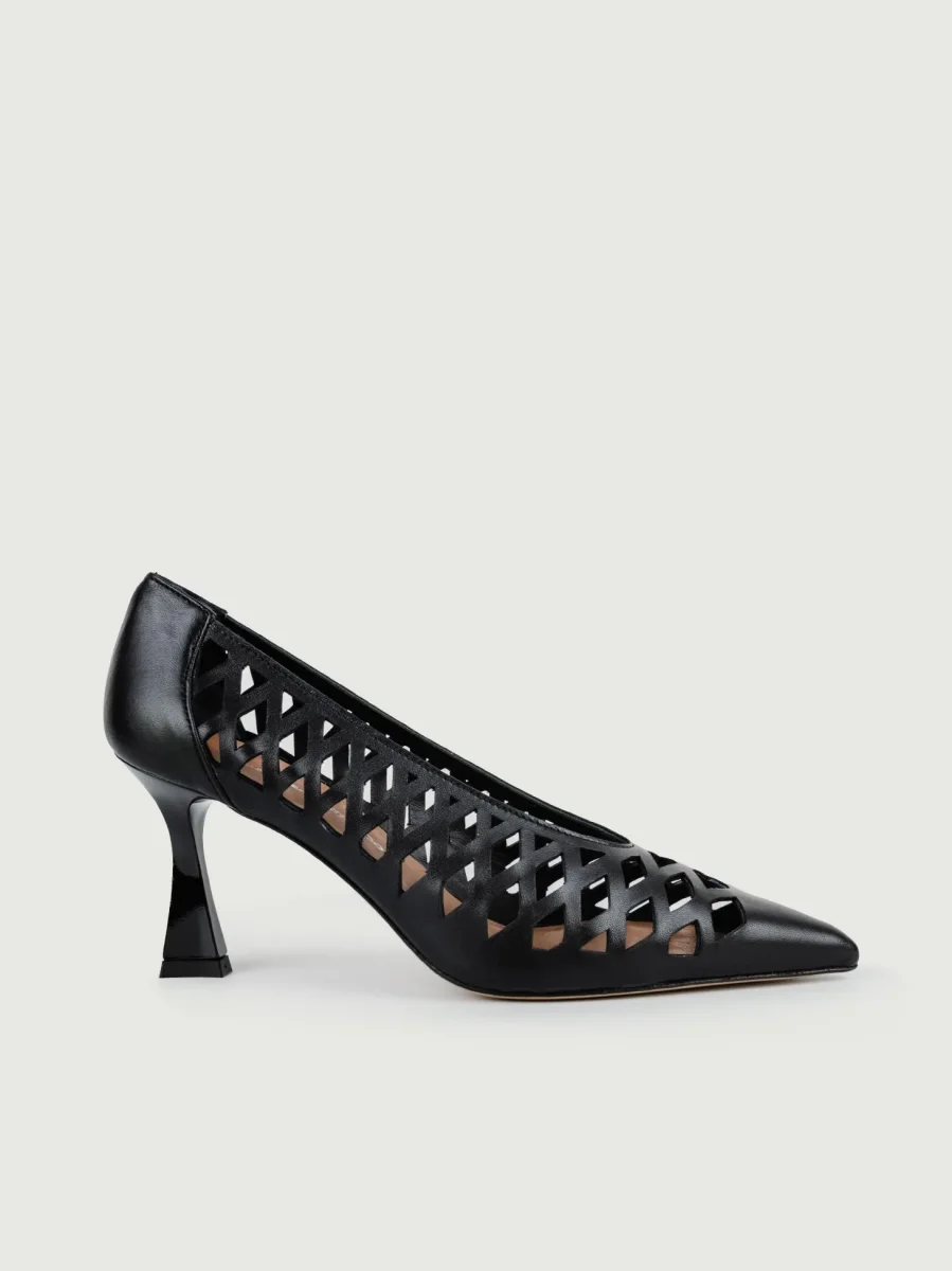 Decollete in vernice nera con cinturino alla caviglia, plateau e tacco spesso. Punta stondata stile anni 80. Cinturino in tonalità regolabile a seconda delle preferenze. Tacco a contrasto in legno. Altezza plateau: 2.5 cm. Altezza tacco: 10.5 cm. Calzata regolare. Tomaia e fodera in vera pelle. Suola in gomma.