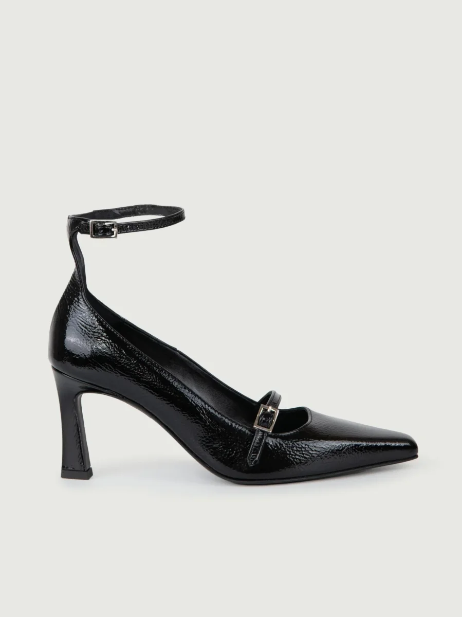 Decollete in pelle effetto naplak nero con cinturino sul collo del piede regolabile a seconda delle preferenze. Punta stondata. Una scarpa versatile e chic. Il tacco spesso riprende la forma della punta e dona armonia al suo complesso. Altezza tacco: 6 cm. Tomaia e fodera in vera pelle. Suola in gomma. Calzata regolare.