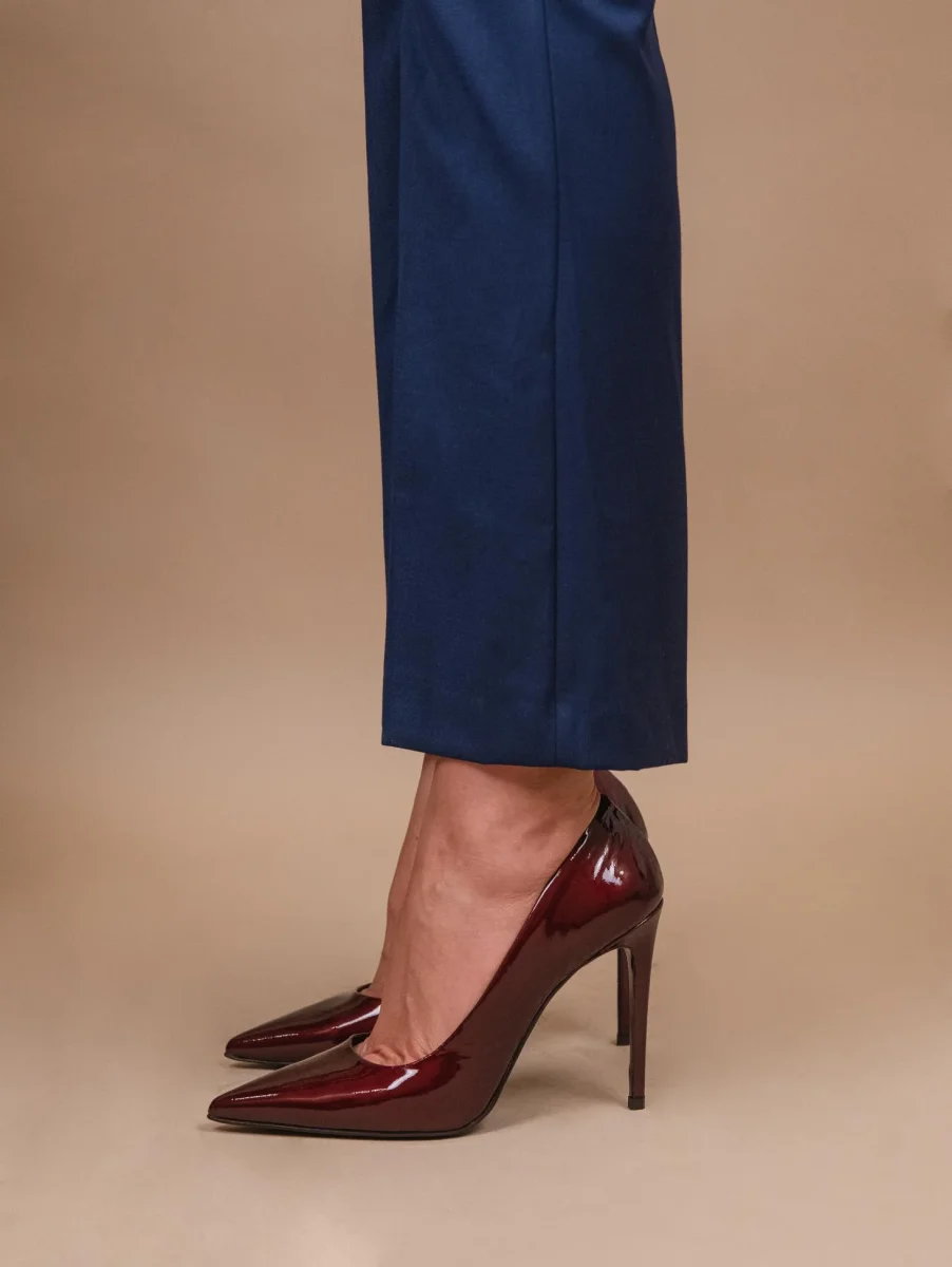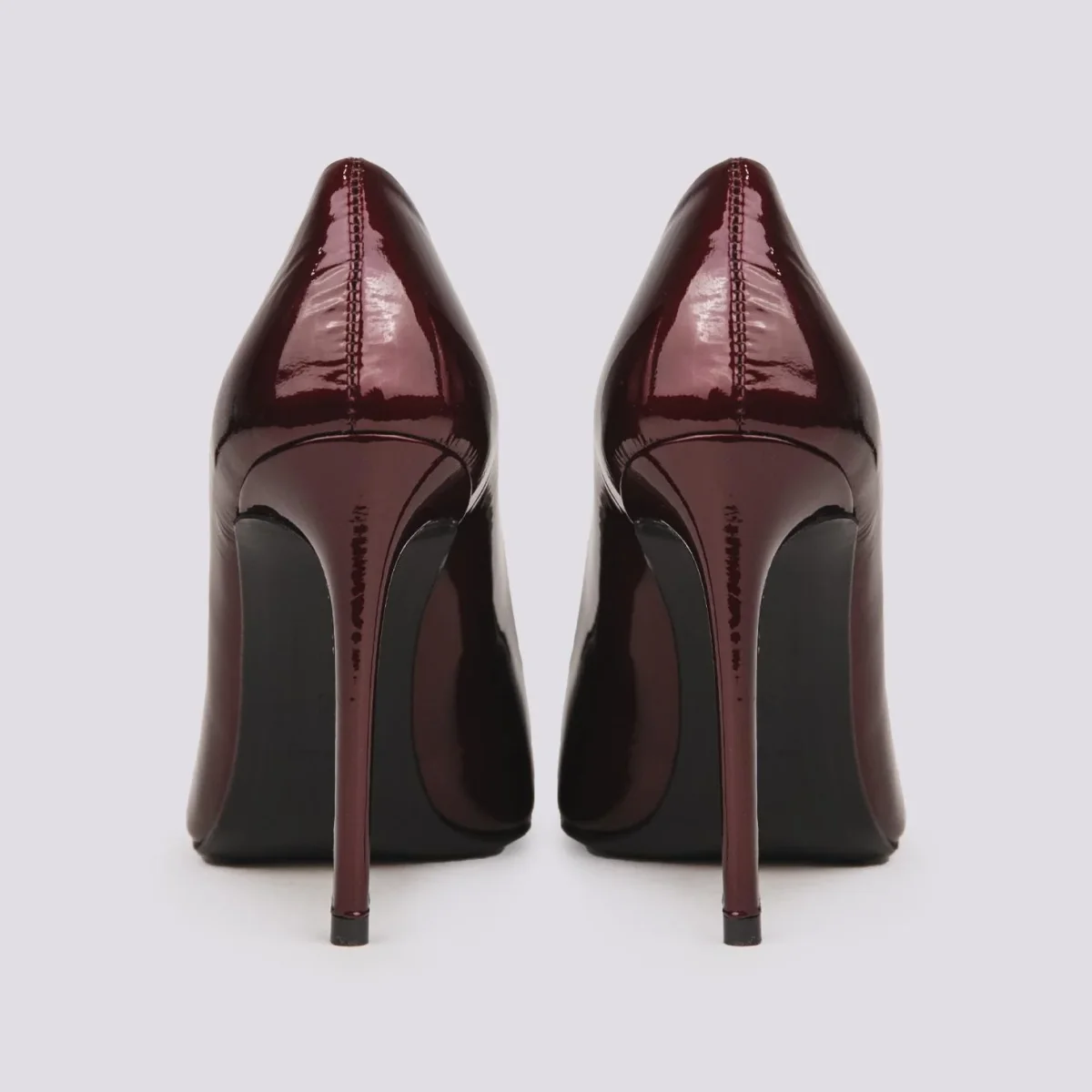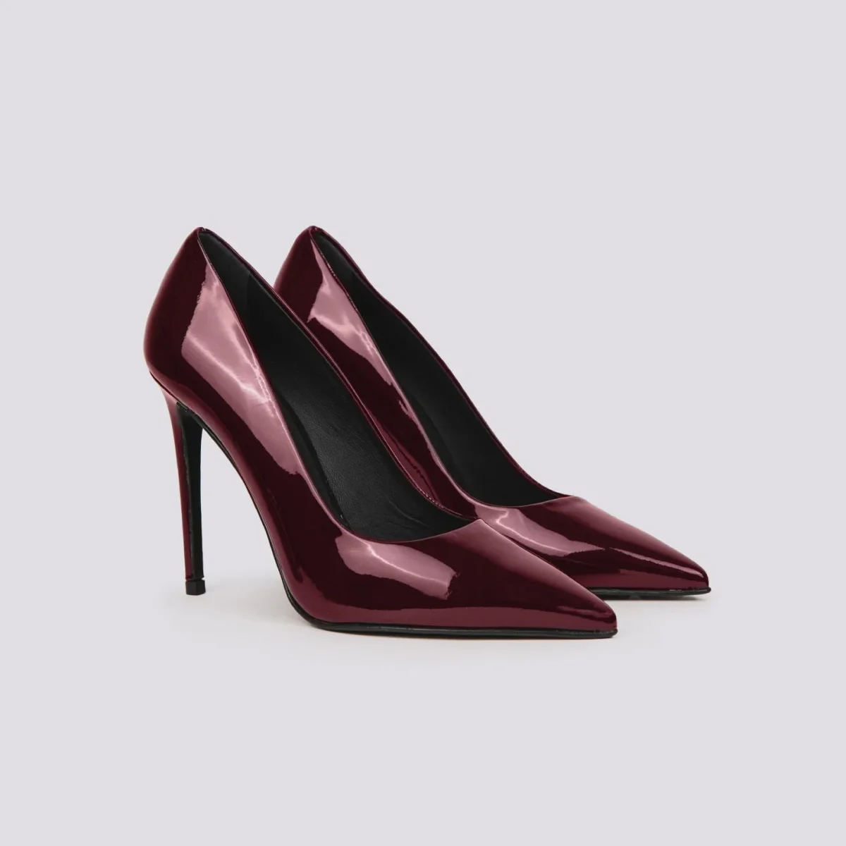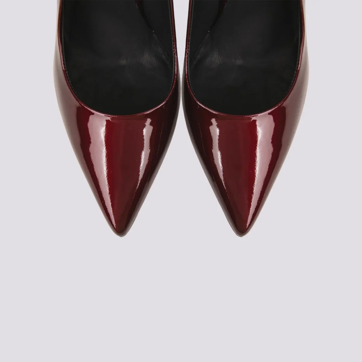 Decollete in pelle vernice bordaux con tacco alto a spillo. Una scarpa super sensuale che aggiungerà un tocco di femminilità in più anche al look più semplice. Calzata regolare. Altezza tacco: 10 cm. Tomaia e fodera in vera pelle. Suola in gomma.