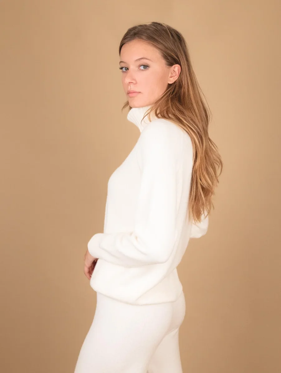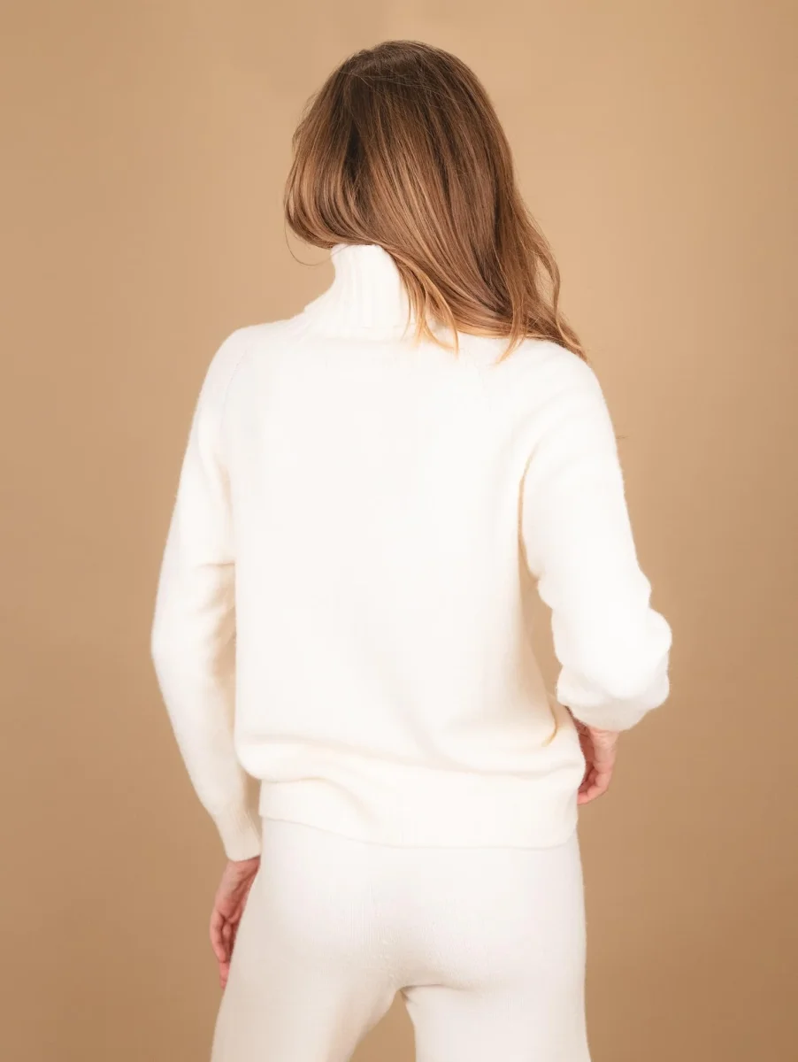 Dolcevita in maglia panna con maxi collo. Maniche lunghe. Dettaglio costine lungo tutti i profili del capo. Vestibilità regolare. Peso medio. Composizione: 50% vi, 27% po 23% pl.