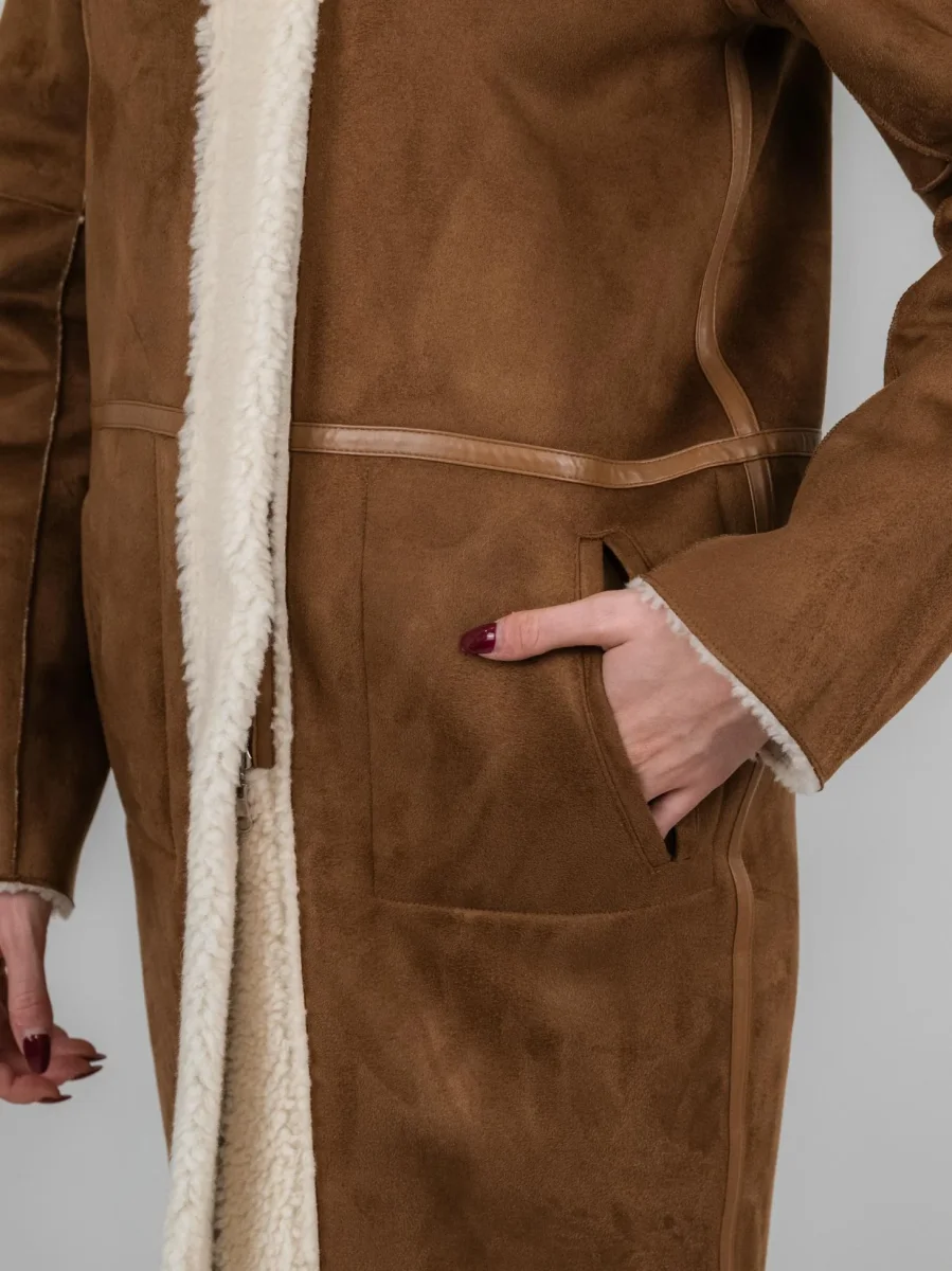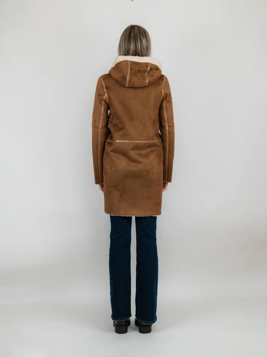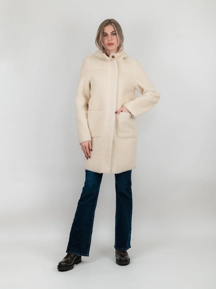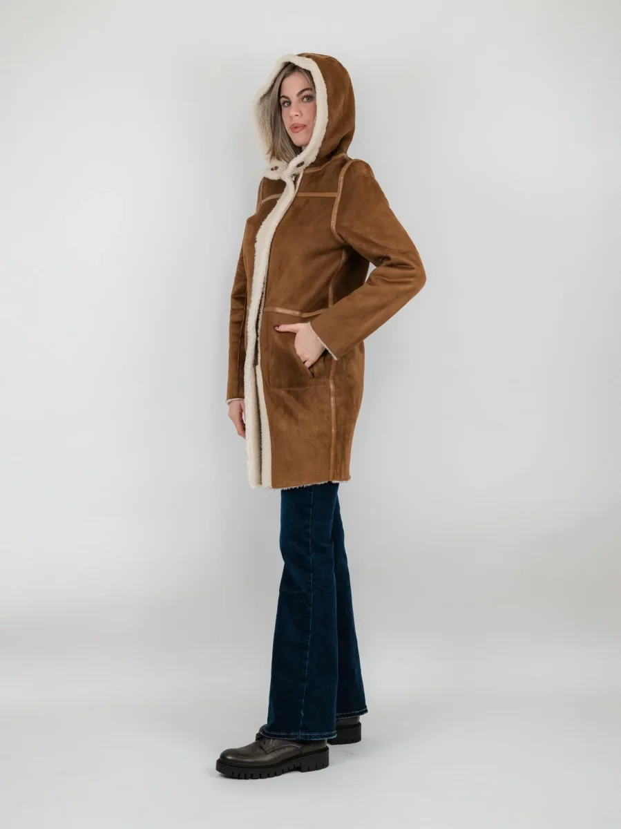 Ecomontone lungo con chiusura zip frontale e cappuccio.
