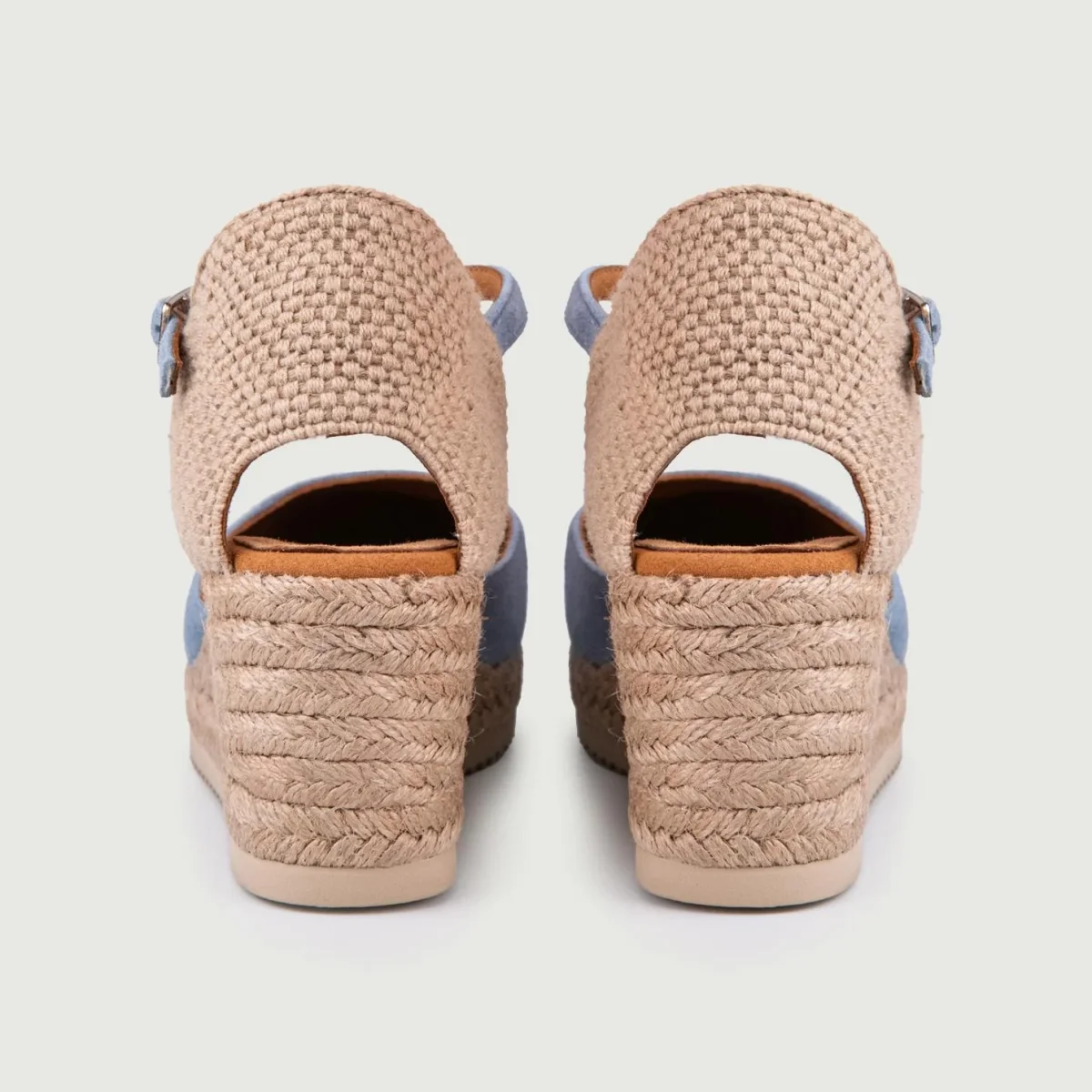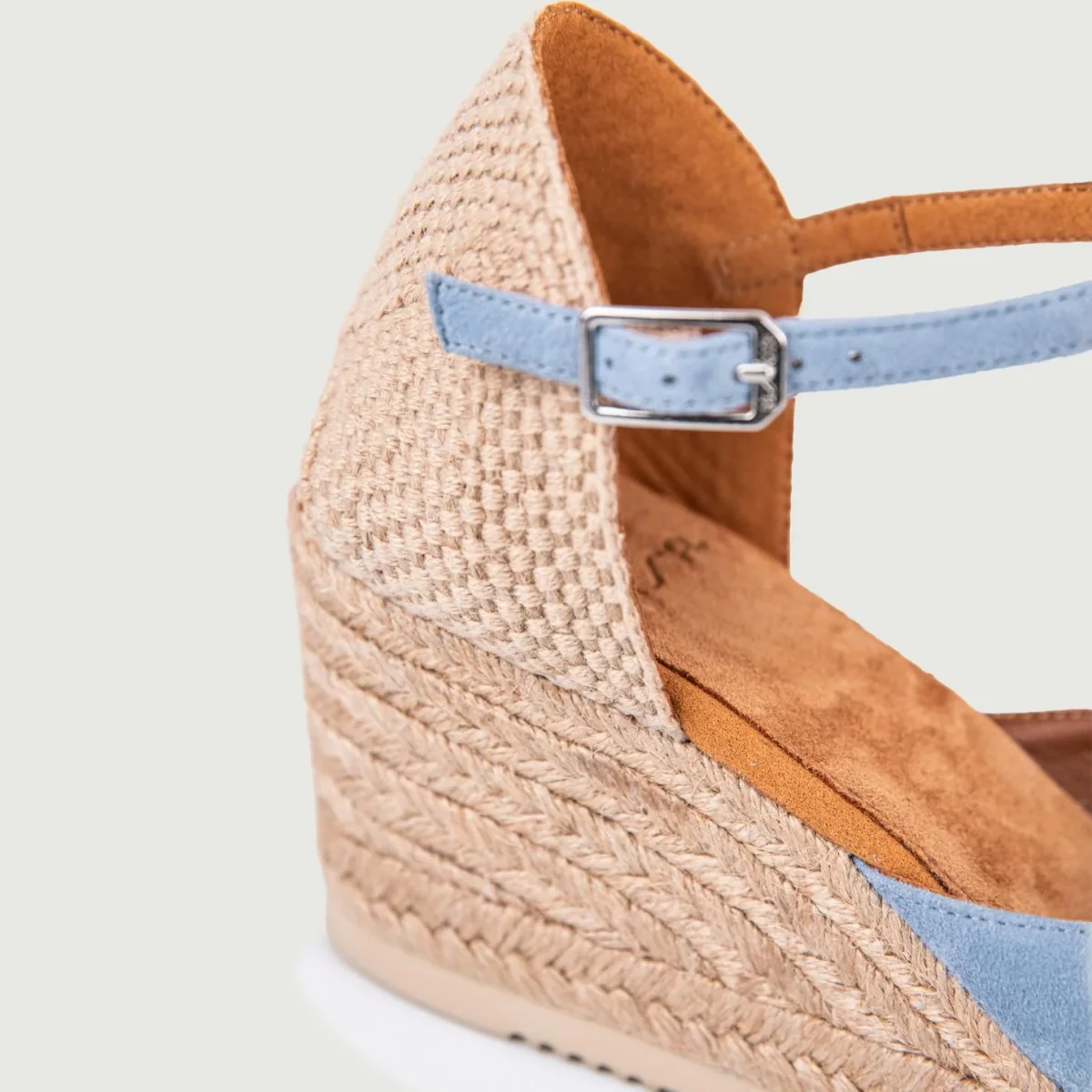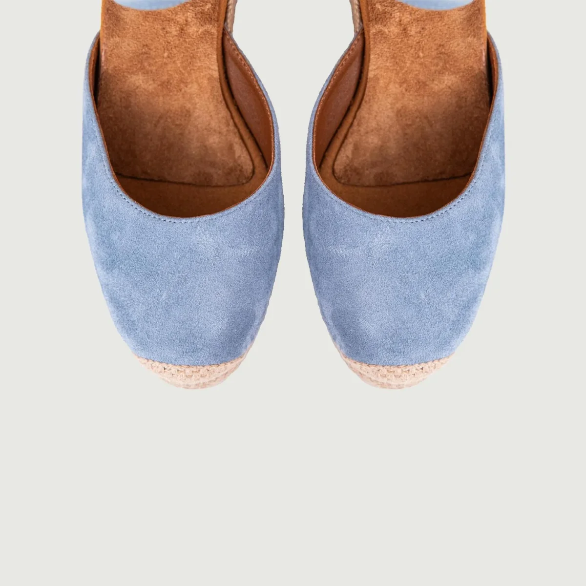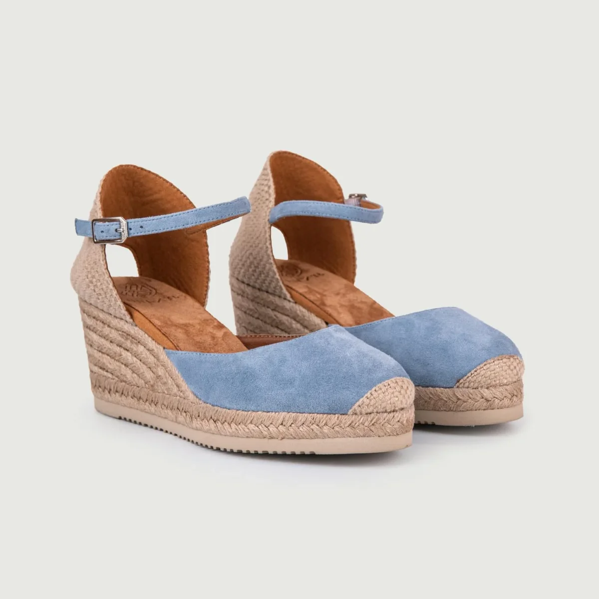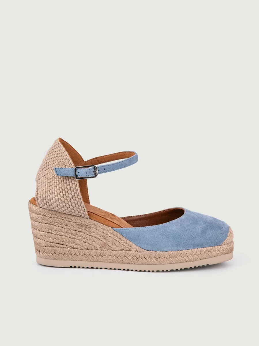 Espadrillas scamosciata con cinturino alla caviglia. Composizione: Tomai e fodera in pelle, suola in gomma e zeppa in corda.