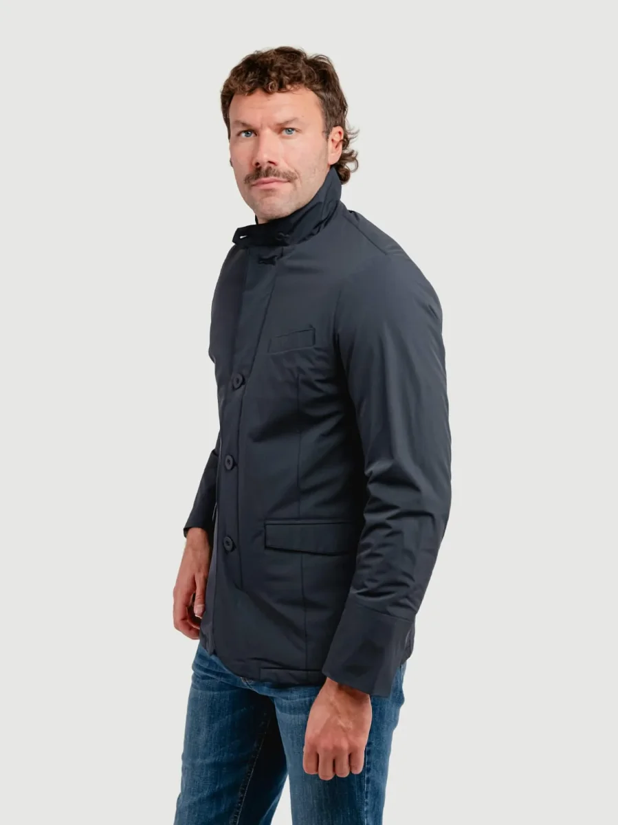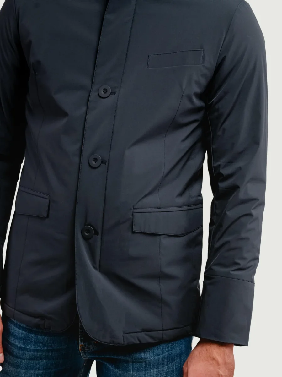 Costruzione a giacca con chiusura quattro bottoni in tonalità e zip.