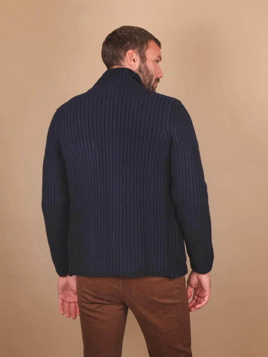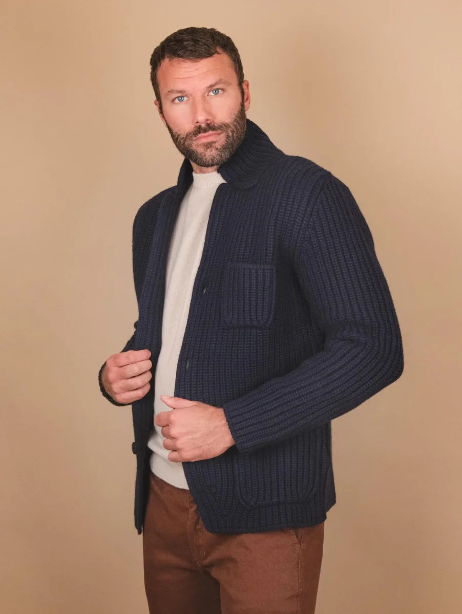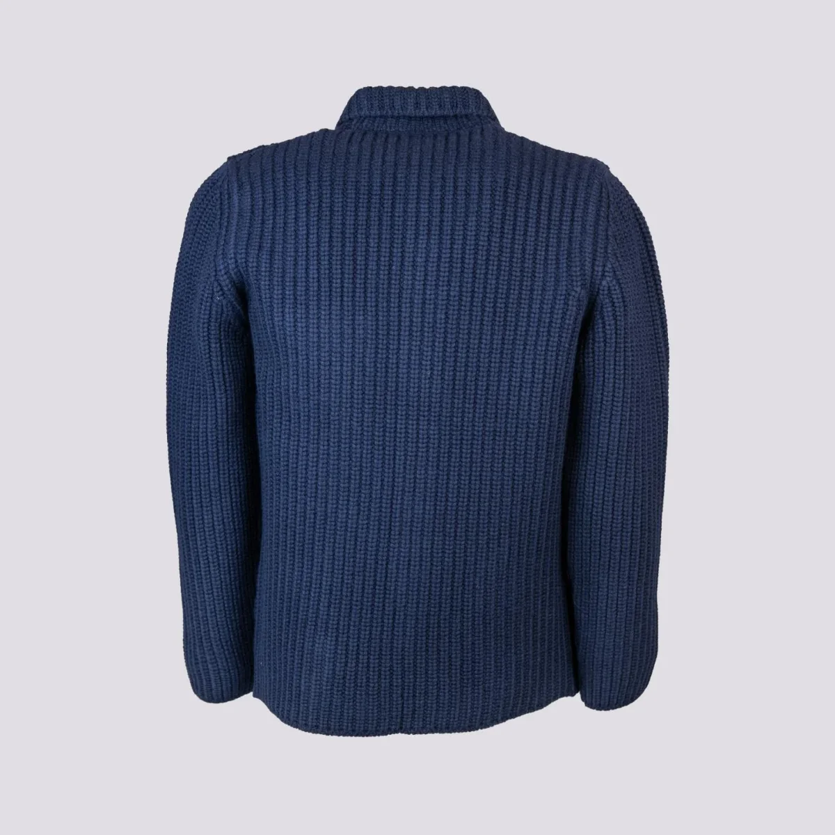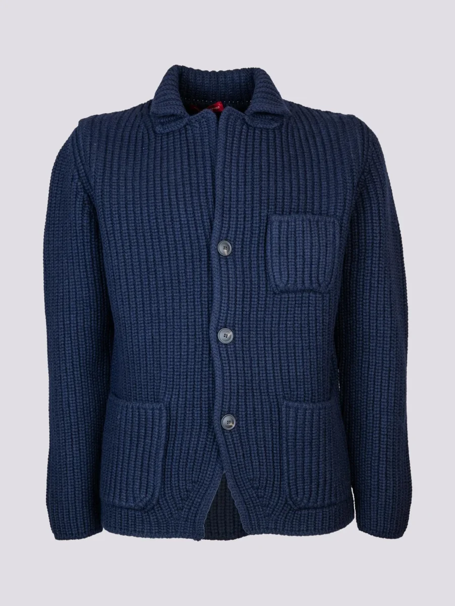 Giacca cardigan in lana vergine blu. Un capospalla di estrema qualità diverso dal solito che ti terrà al caldo per tutto l’inverno. Maxi coste su tutto il capo. Chiusura a bottoni frontale., Doppia tasca applicata frontale. Taschino porta cellulare sulla parte superiore del capo. Collo spesso. Peso abbondante. Vestibilità morbida.