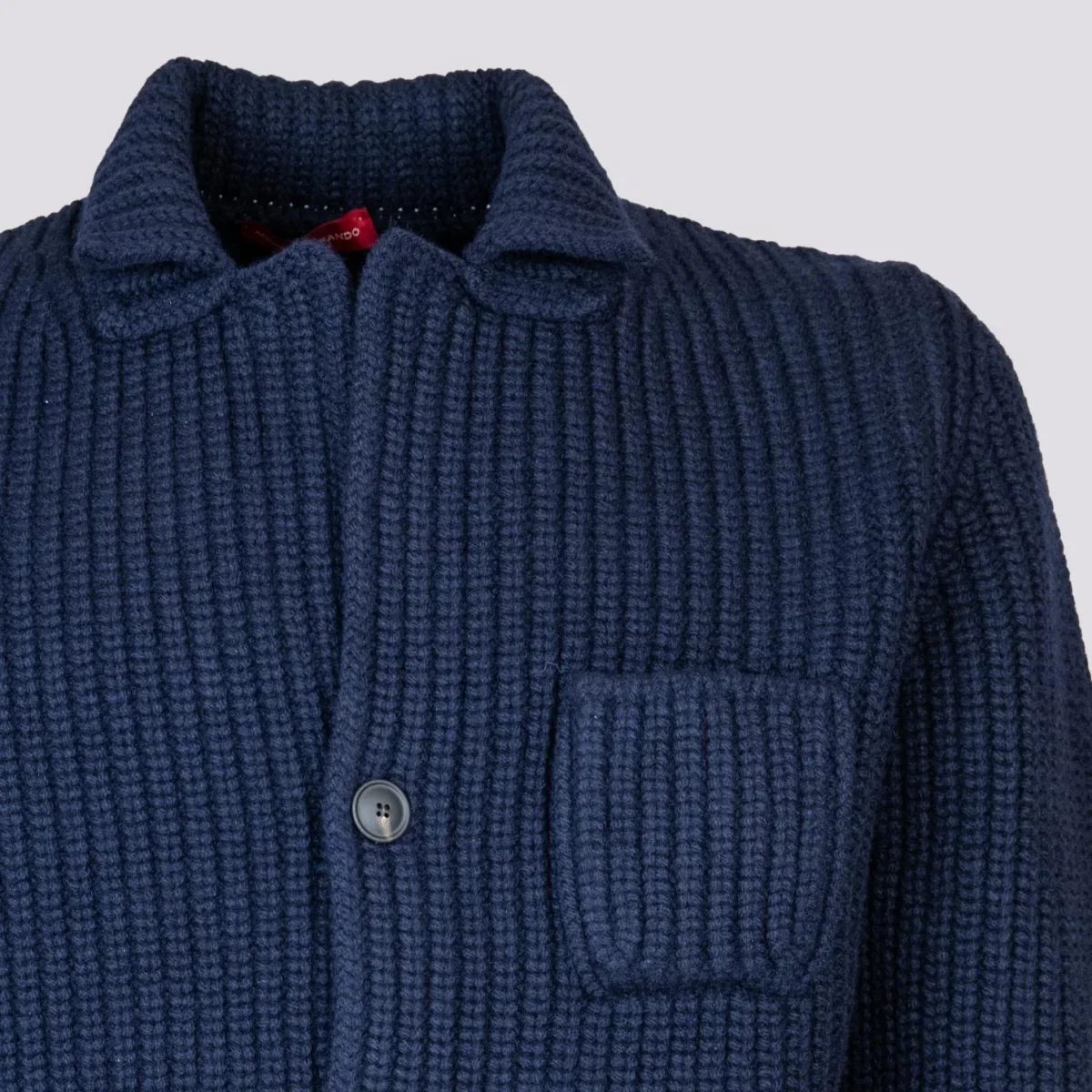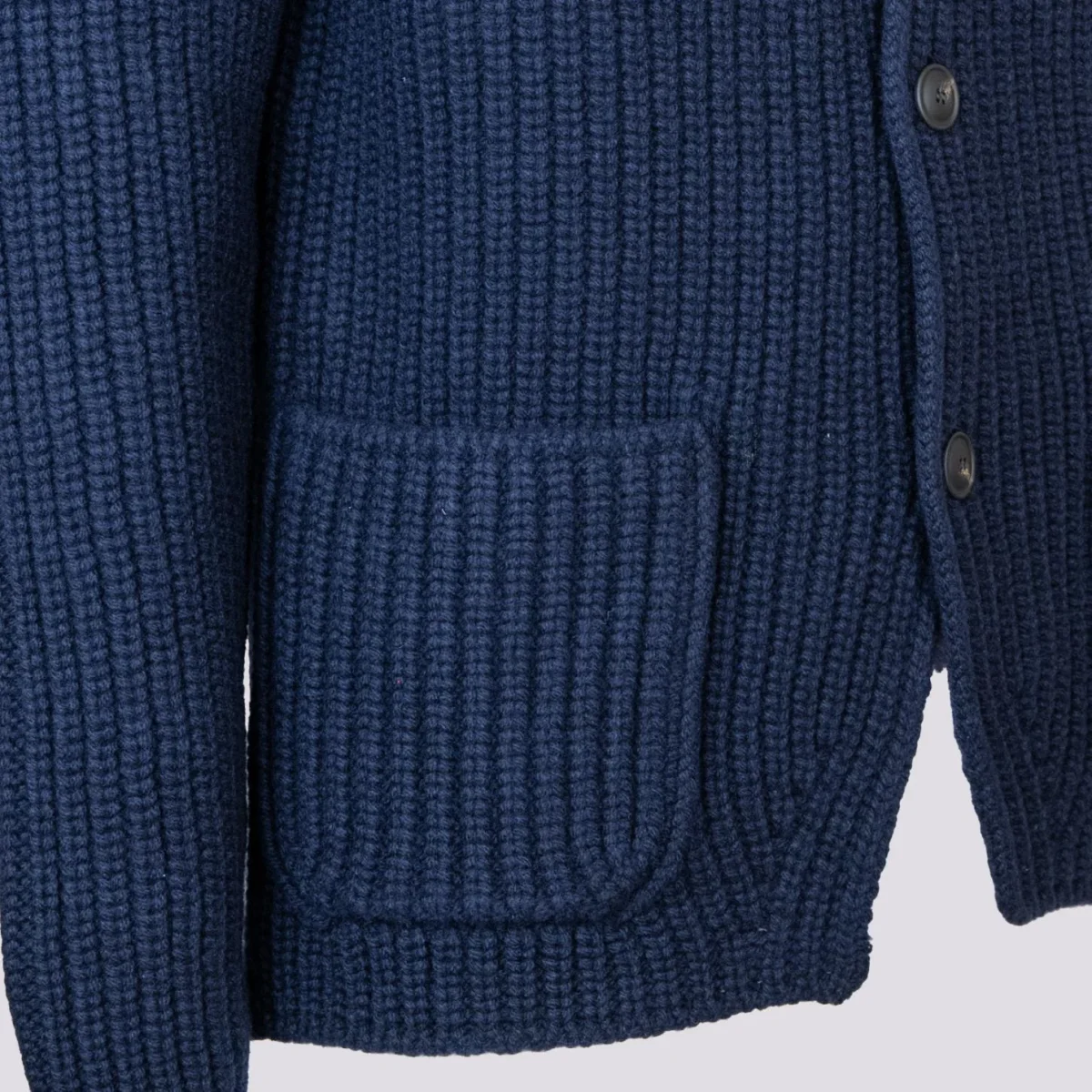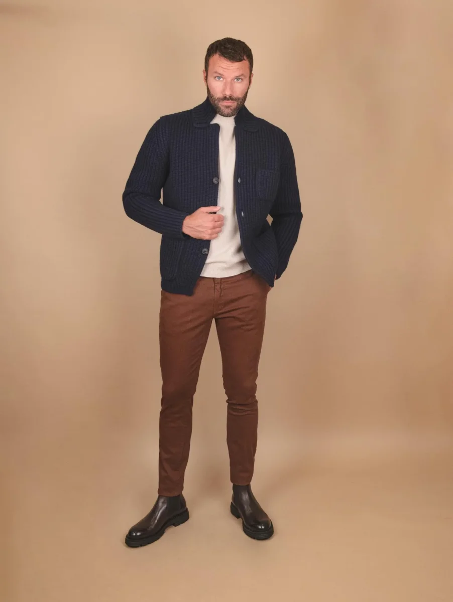 Giacca cardigan in lana vergine blu. Un capospalla di estrema qualità diverso dal solito che ti terrà al caldo per tutto l’inverno. Maxi coste su tutto il capo. Chiusura a bottoni frontale., Doppia tasca applicata frontale. Taschino porta cellulare sulla parte superiore del capo. Collo spesso. Peso abbondante. Vestibilità morbida.