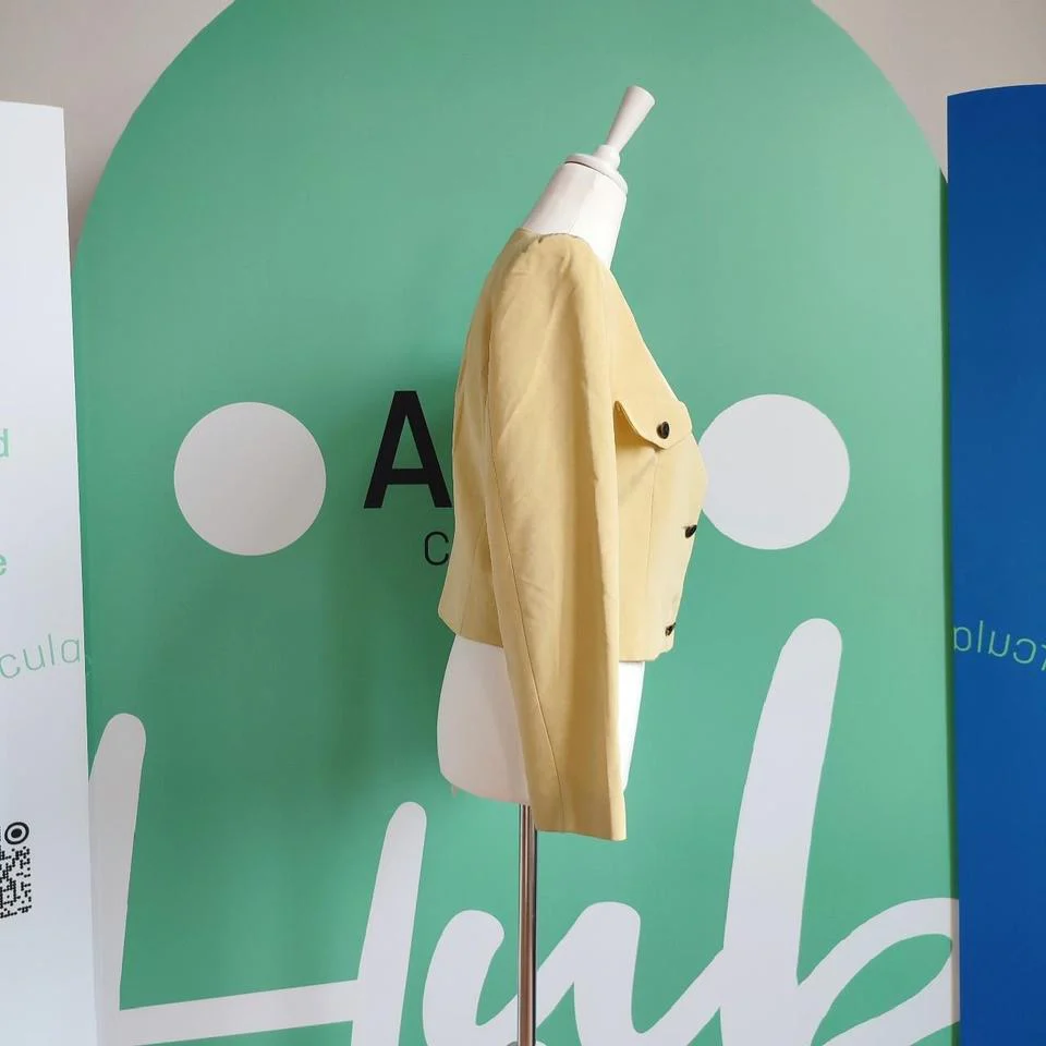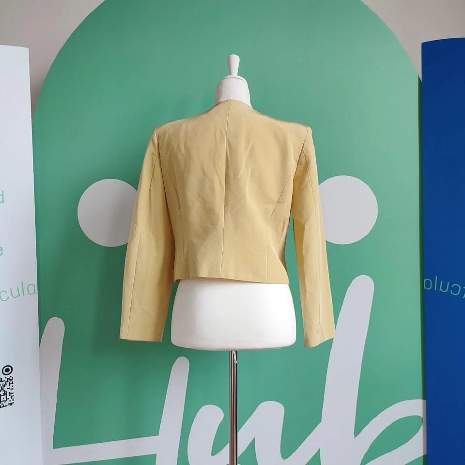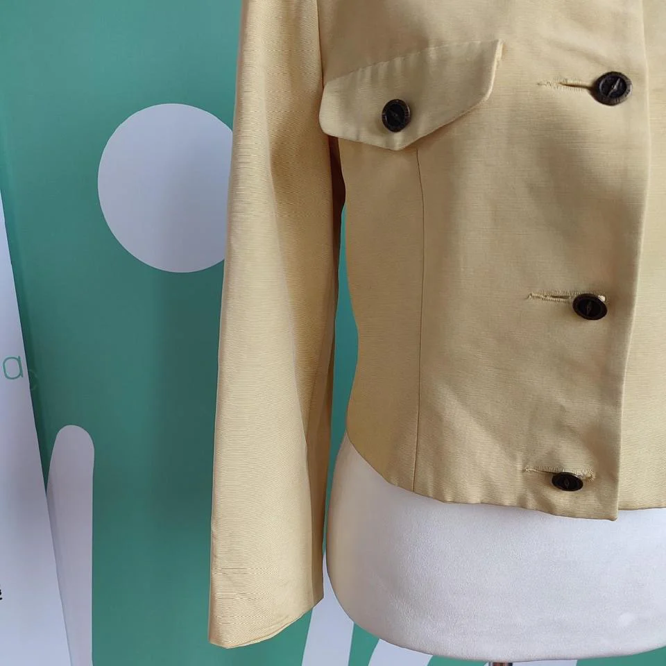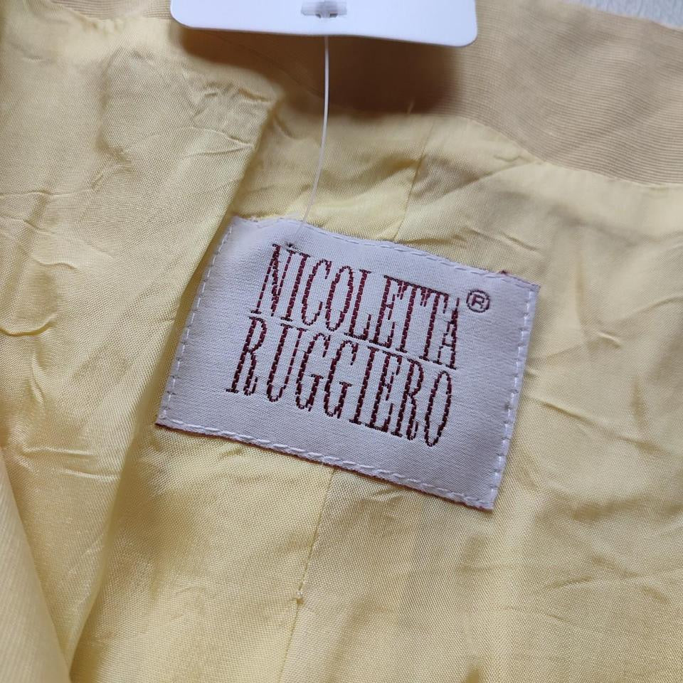 Giacca vintage, Nicoletta Ruggiero, tg M, colore giallo limone. Presenta spalline, chiusura con tre bottoni, ne manca uno come da foto, due finti taschini chiusi cuciti. Etichetta di composizione non presente ma al tatto il tessuto appare viscosa. Buone condizioni