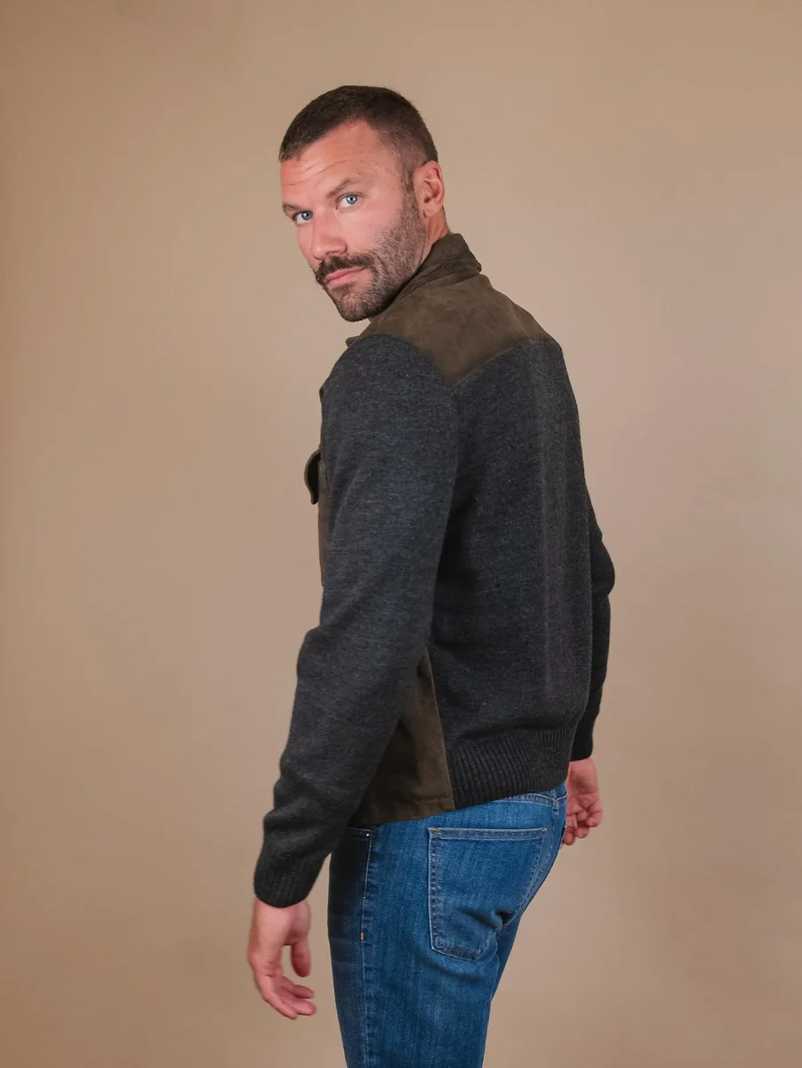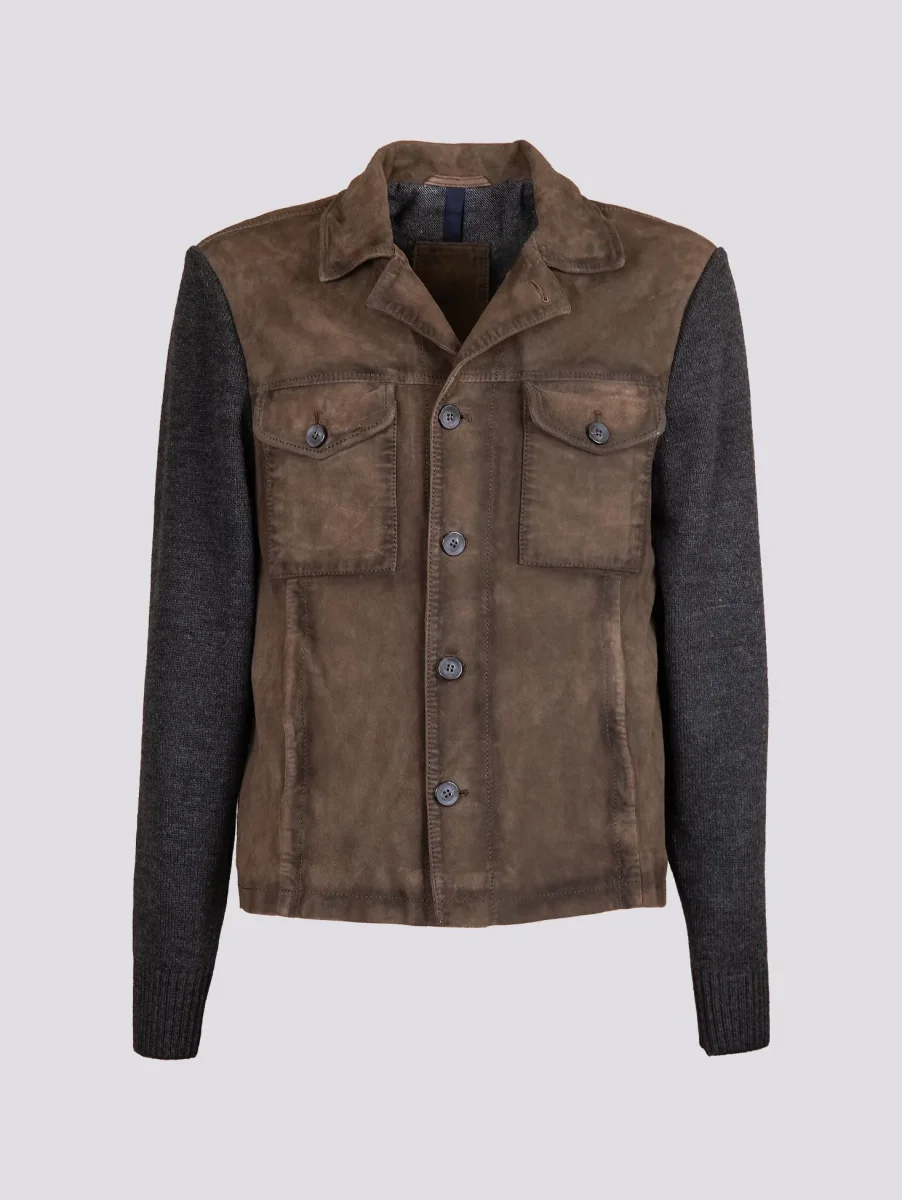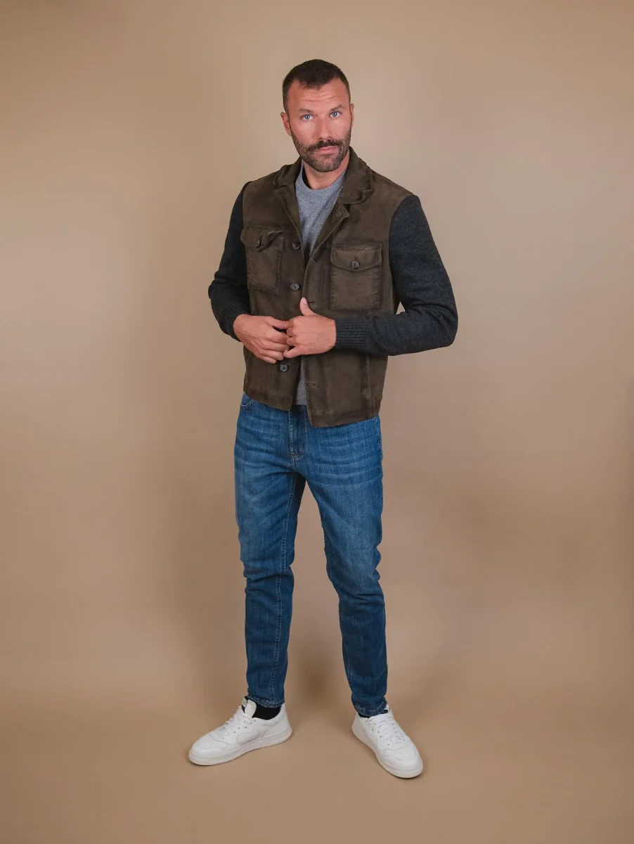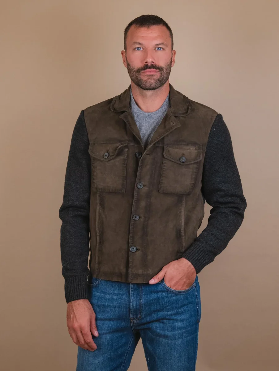Giacca in camoscio verde muschio e maglia grigia “Samu”. Chiusura a bottoni. La parte frontale del capo ha inserti in pelle camoscio, mentre il retro e le maniche sono realizzati in maglia con i polsini e il fondo elasticizzati rendendolo così più avvolgente e casual. Questo giubbotto fa parte della collezione knits and leather che unisce il comfort della maglieria con il gusto intramontabile dei capi in vera pelle. Viene realizzato con il materiale suede che conferisce brillantezza e morbidezza uniche al capo. Ideale per l’inverno poiché fonde concetti eterogenei in un armonico connubio di pelli e filati reinventando i must del classico maschile. Vestibilità slim. Peso medio.