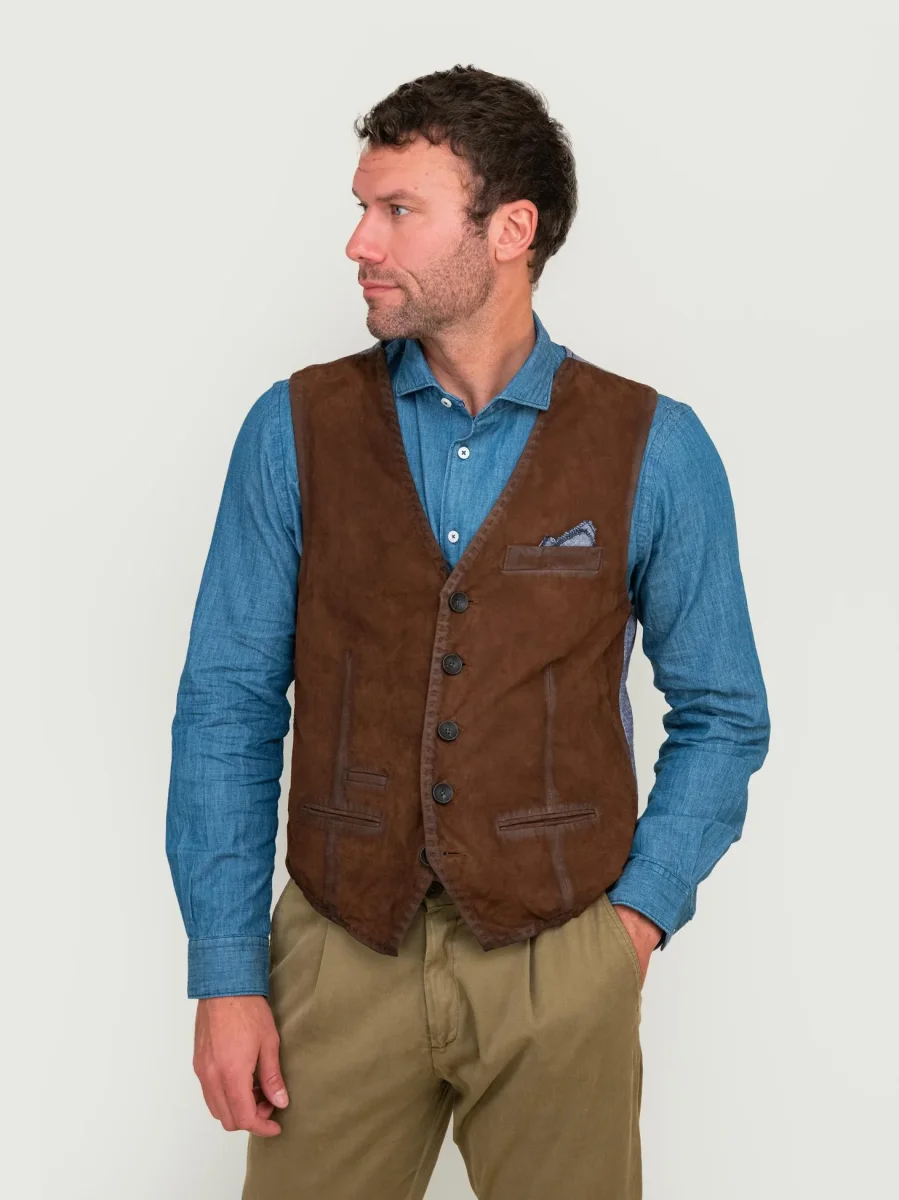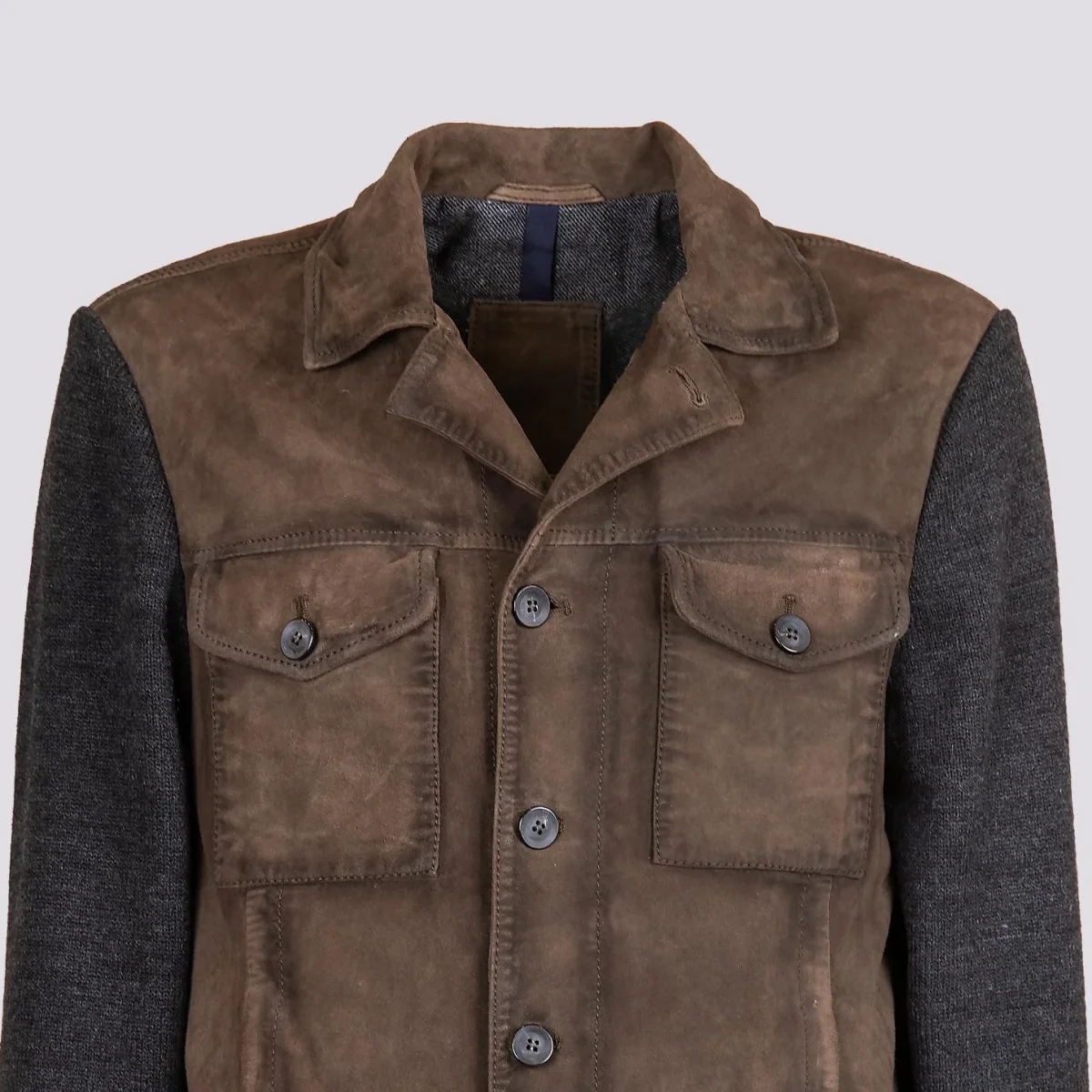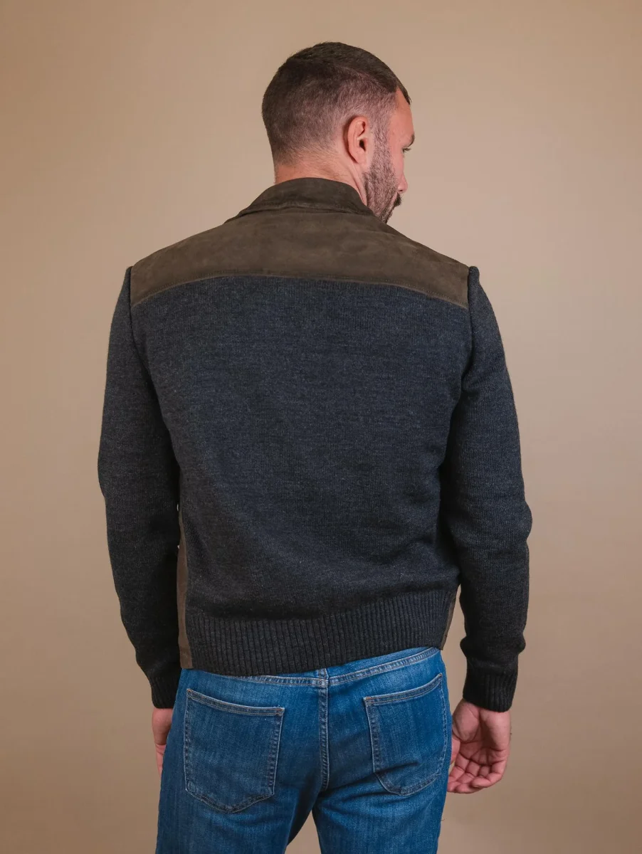 Giacca in camoscio verde muschio e maglia grigia “Samu”. Chiusura a bottoni. La parte frontale del capo ha inserti in pelle camoscio, mentre il retro e le maniche sono realizzati in maglia con i polsini e il fondo elasticizzati rendendolo così più avvolgente e casual. Questo giubbotto fa parte della collezione knits and leather che unisce il comfort della maglieria con il gusto intramontabile dei capi in vera pelle. Viene realizzato con il materiale suede che conferisce brillantezza e morbidezza uniche al capo. Ideale per l’inverno poiché fonde concetti eterogenei in un armonico connubio di pelli e filati reinventando i must del classico maschile. Vestibilità slim. Peso medio.