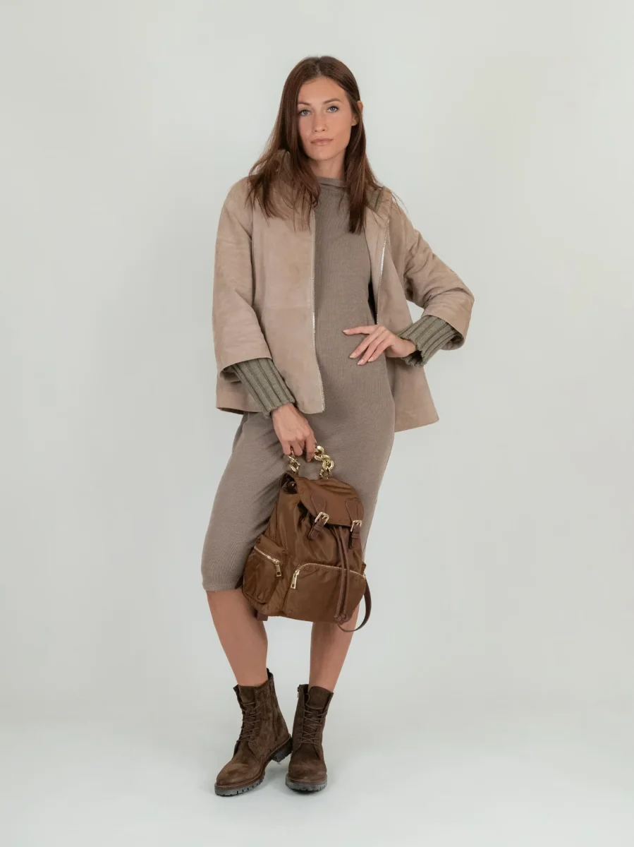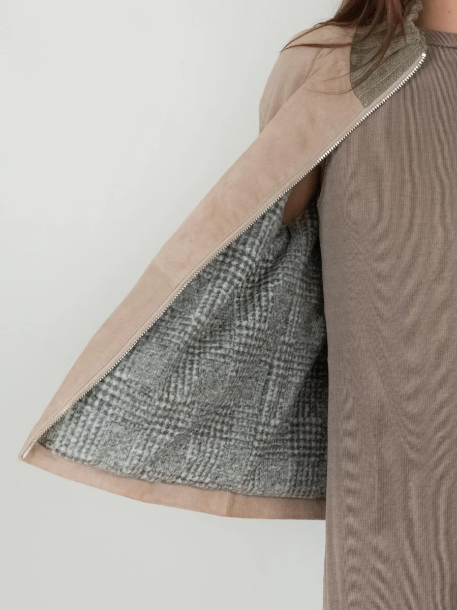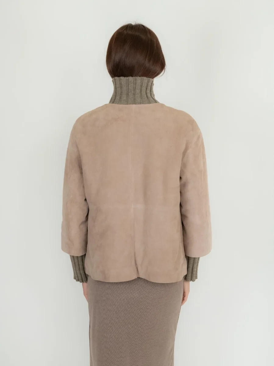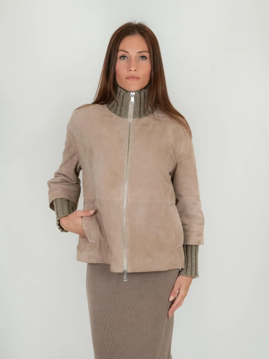 Giacca in pelle scamosciata beige con inserti in tessuto a coste.