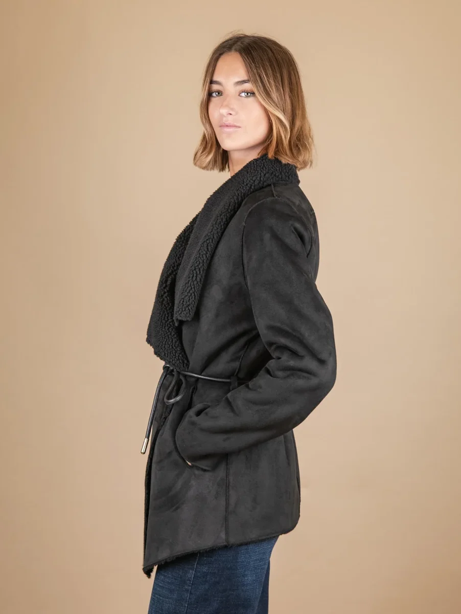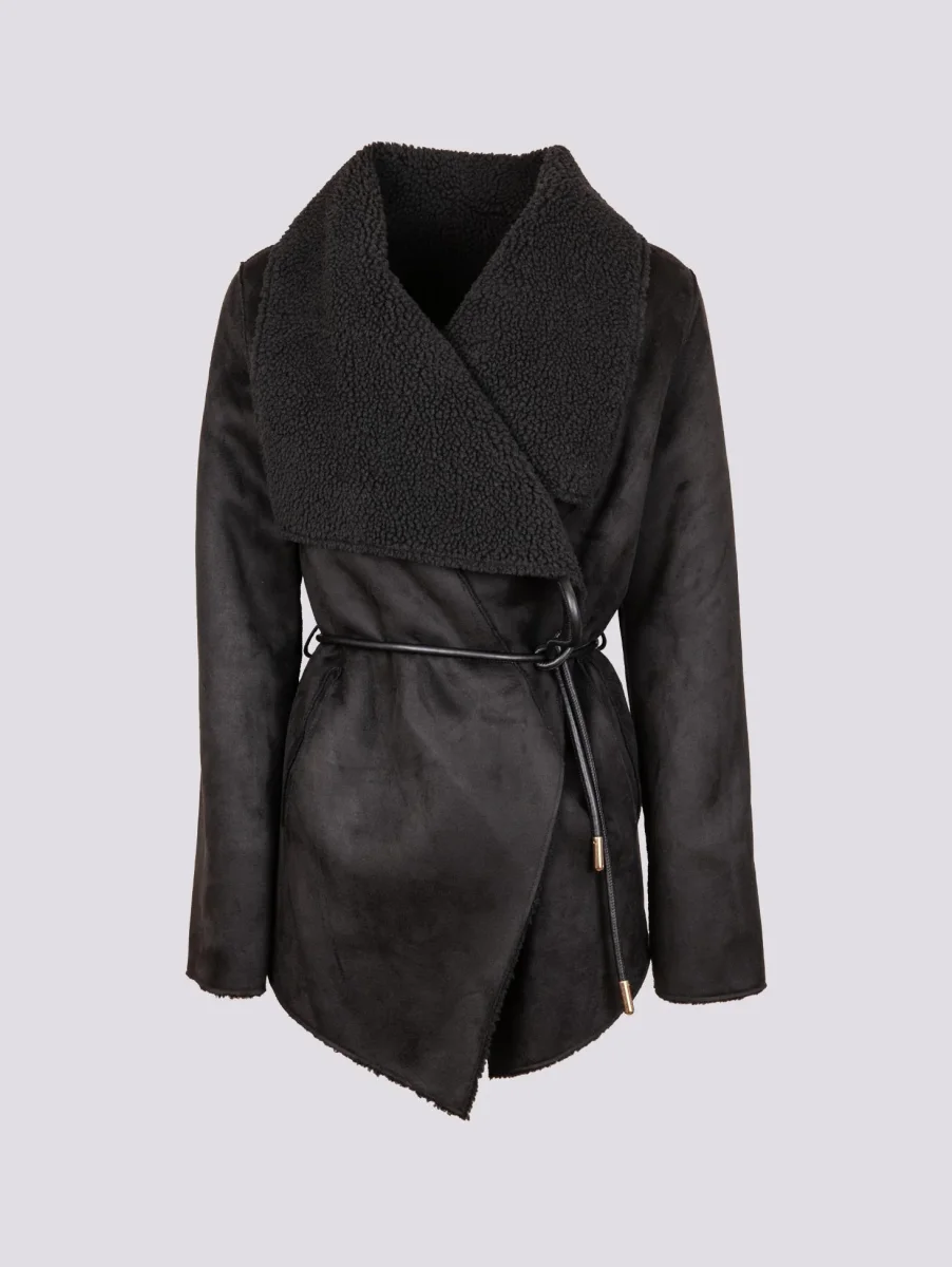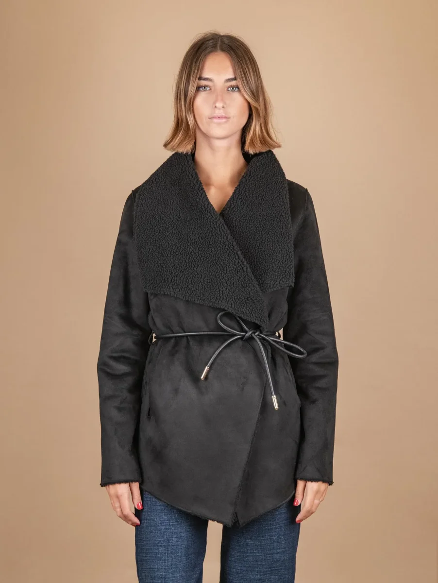 Giacca kimono in eco-montone nero e teddy. La parte esterna è in eco-montone mentre quella interna è tutta in teddy. Chiusura a portafoglio frontale con laccio in pelle con profili in metallo dorati. Profili leggermente sfrangiati. Vestibilità morbida. Peso medio. Composizione: pelliccia sintetica. Lavare sempre a secco.