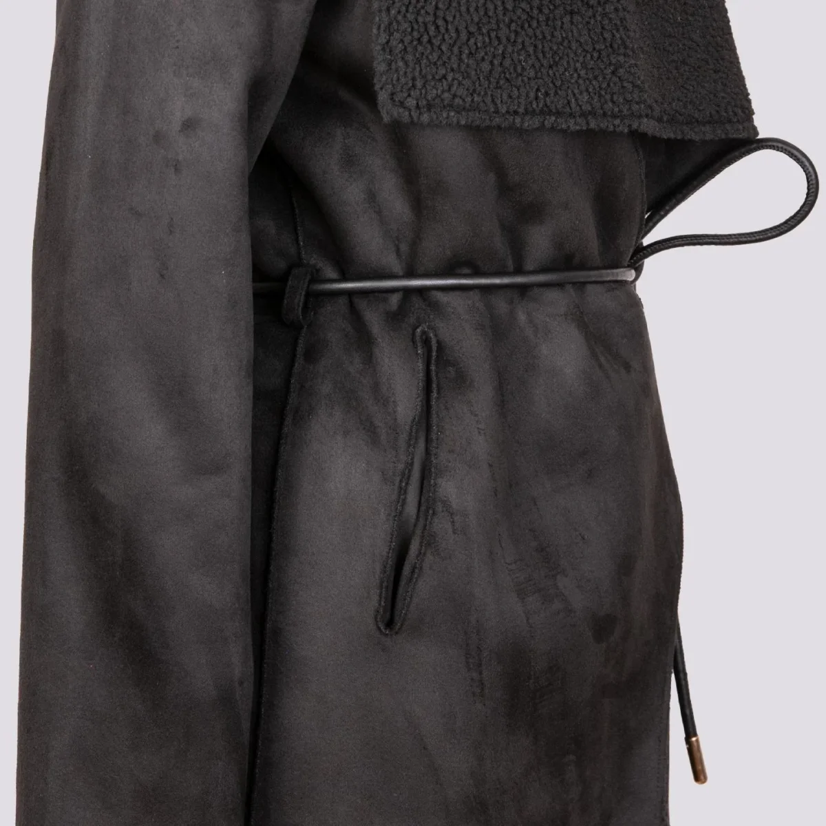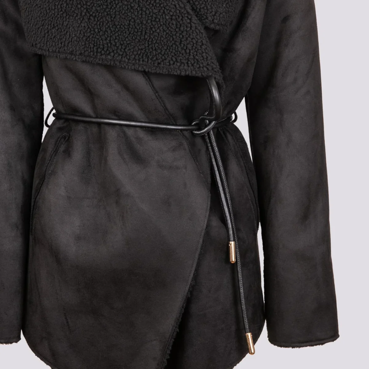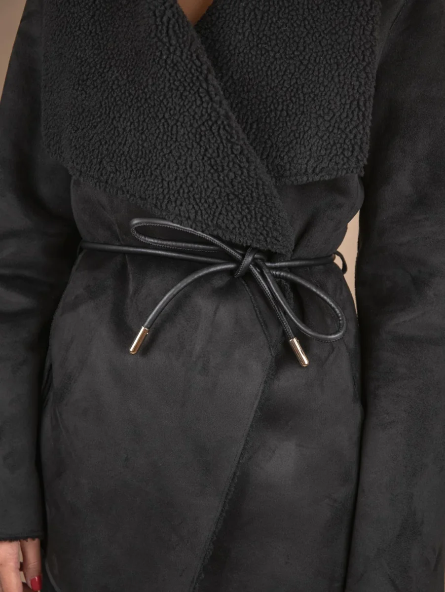 Giacca kimono in eco-montone nero e teddy. La parte esterna è in eco-montone mentre quella interna è tutta in teddy. Chiusura a portafoglio frontale con laccio in pelle con profili in metallo dorati. Profili leggermente sfrangiati. Vestibilità morbida. Peso medio. Composizione: pelliccia sintetica. Lavare sempre a secco.