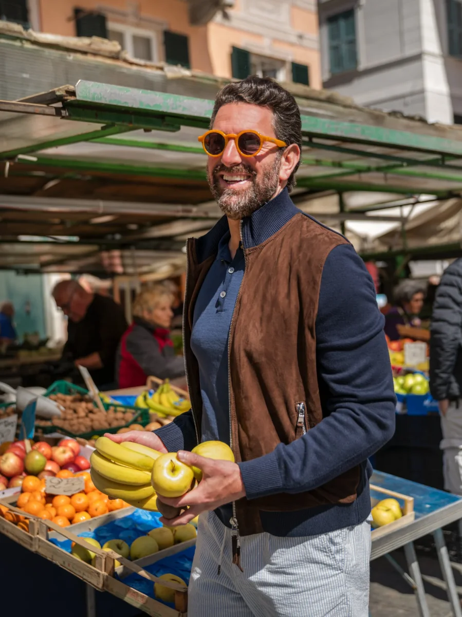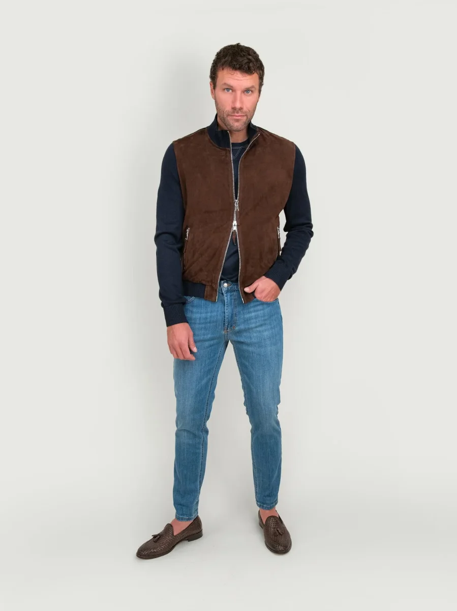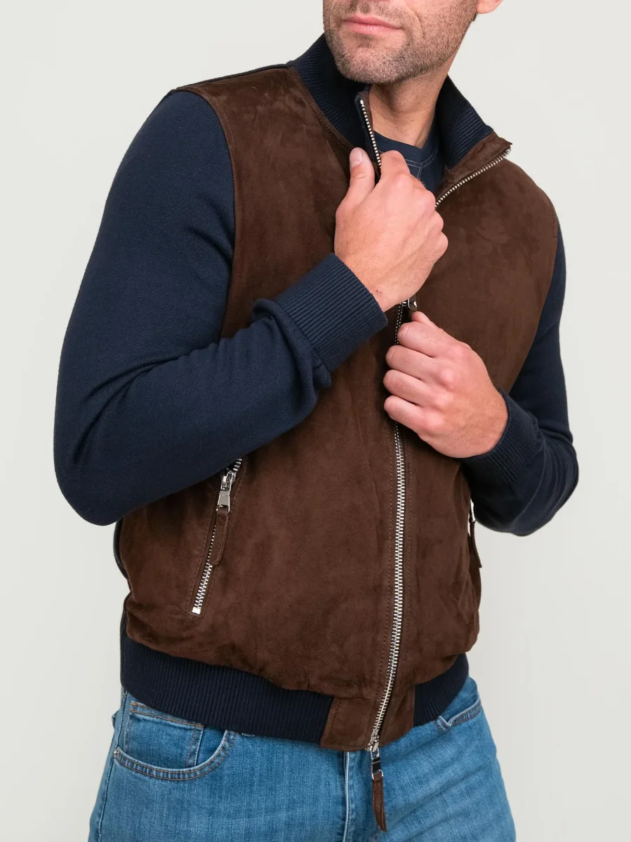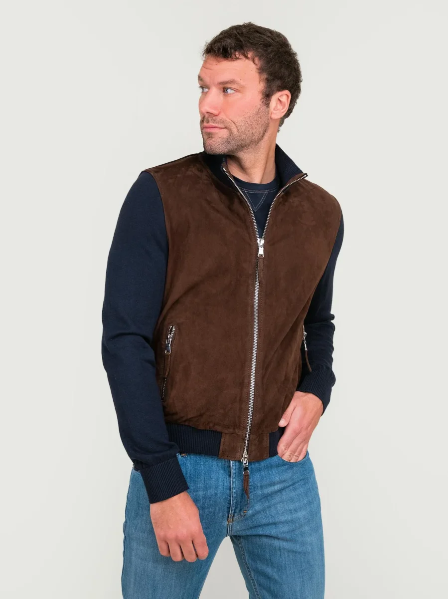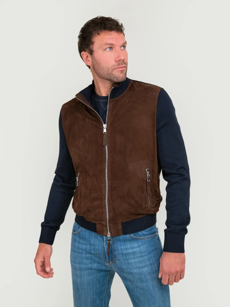 Giacca leggera in pelle scamosciata e maniche di maglia.
