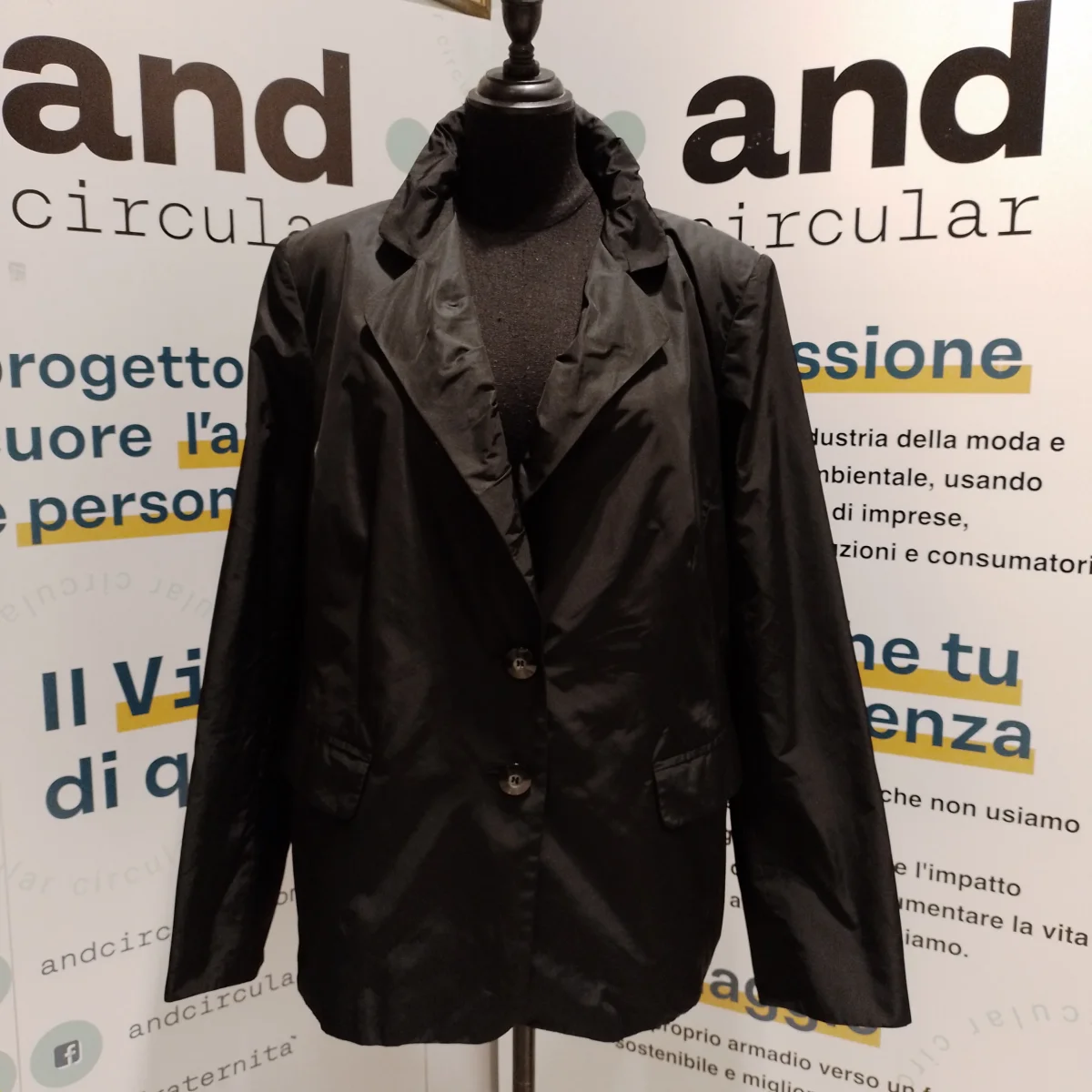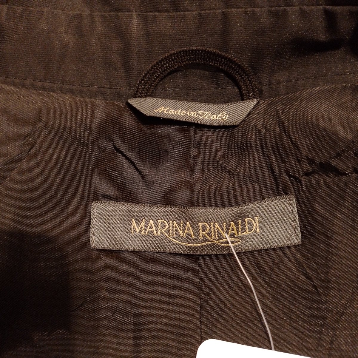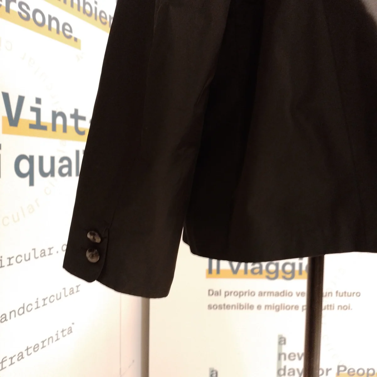Giacca da donna Marca Marina Rinaldi. Tg. 25. Tessuto esterno 100% Poliestere mentre la Fodera è 60% Acetato 40% Viscosa. Colore nero. Il modello è classico , le spalle leggermente imbottite ed ha due bei bottoni frontali. Le due tasche a filetto sono complete di pattina. Ma la Stilista ha voluto dare un tocco particolare al rever, che pur essendo classico ha le punte arrotondate ed è montato con una serie di pieghe orizzontali, cucite in parte, per creare volume e soprattutto movimento al collo. Buone condizioni