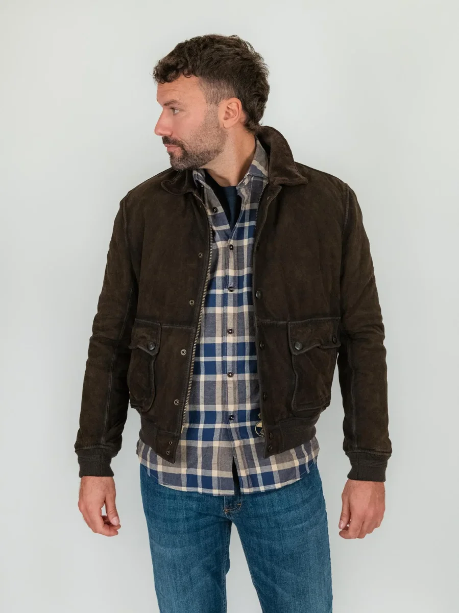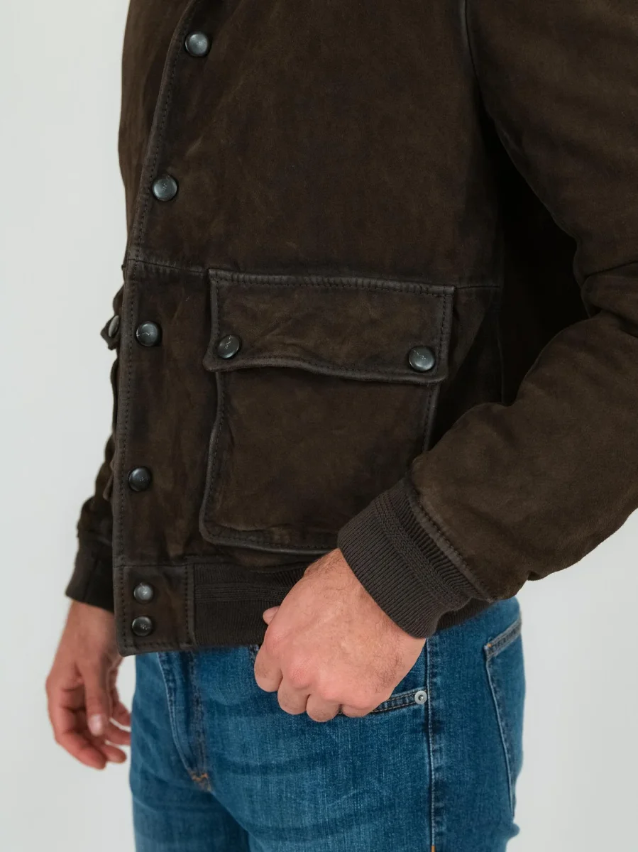 Realizzata con base in suede marrone, con colletto aviatore in velluto a costine in tonalità.