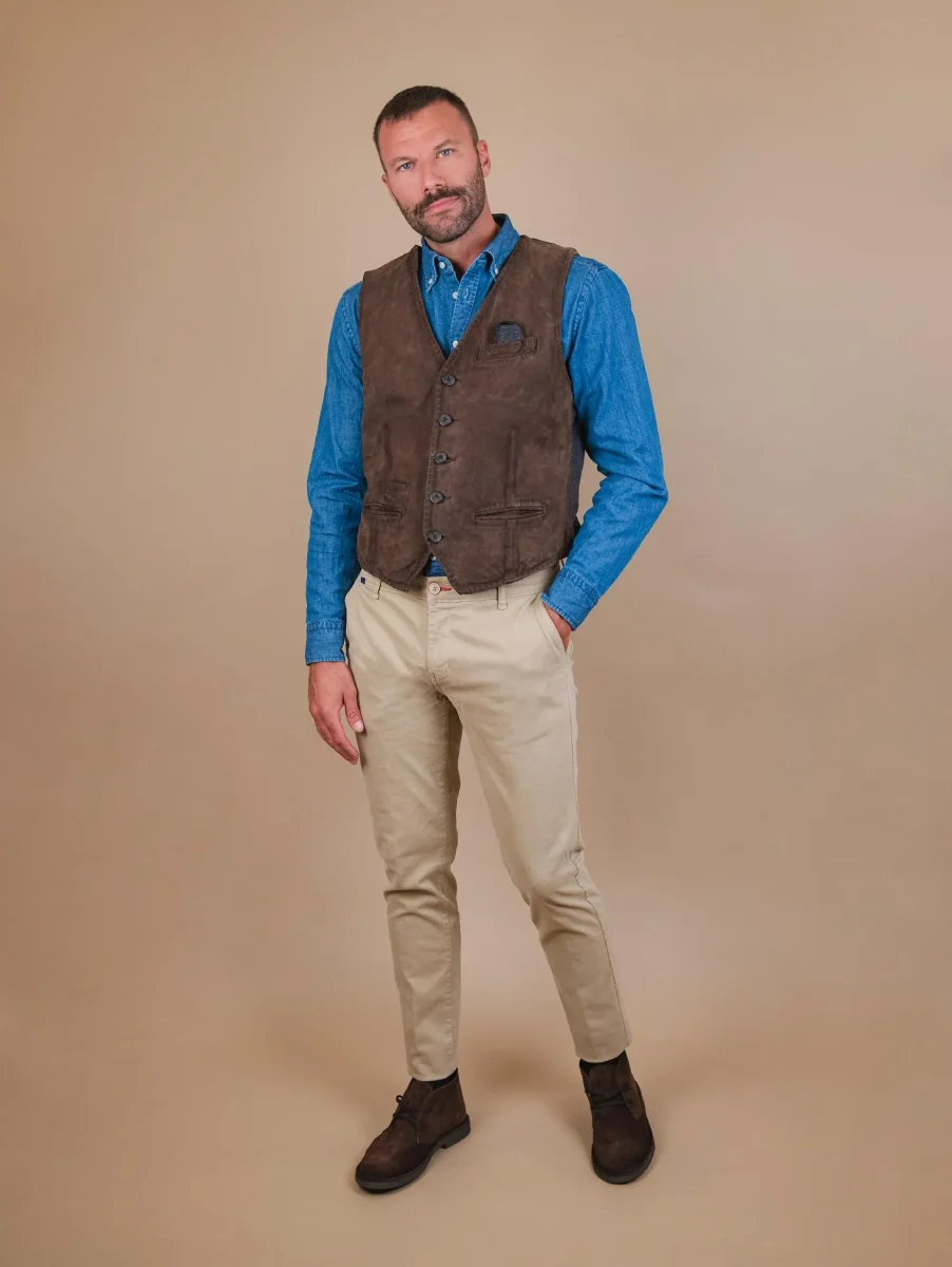 Gilet in camoscio verde militare e maglia con chiusura a bottoni frontale. Un capo perfetto per gli uomini che amano indossare pezzi ricercati e fuori dagli schemi. Dotato di doppia tasca frontale, taschino porta fazzoletto all’altezza del petto, la parte frontale del gilet è interamente realizzata in materiale burned suede ovvero pregiata pelle camoscio mentre il retro in maglia leggermente elasticizzato avvolge tutta la schiena e conferisce maggiore comodità al capo. Questo gilet è ottimo per le stagioni autunnali e invernali. Lavare solo in centri specializzati. Vestibilità regolare leggermente slim fit. Peso leggero. Composizione frontale: 100% vera pelle. Composizione posteriore: 60% lana, 35% poliestere, 5% altre fibre.