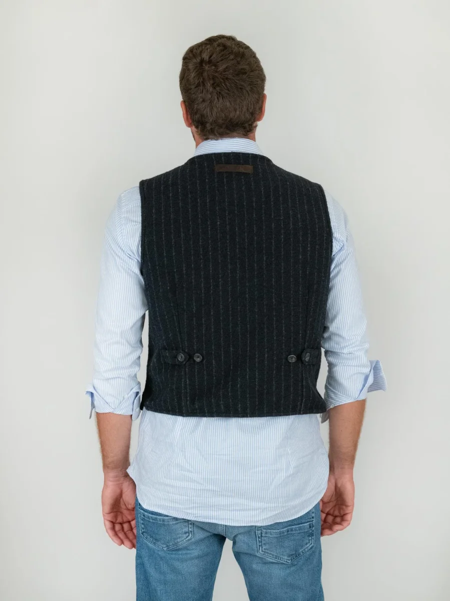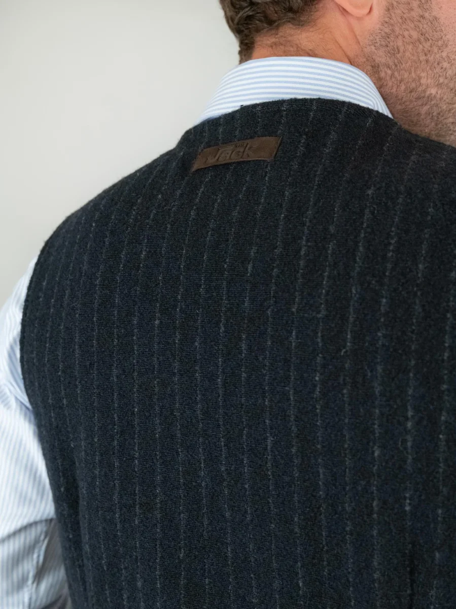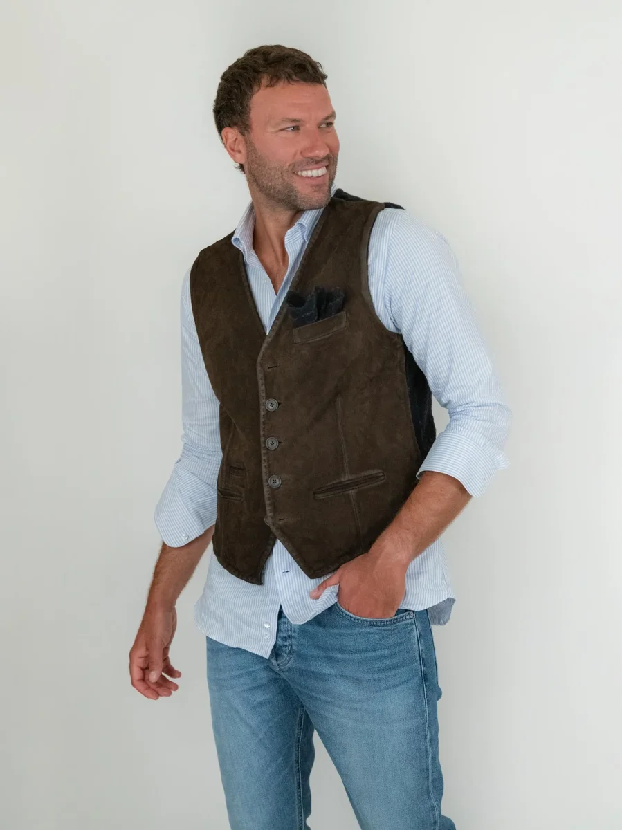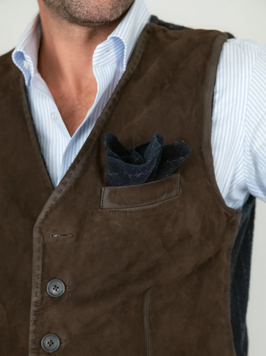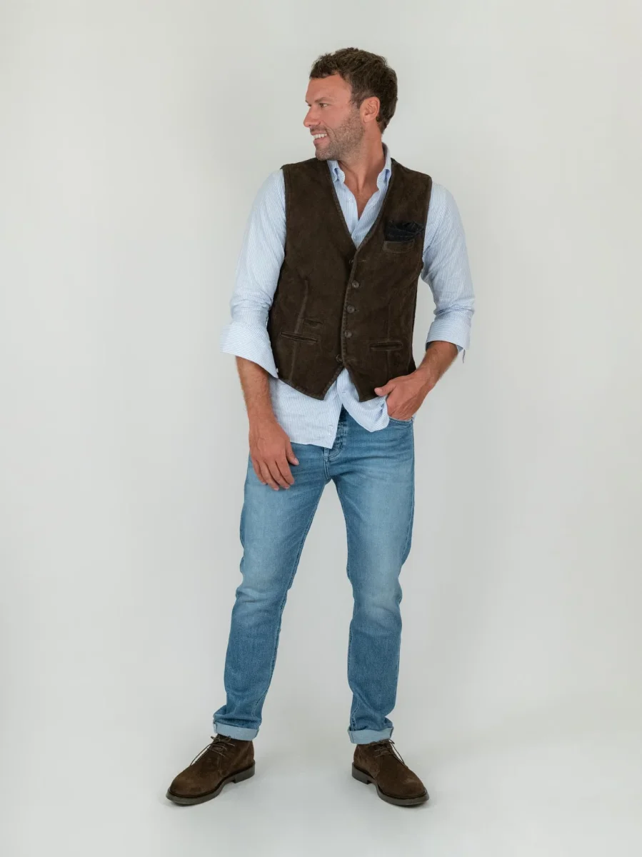 Gilet in camoscio marrone e tessuto posteriore gessato.