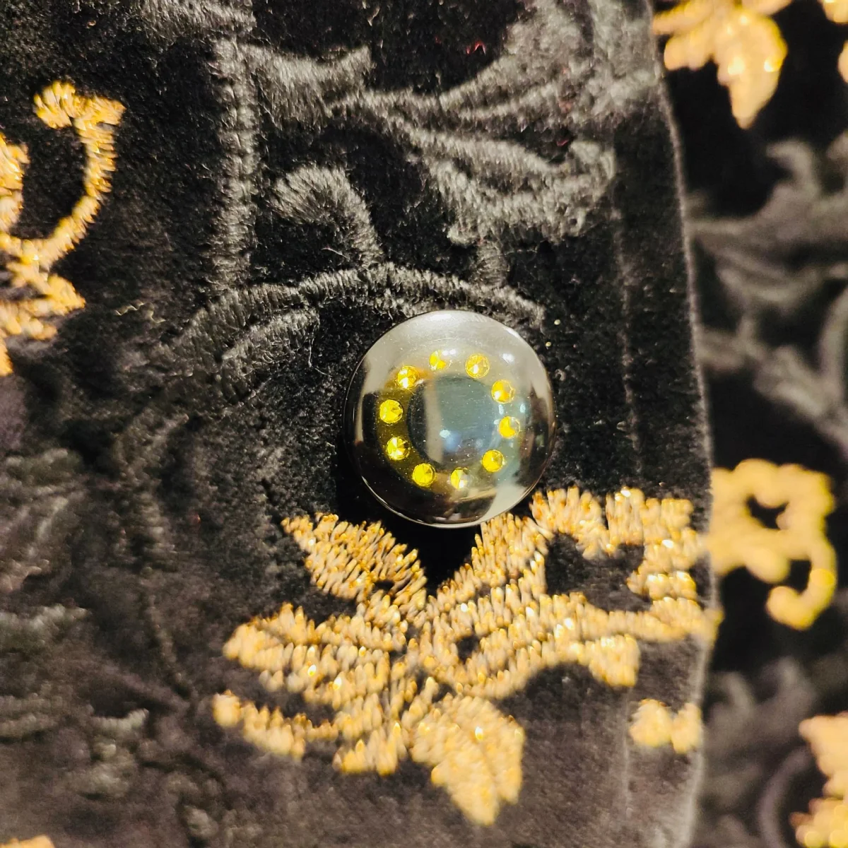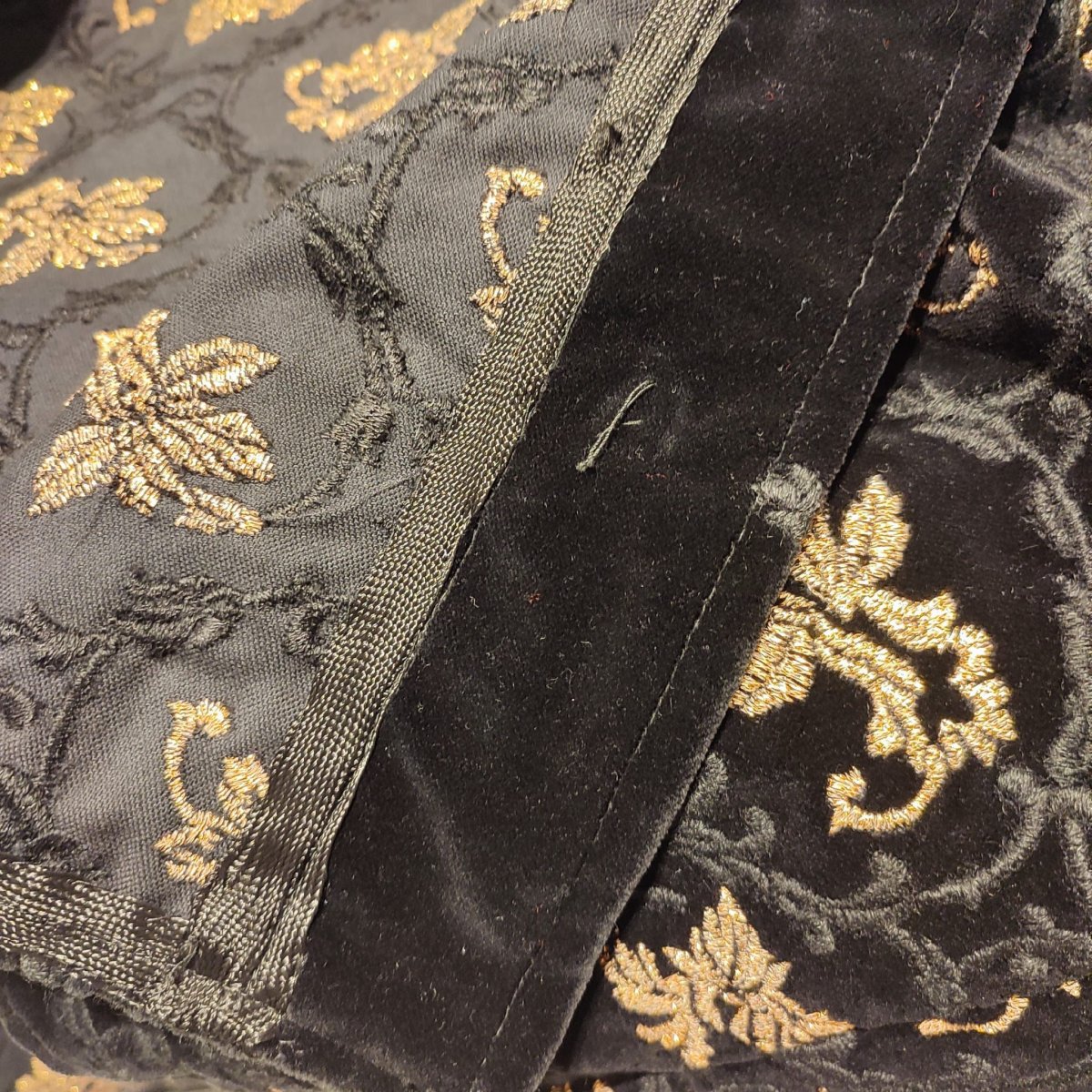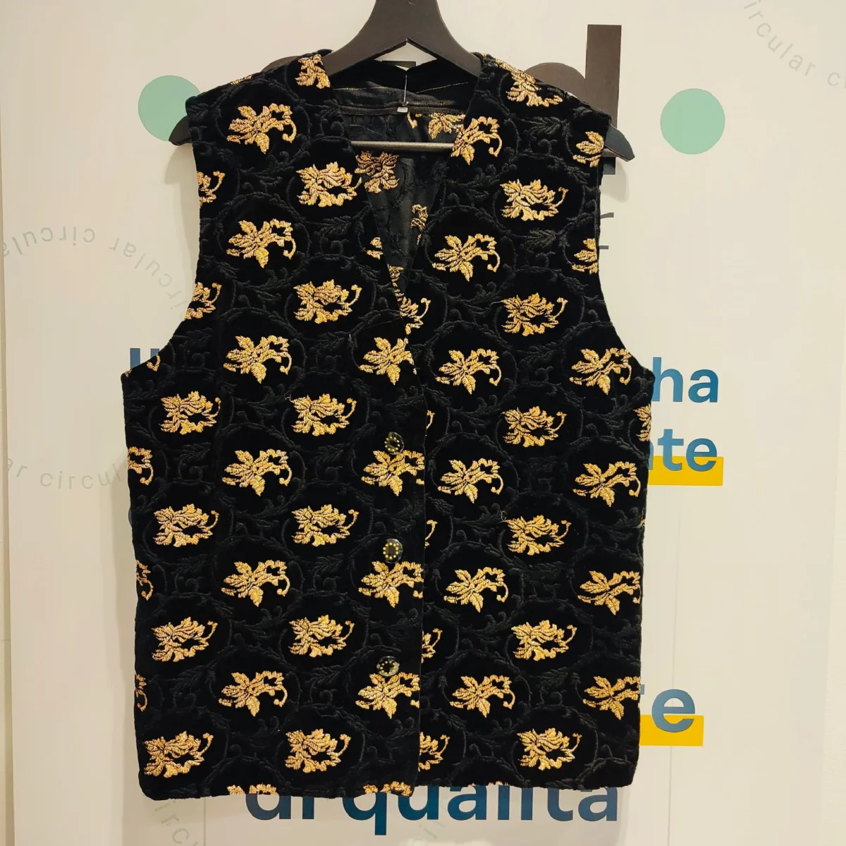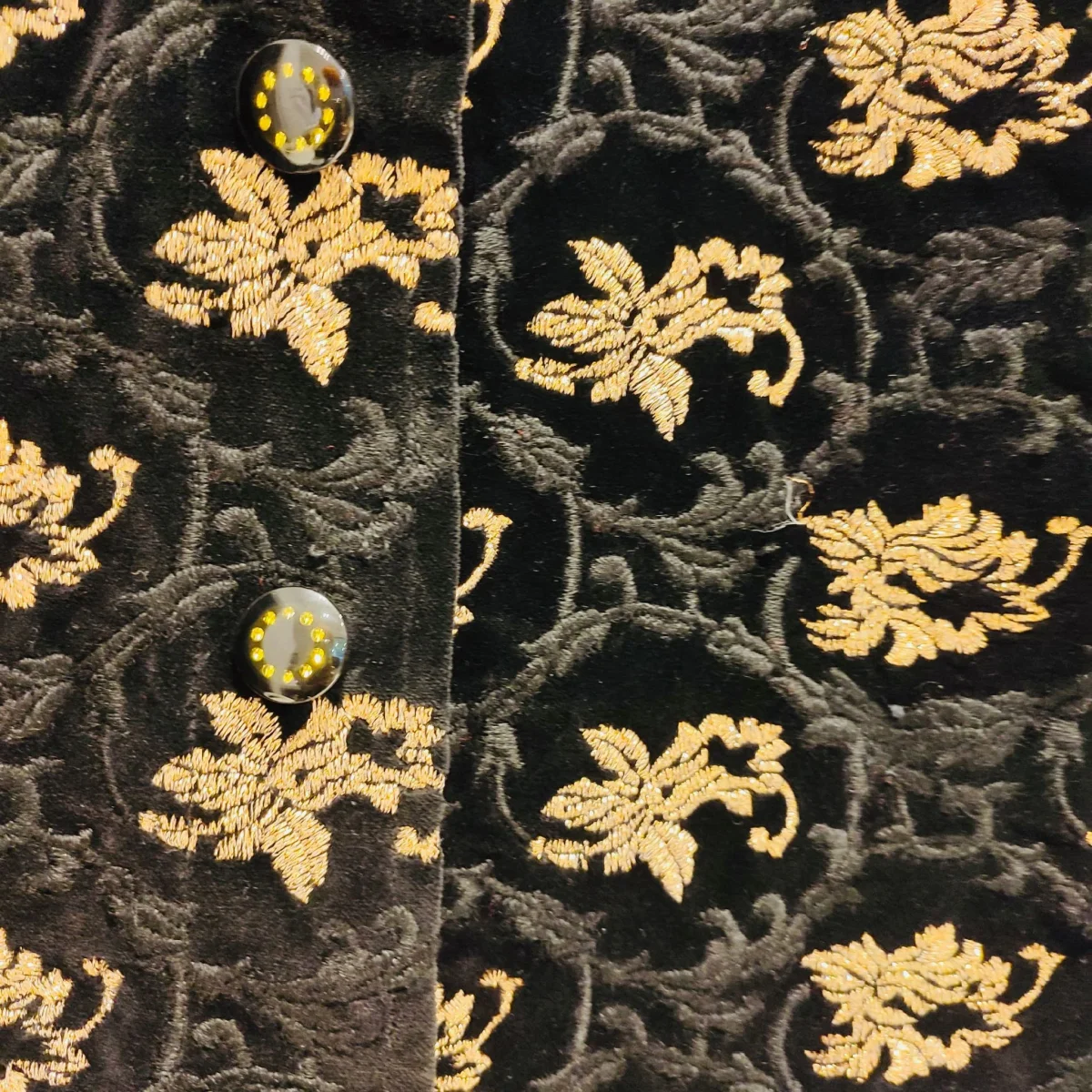 Gilet vintage sartoriale in in velluto nero con ricami floreali dorati. Chiusura con 3 bottoni neri con piccoli strass. Non presenta etichette ma taglia presunta 46. Condizioni vintage molto buone.