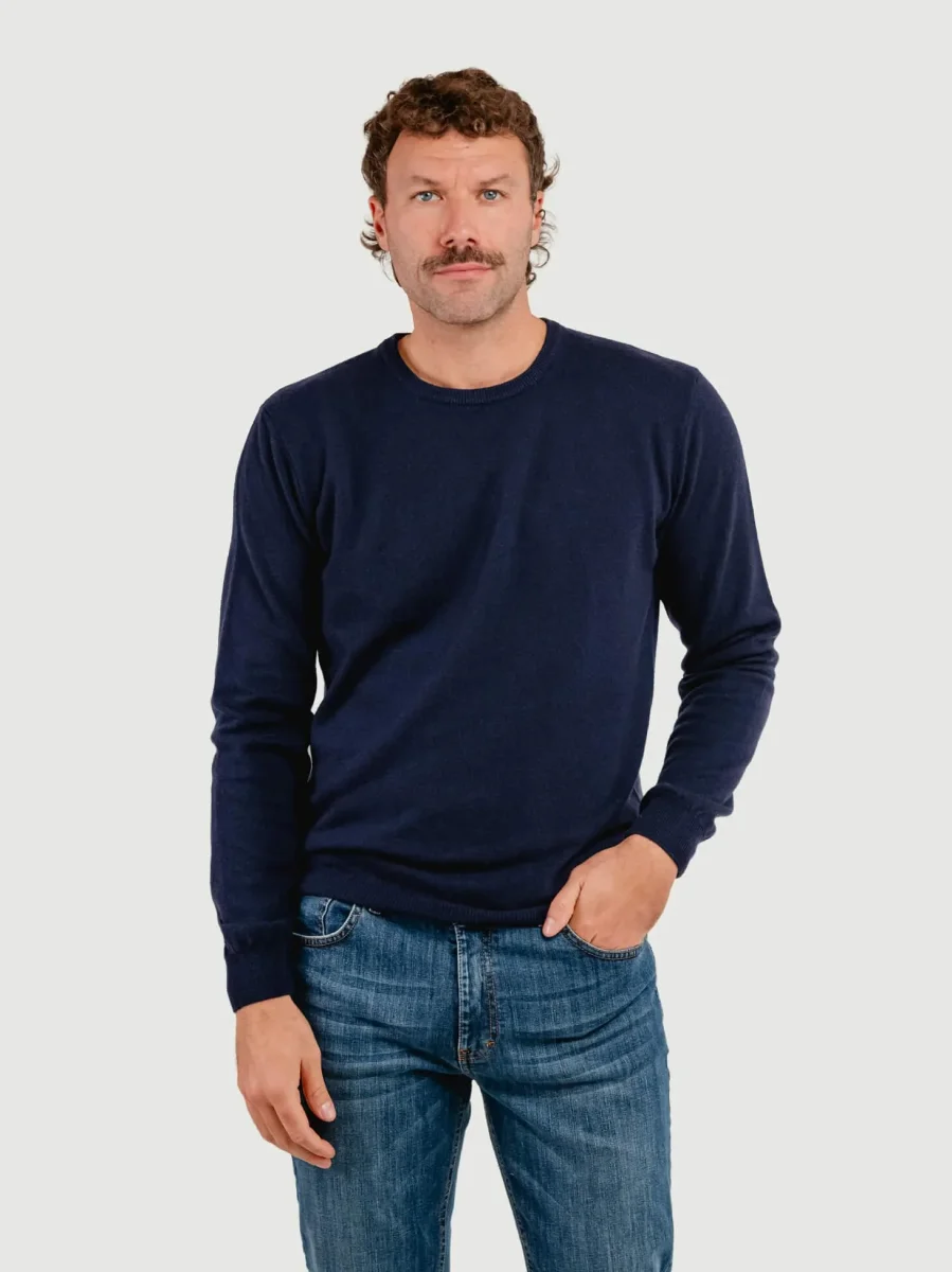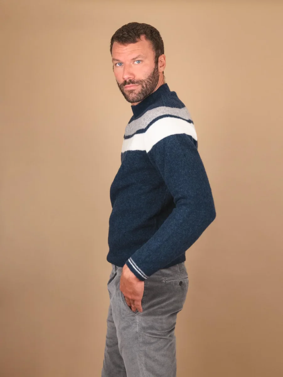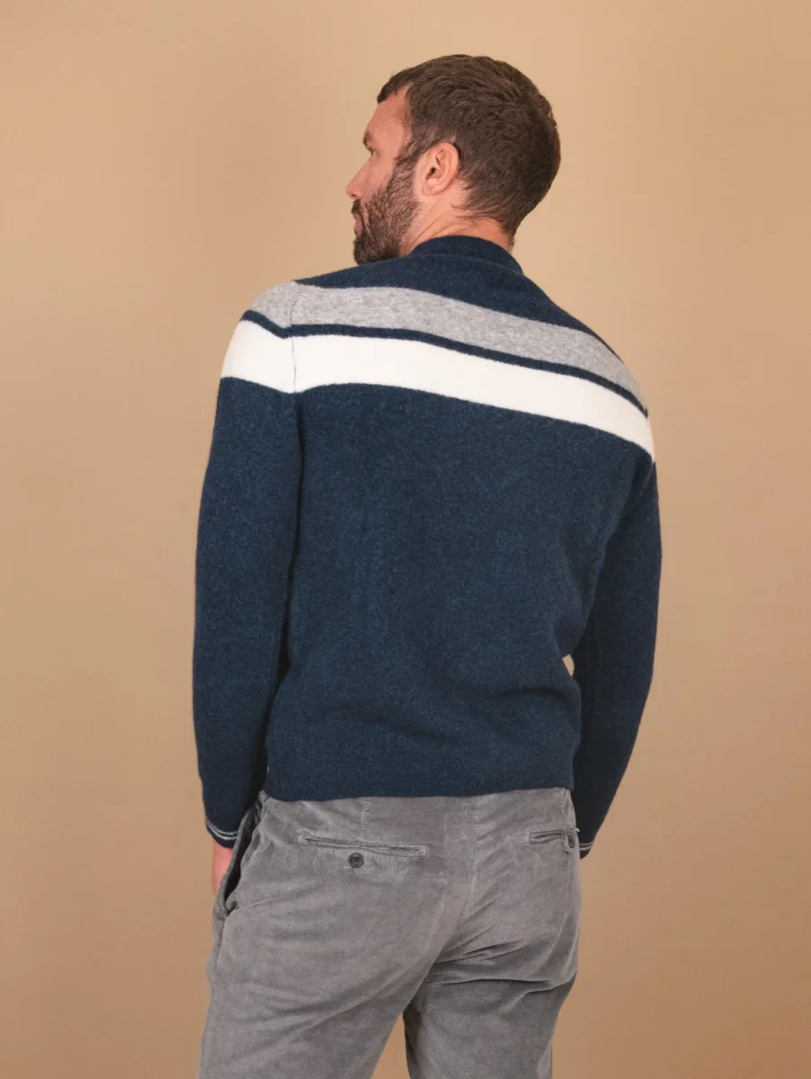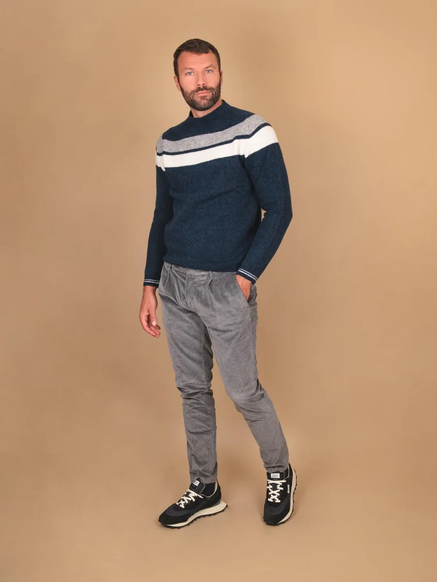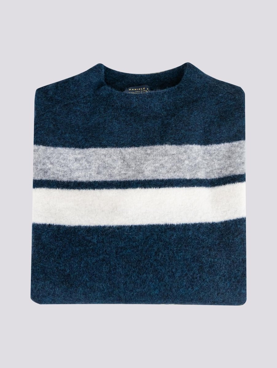 Girocollo blu notte in lana merino effetto lana cotta. La particolarià del capo consiste nella lavorazione del materiale utilizzato e nel collo realizzato a taglio vivo. Profili a costine. Maxi riga panna e grigio scuro sulla parte alta del capo. Tessuto elasticizzato, Vestibilità regolare tendenzialmente morbida. Peso abbondante.