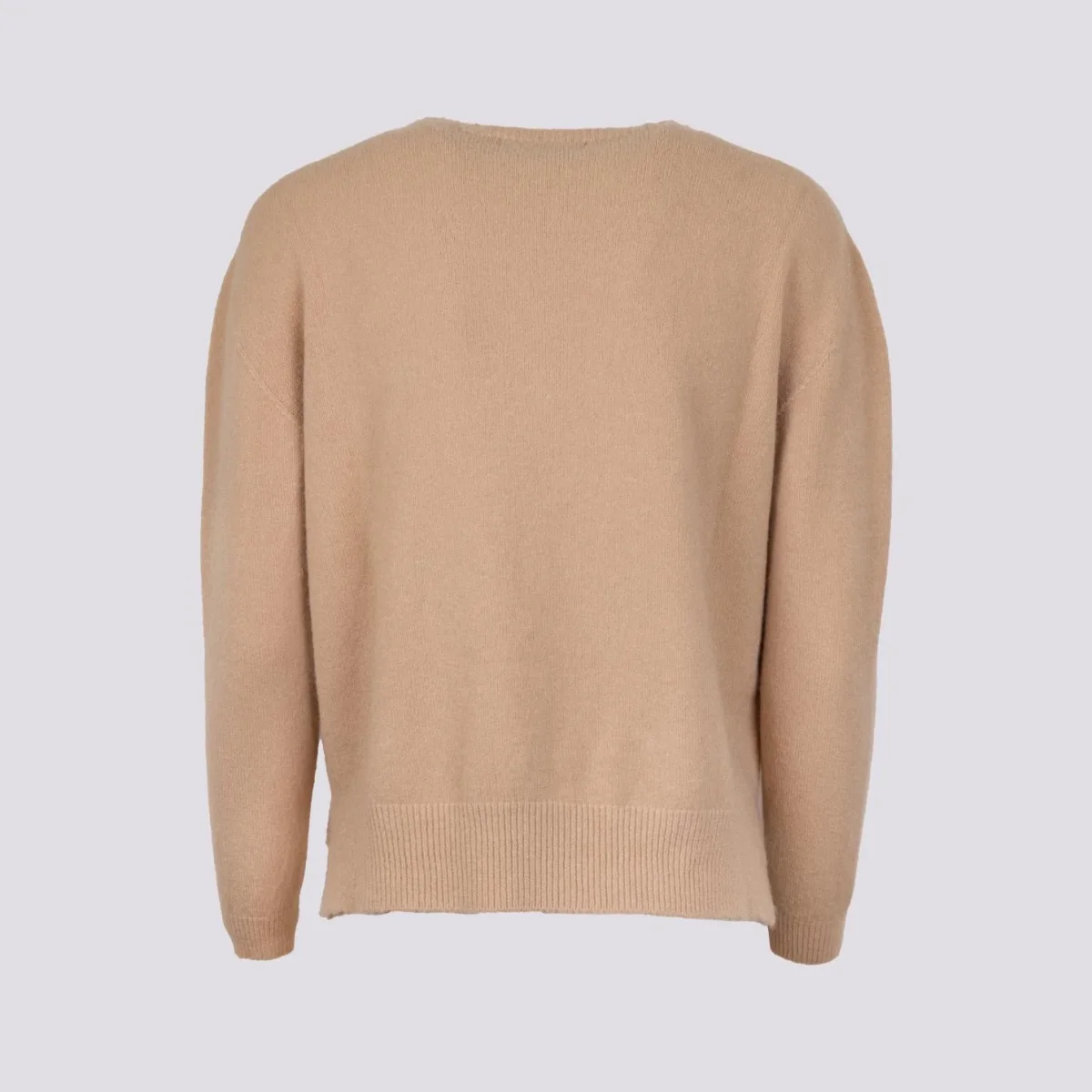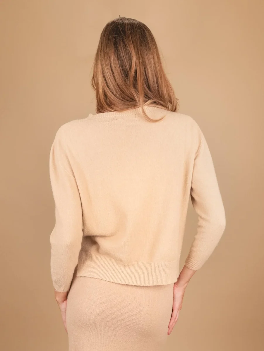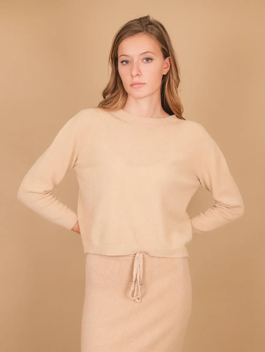 Girocollo in maglia beige con micro spacchi laterali e profili a coste. Vestibilità slim. Peso medio. Composizione: 50% vi, 27% po 23% pl.