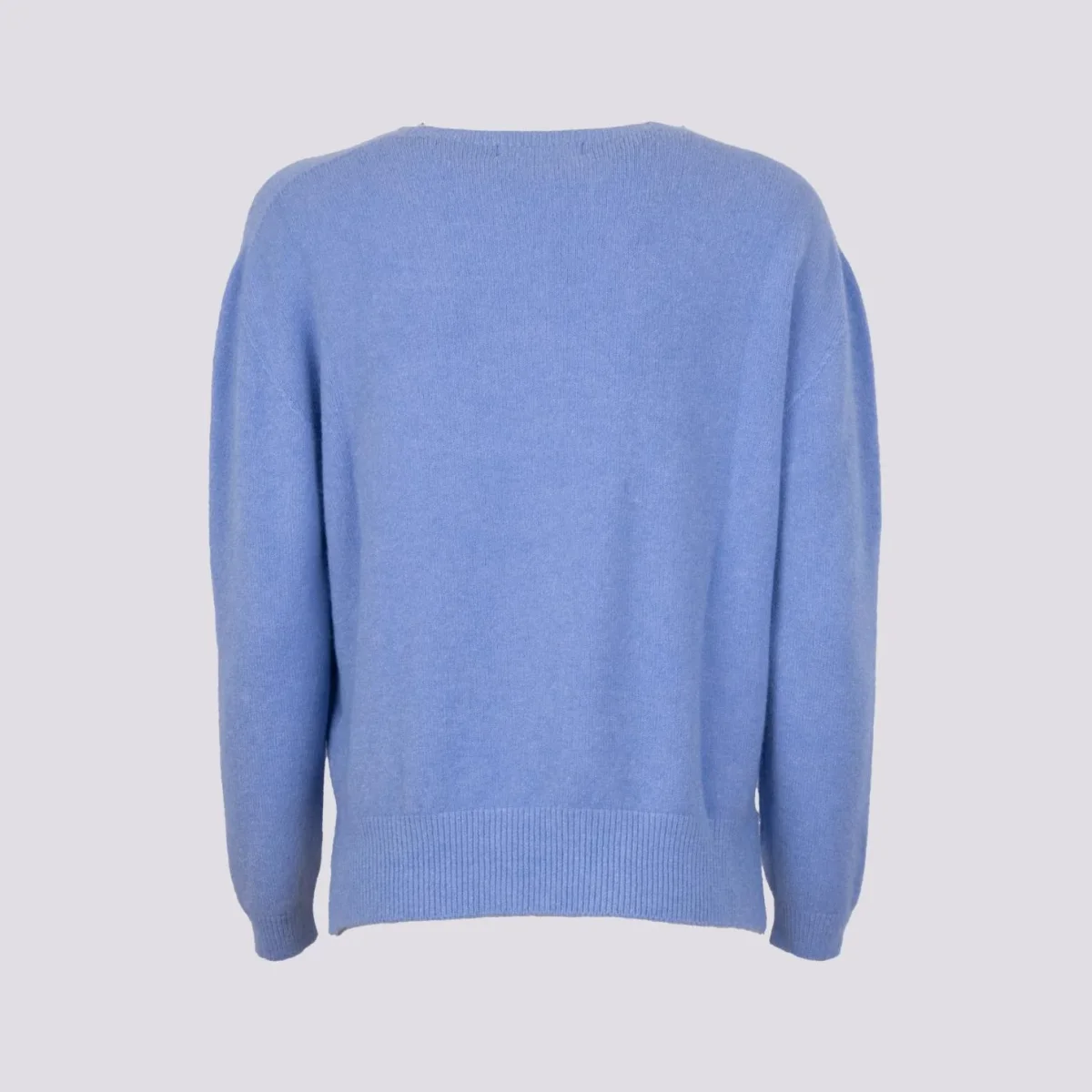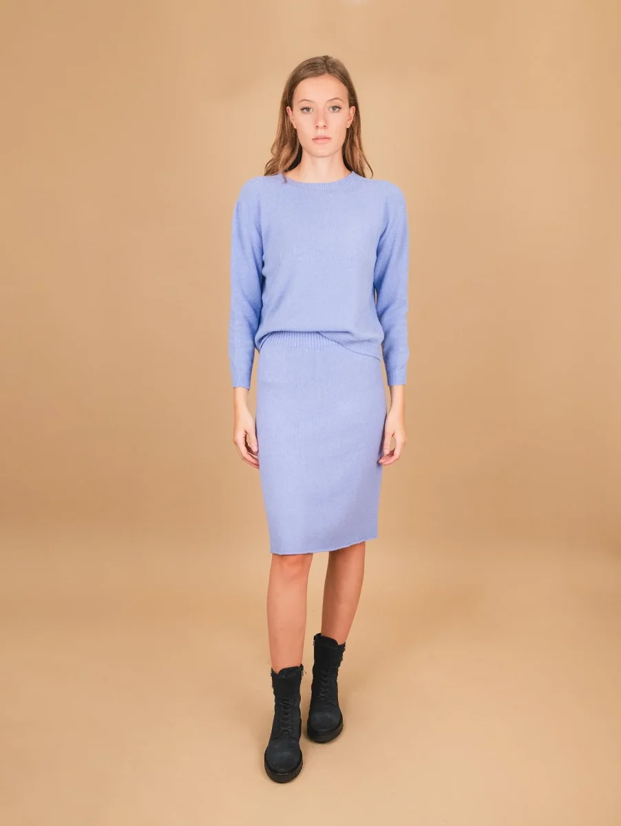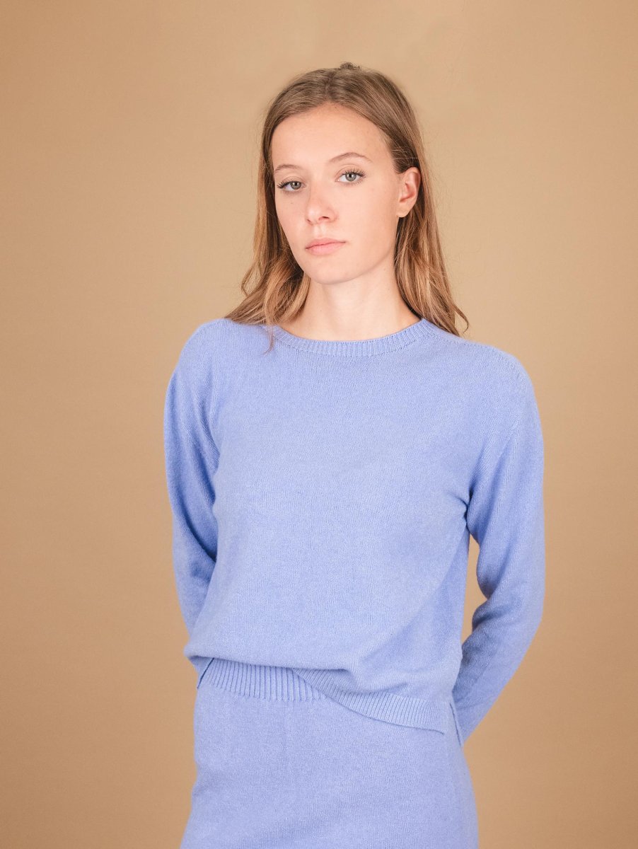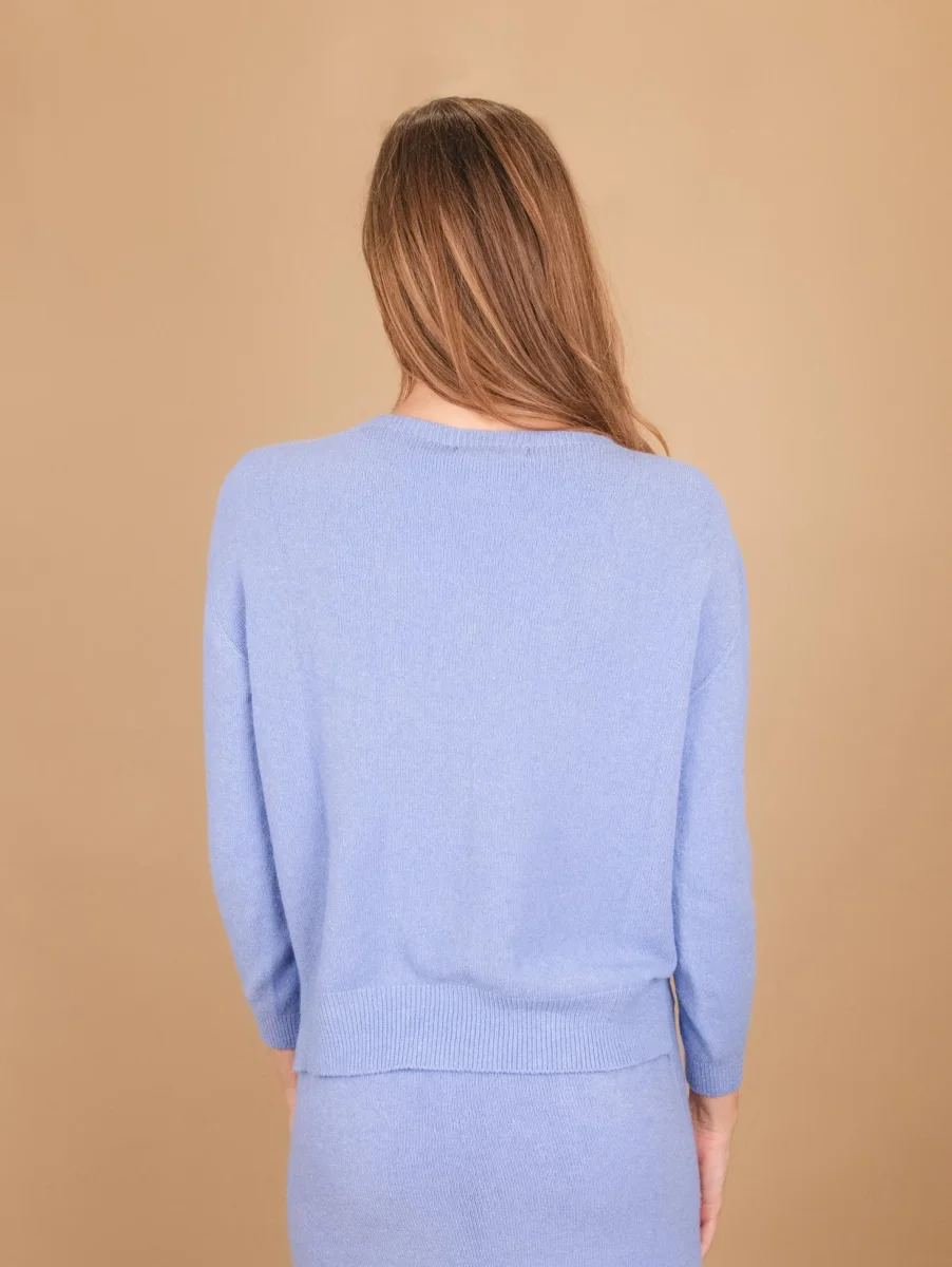 Girocollo in maglia azzurro con micro spacchi laterali e profili a coste. Vestibilità slim. Peso medio. Composizione: 50% vi, 27% po 23% pl.