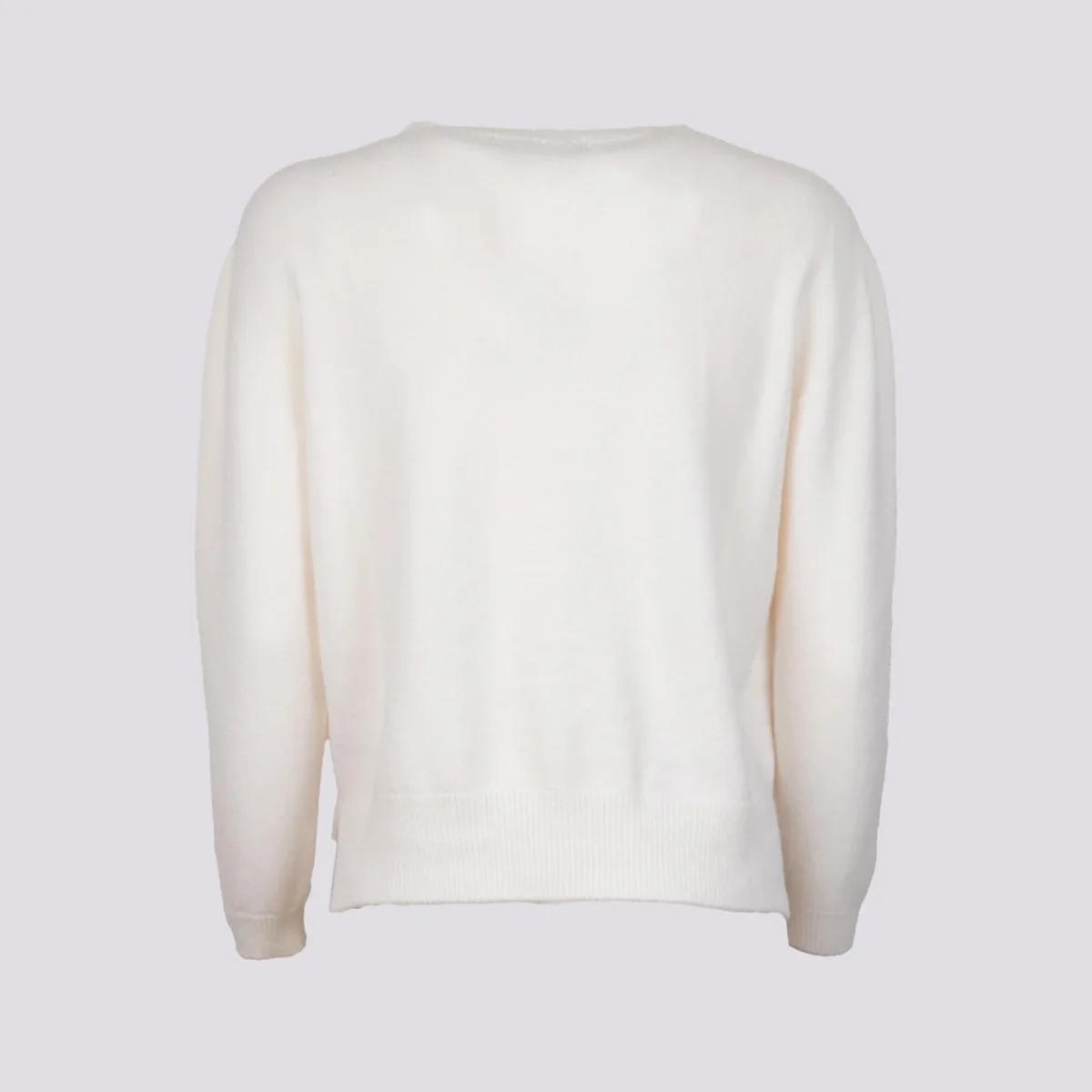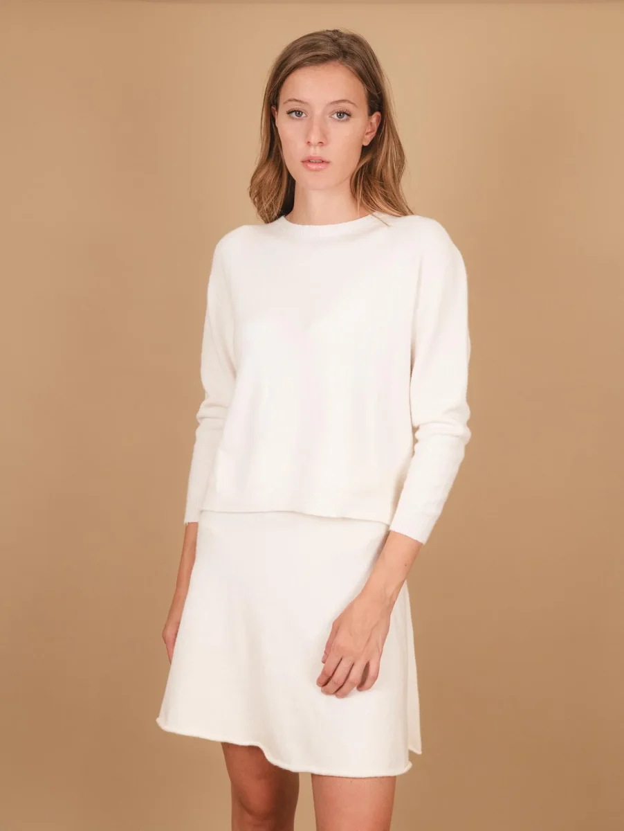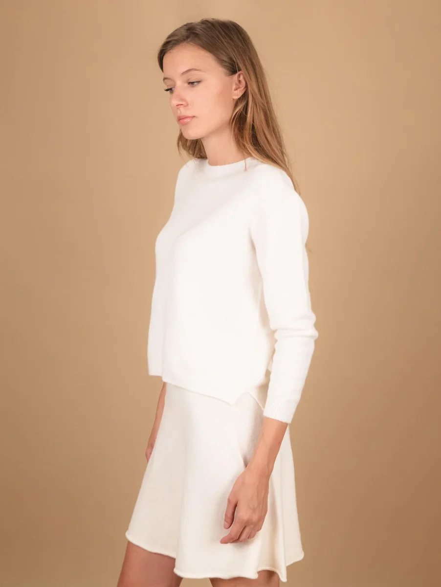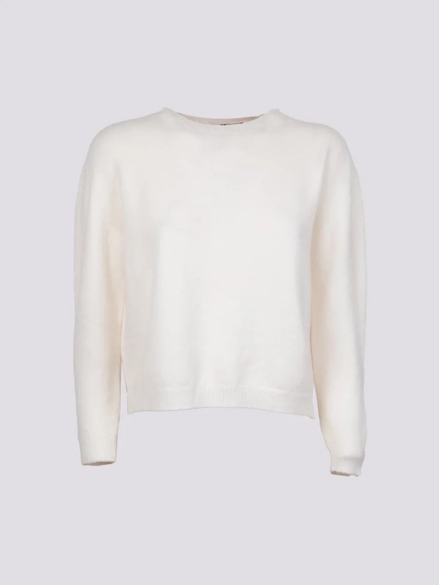 Girocollo in maglia panna con micro spacchi laterali e profili a coste. Vestibilità slim. Peso medio. Composizione: 50% vi, 27% po 23% pl.