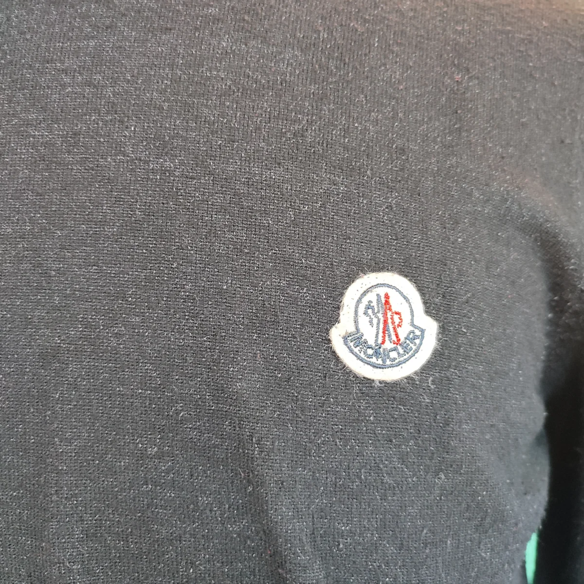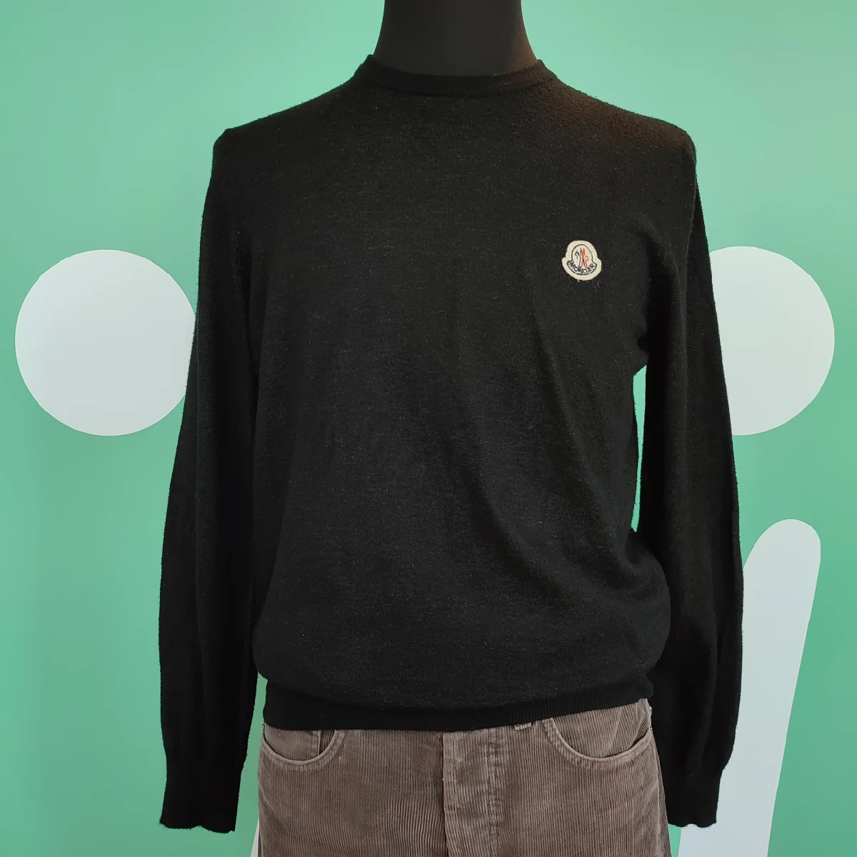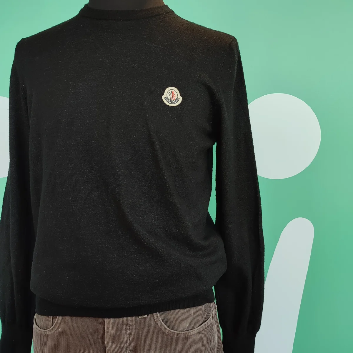 Maglioncino da uomo a girocollo, Moncler, tg XXL, color nero. Composizione materiale: 35% viscosa, 35% modal, 20% polyamide, 10% elasthanne, un po’ usurato come da foto ma in condizioni buone.