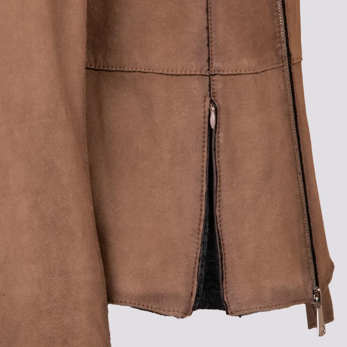 Giubbotto in pelle camoscio marrone con dettaglio zip su tutta la parte inferiore. Questo capo, ideale per essere indossato durante le mezze stagioni, va portato aderente sul corpo con la possibilità di aprire tutte le zip a scomparsa applicate sulla parte bassa della giacca per una maggiore elasticità. Dettaglio zip applicate anche su entrambi i polsi. Colletto modello coperto da un collo rimovibile in montone marrone. L’interno di questa giacca è accoppiato direttamente alla fodera in fantasia per renderlo il più sottile possibile senza rinunciare al calore della fodera. Lavare solo in centri specializzati.