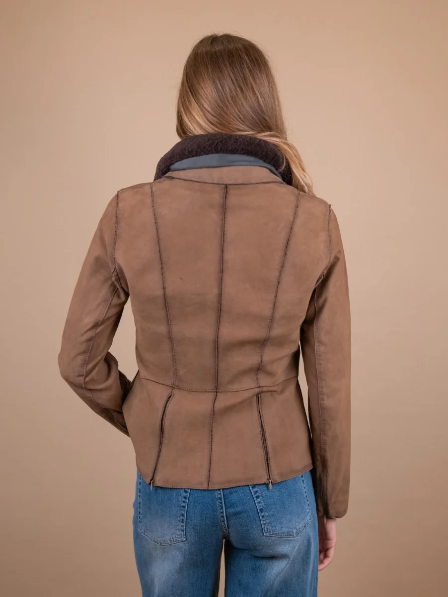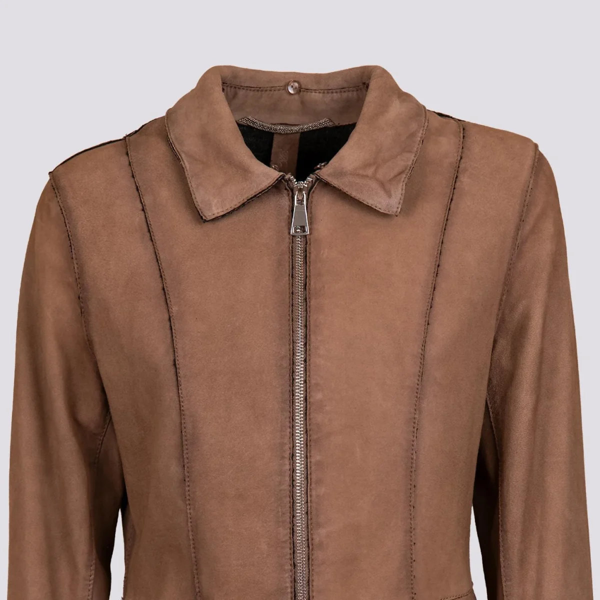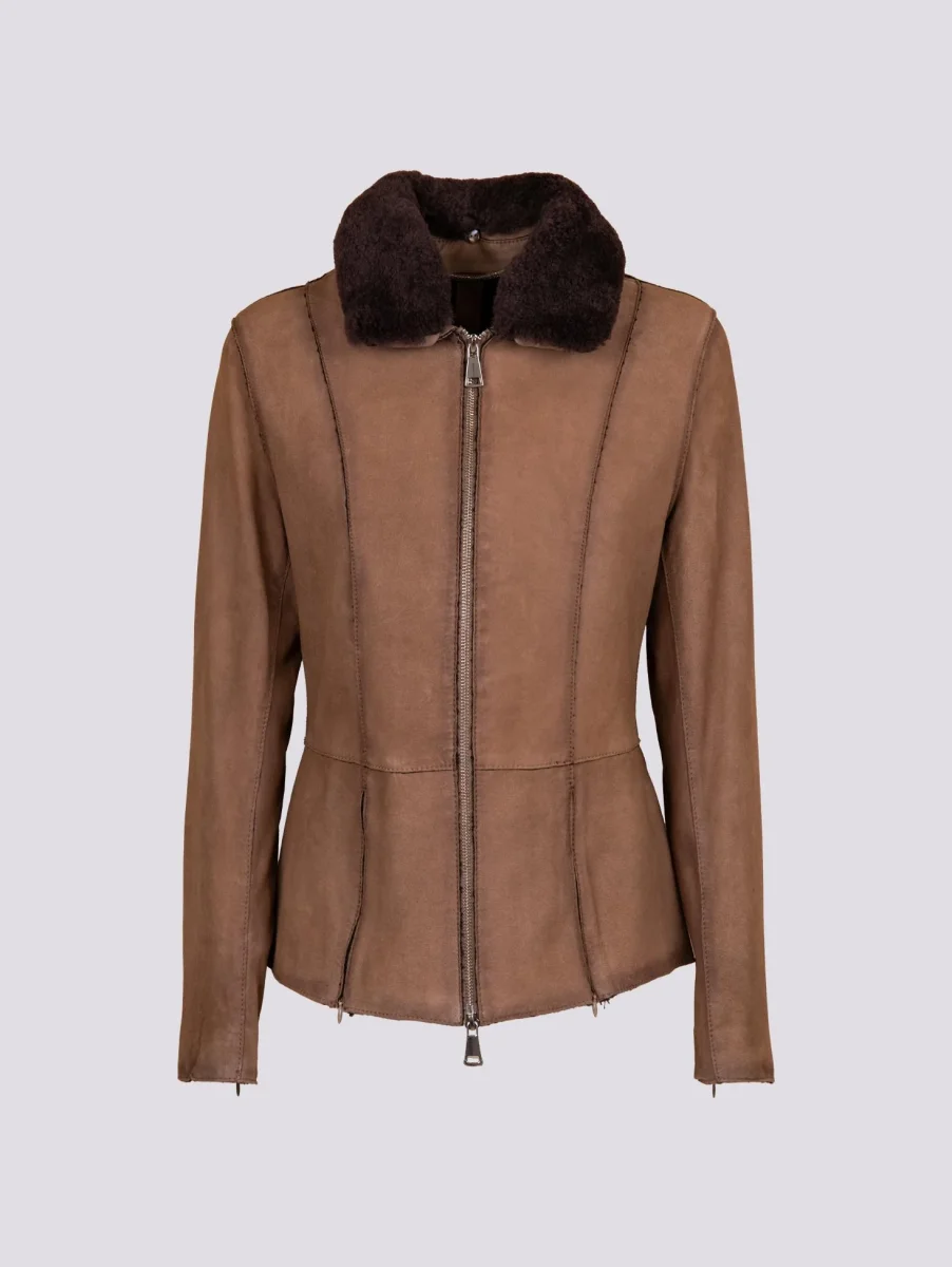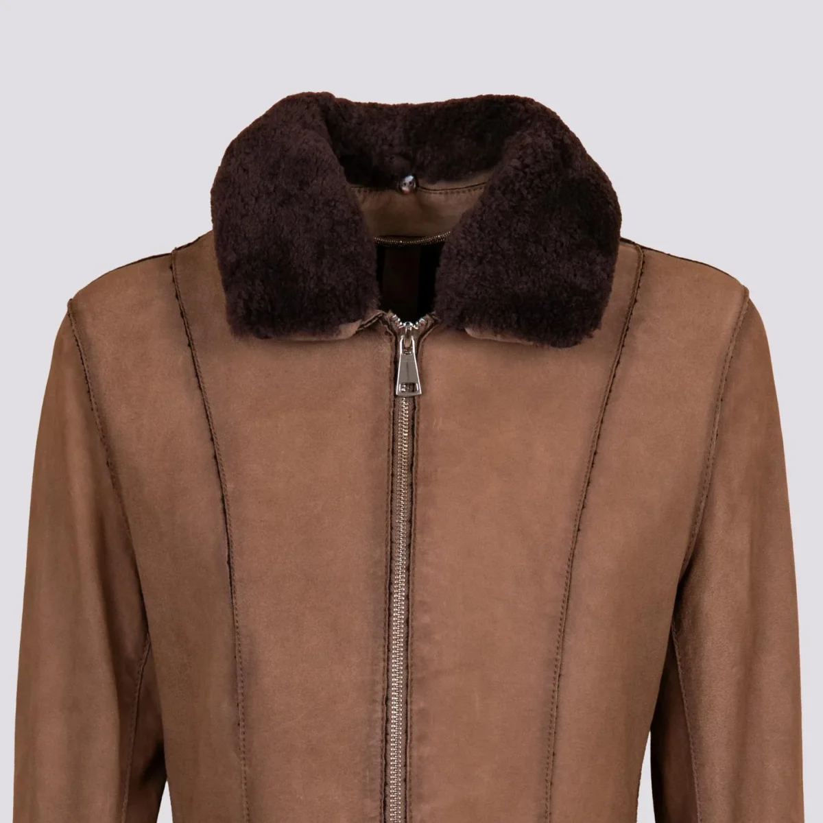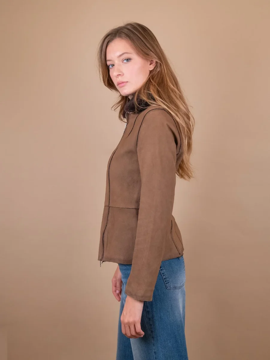 GIUBBOTTO IN CAMOSCIO CON ZIP E COLLO IN MONTONE TABACCO