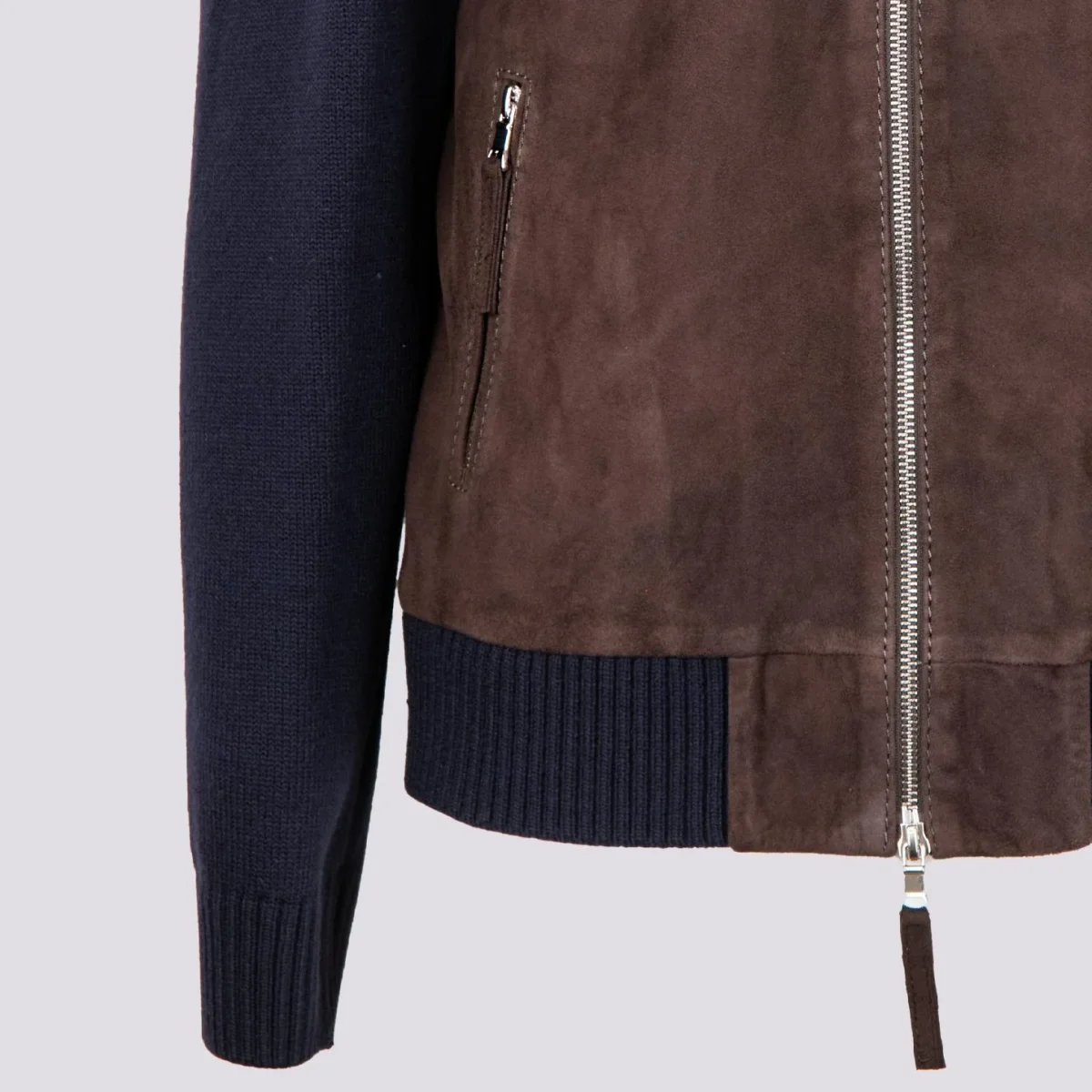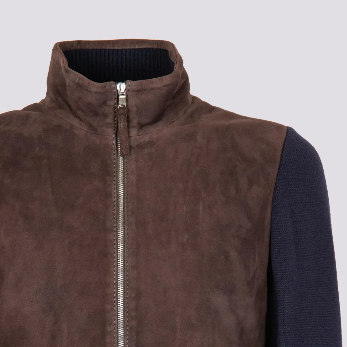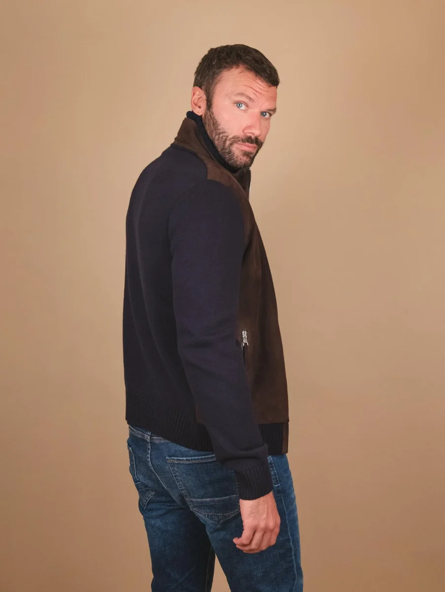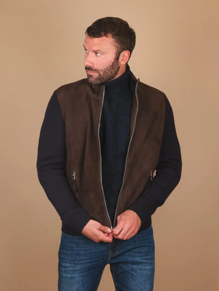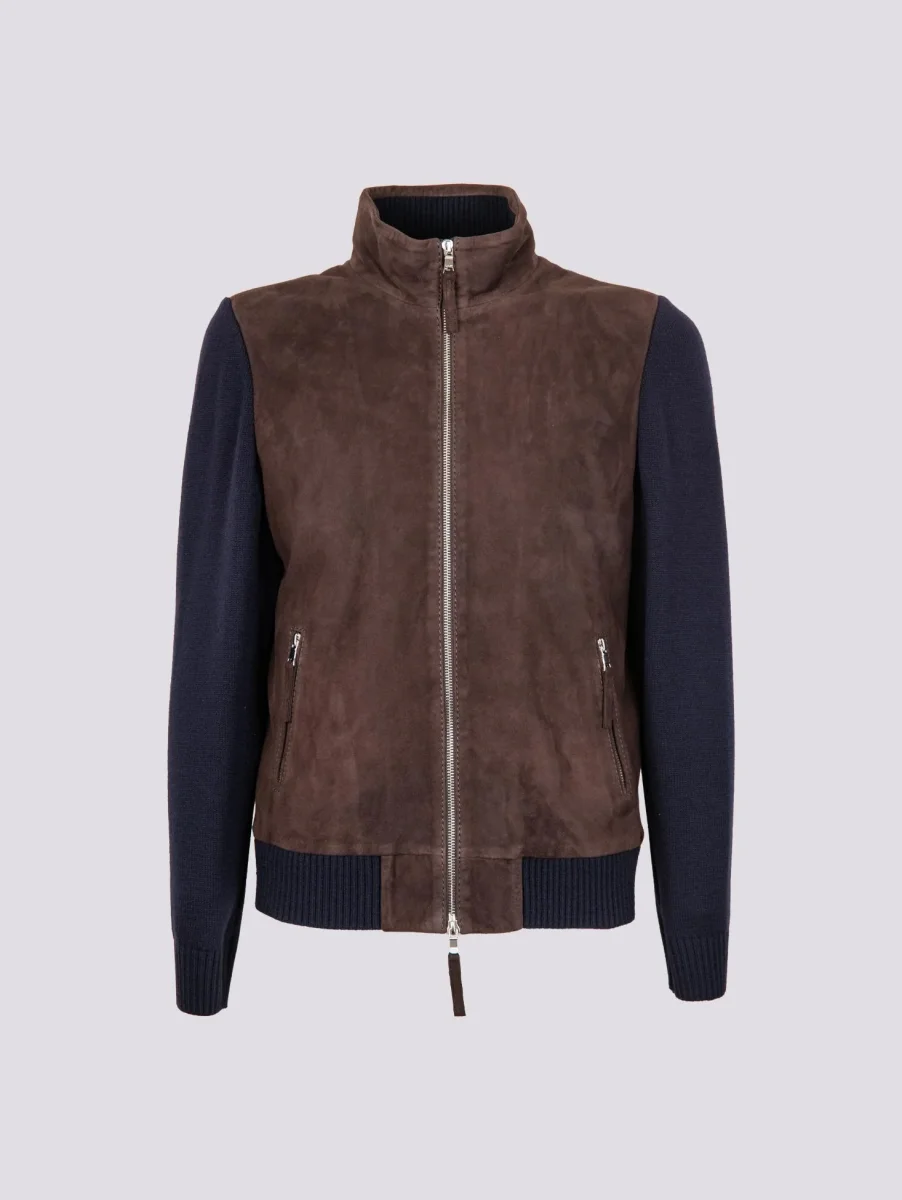 Giubbotto in camoscio marrone e maglia con chiusura zip in metallo frontale e doppia tasca a filo laterale. La parte frontale del capo ha inserti in pelle camoscio, mentre il retro e le maniche sono realizzati in maglia con i polsini e il fondo elasticizzati rendendolo così più avvolgente e casual. Questo giubbotto fa parte della collezione knits and leather che unisce il comfort della maglieria con il gusto intramontabile dei capi in vera pelle. Viene realizzato con il materiale suede che conferisce brillantezza e morbidezza uniche al capo. Ideale per l’inverno poiché fonde concetti eterogenei in un armonico connubio di pelli e filati reinventando i must del classico maschile. Vestibilità slim. Peso medio.