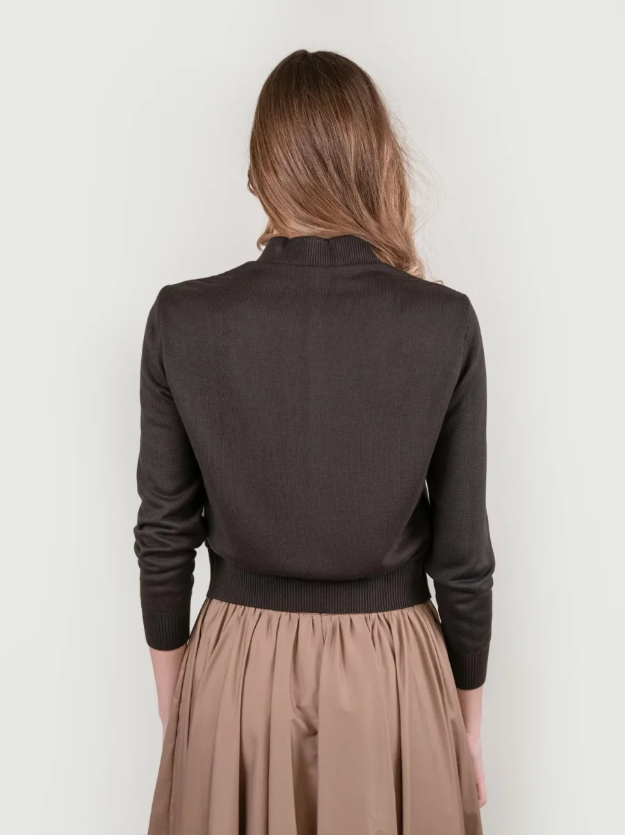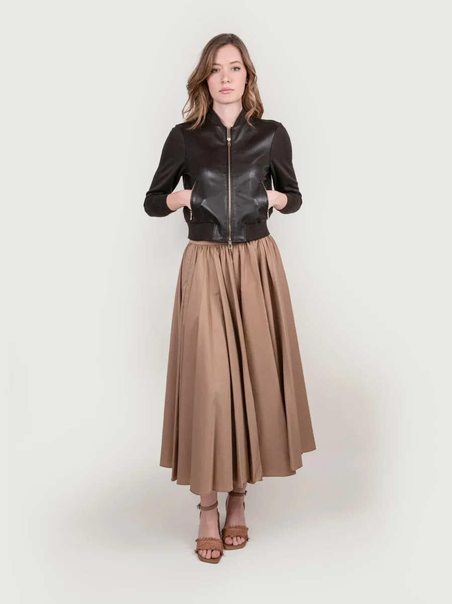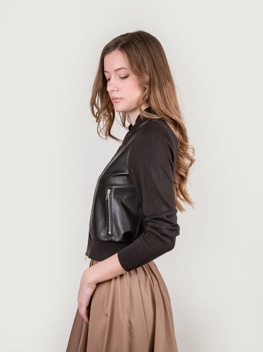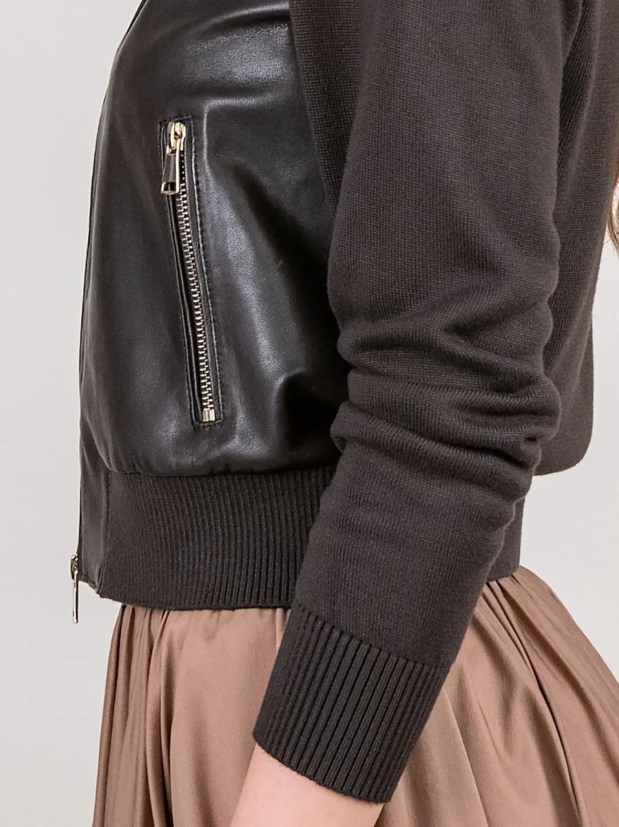 Giubbotto in pelle e maglia marrone.