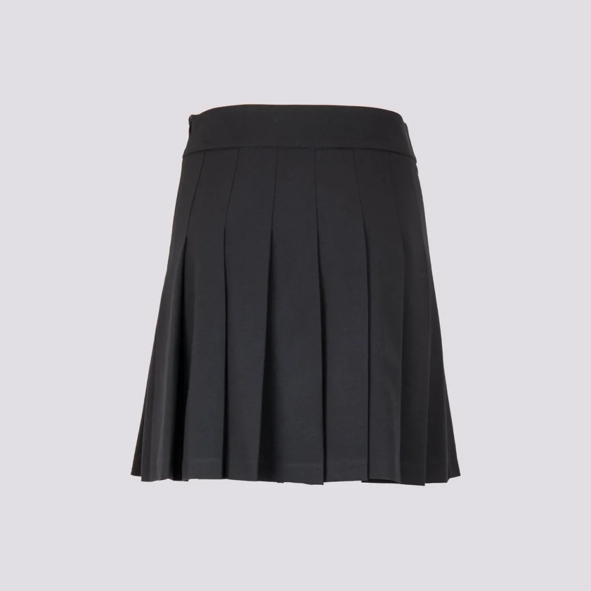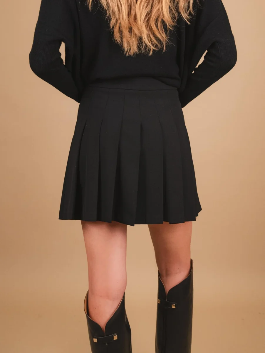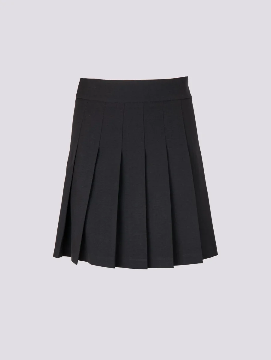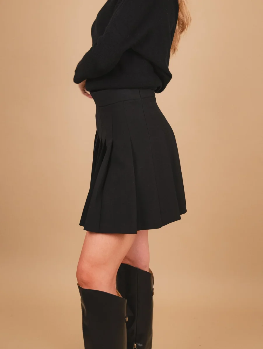 Gonna a balze in tessuto nero, acquistabile singolarmente o in abbinamento al blazer doppiopetto della stessa tonalità per indossarlo come completo abbinato. Chiusura zip a scomparsa laterale. Interno sfoderato. Peso leggero. Vestibilità regolare.