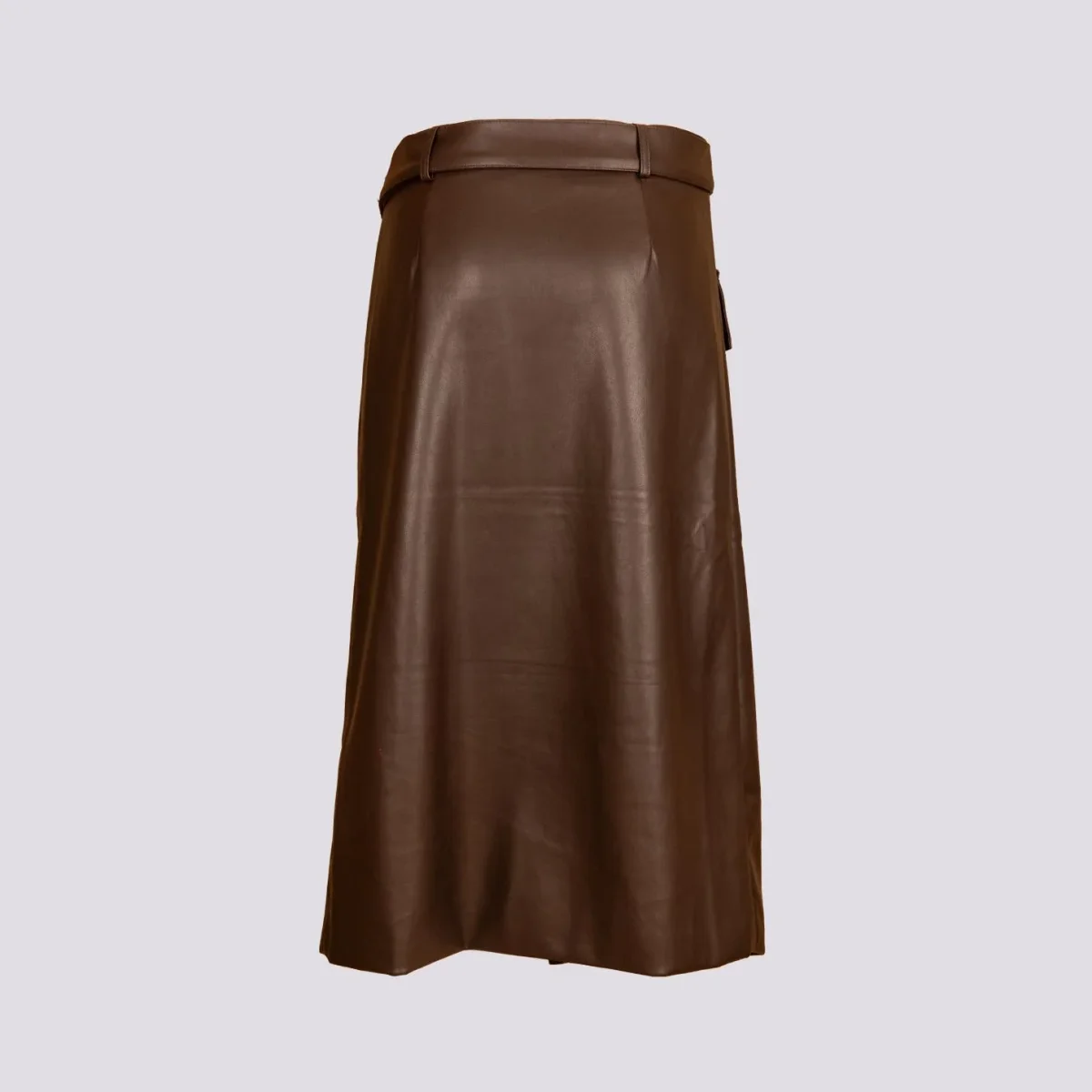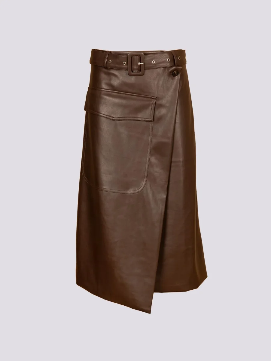 Gonna midi a portafoglio in ecopelle marrone. Maxi tasca applicata frontale. Chiusura doppio bottone asimmetrico. Dettaglio cintura in tonalità rimovibile e regolabile a seconda delle preferenze. Modello stretto in vita che scende morbido sui fianchi. Vestibilità regolare tendenzialmente morbida. Interno foderato in tonalità. Peso medio. Composizione: 100% pl.