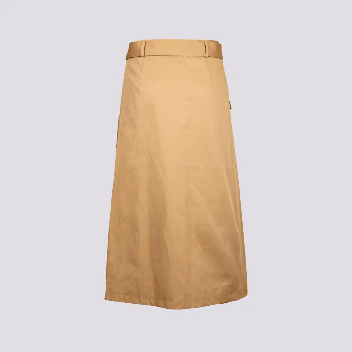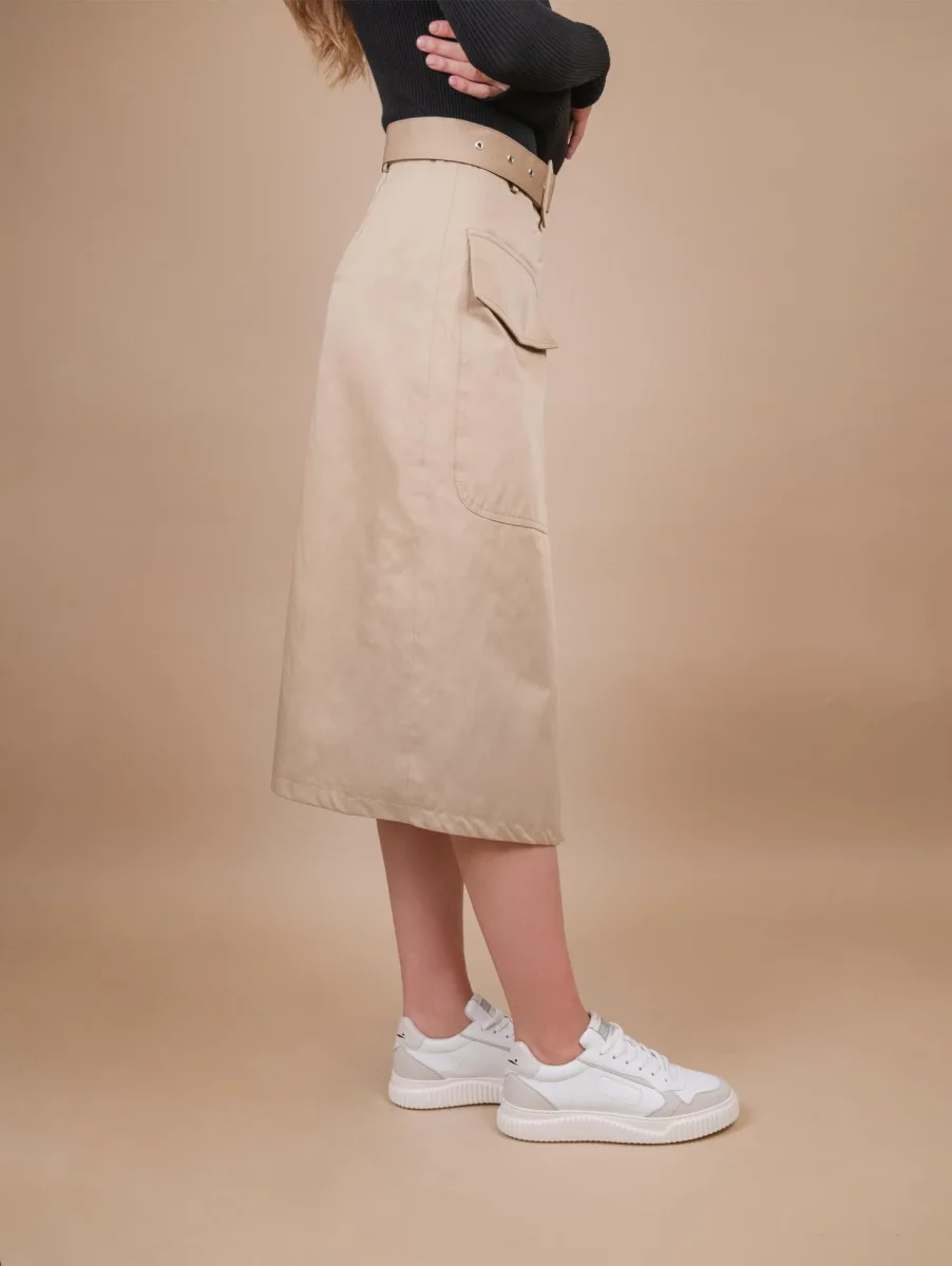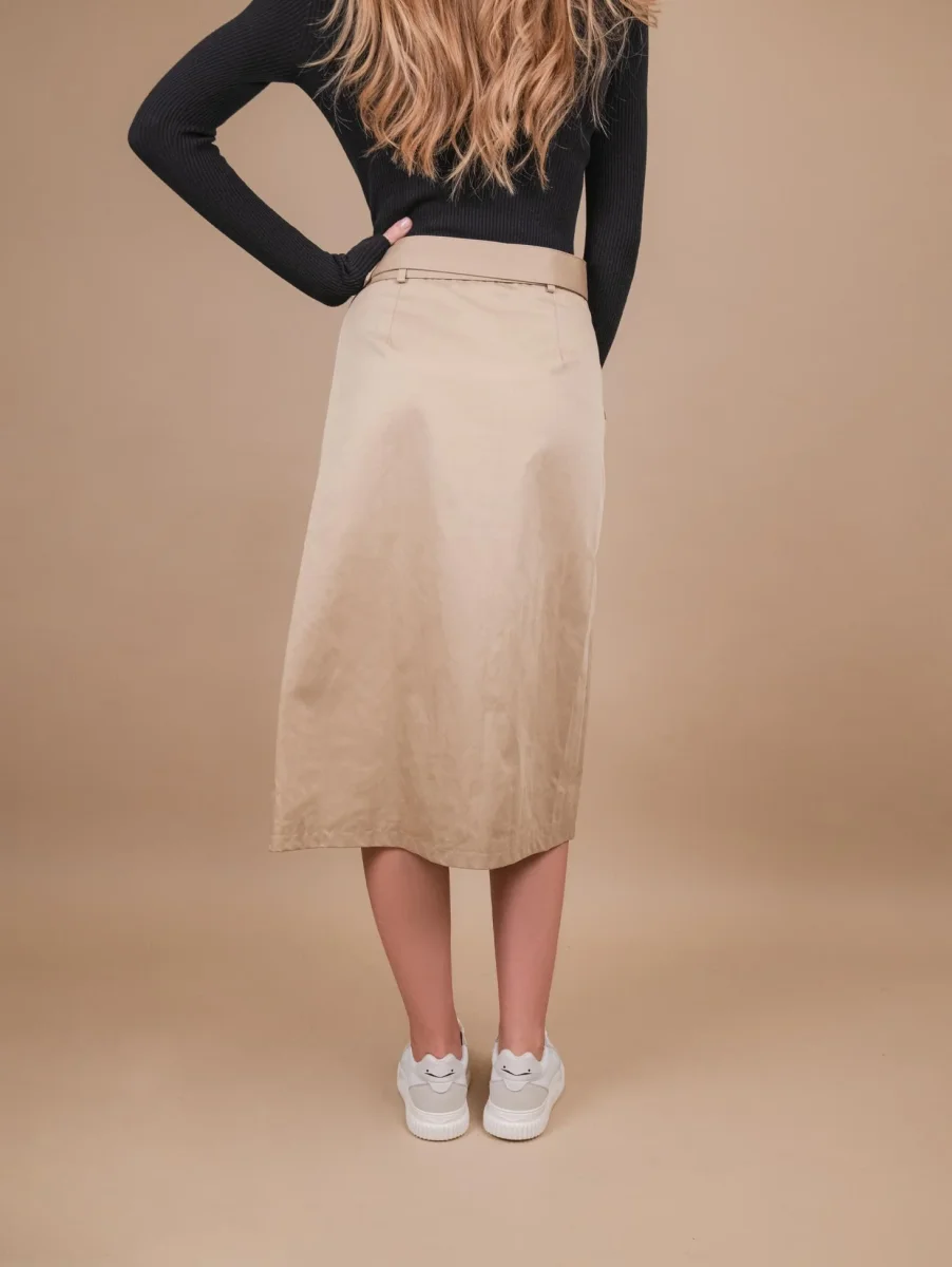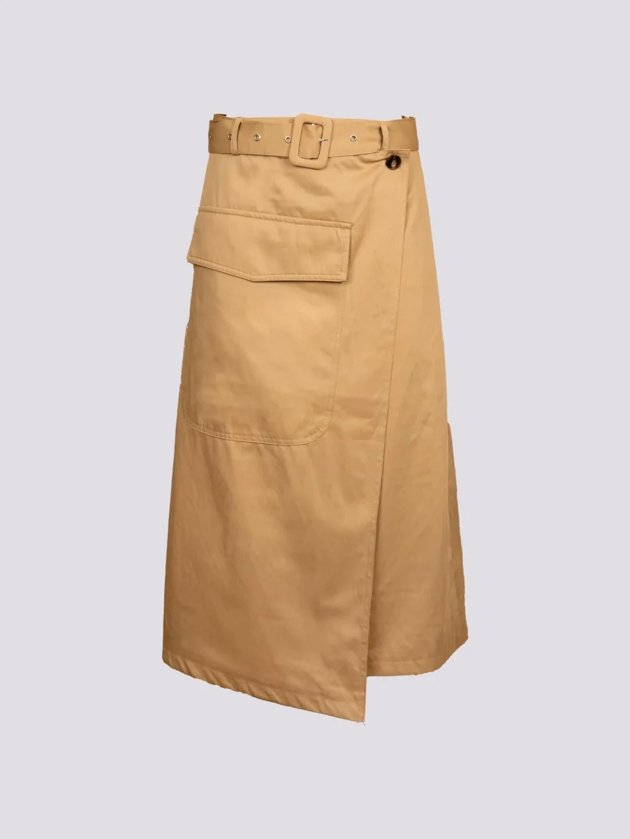 Gonna midi a portafoglio in misto cotone cammello. Maxi tasca applicata frontale. Chiusura doppio bottone asimmetrico. Dettaglio cintura in tonalità rimovibile e regolabile a seconda delle preferenze. Modello stretto in vita che scende morbido sui fianchi. Vestibilità regolare tendenzialmente morbida. Interno foderato in tonalità. Peso leggero. Composizione: 55% cotone 45% poliestere.