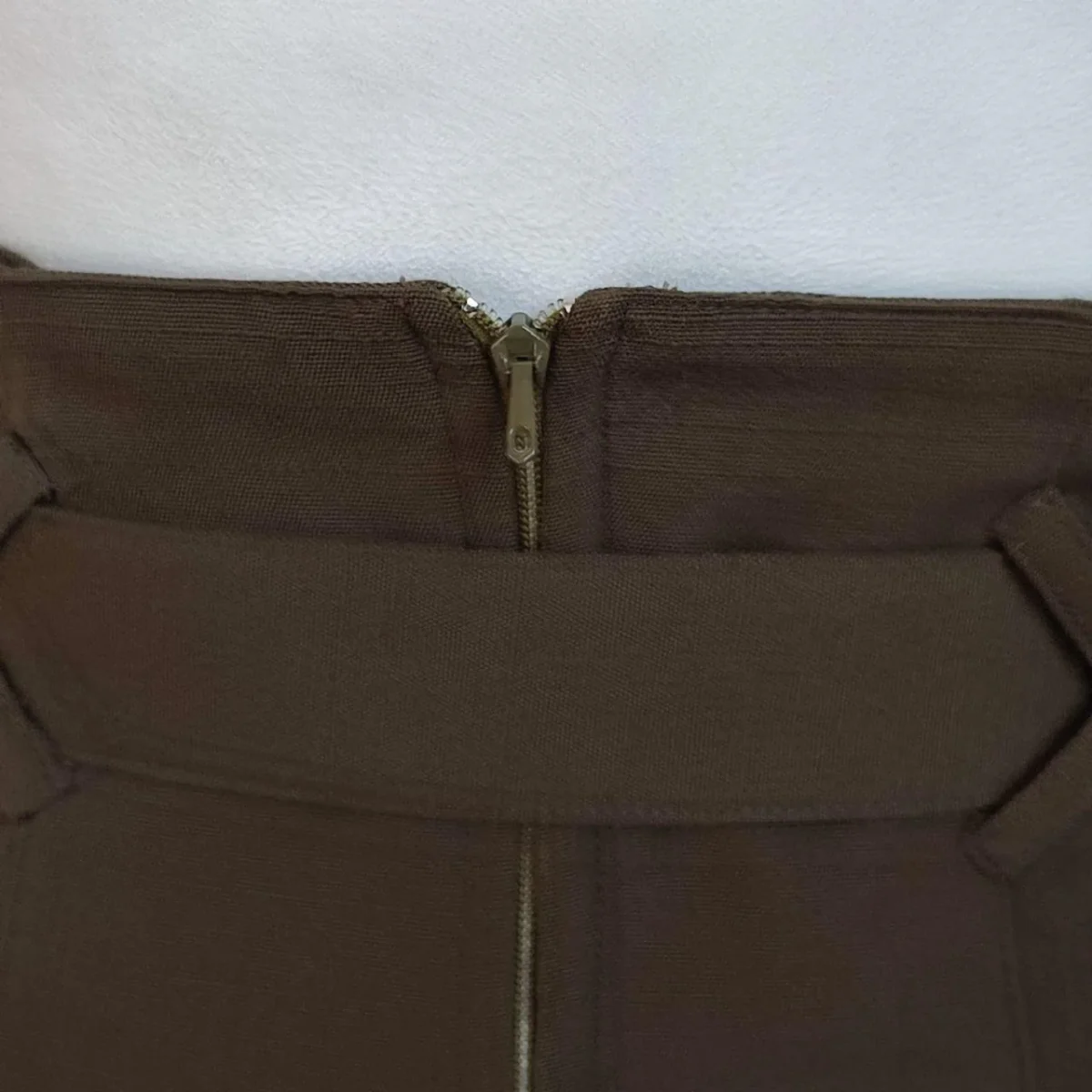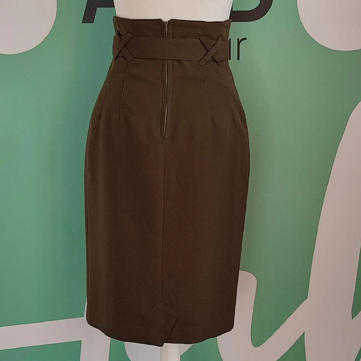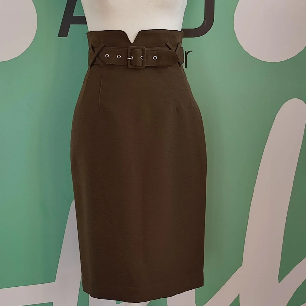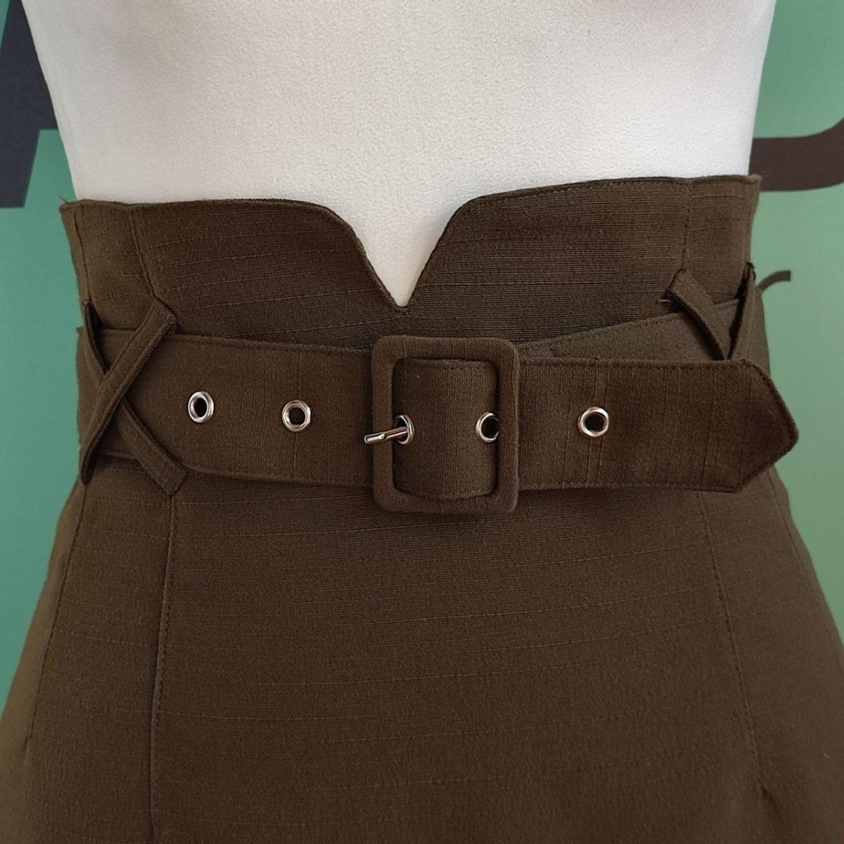 Gonna midi, marca Arancia Meccanica, taglia 40. La gonna si presenta in ottime condizioni, senza alcun apparente difetto. Il gonna è midi, di colore verde oliva con dei passanti che si incrociano formando un particolare dettaglio che impreziosisce la gonna. Ovviamente è presente anche una cintura, dello stesso colore della gonna, per poter stringere il capo alla vita. Il tessuto è composto al 65% di poliestere e al 35% di viscosa, mentre la fodera interna è composta al 100% in poliestere. Presenta anche un piccolo spacco nell’orlo finale, giusto di qualche centimetro.