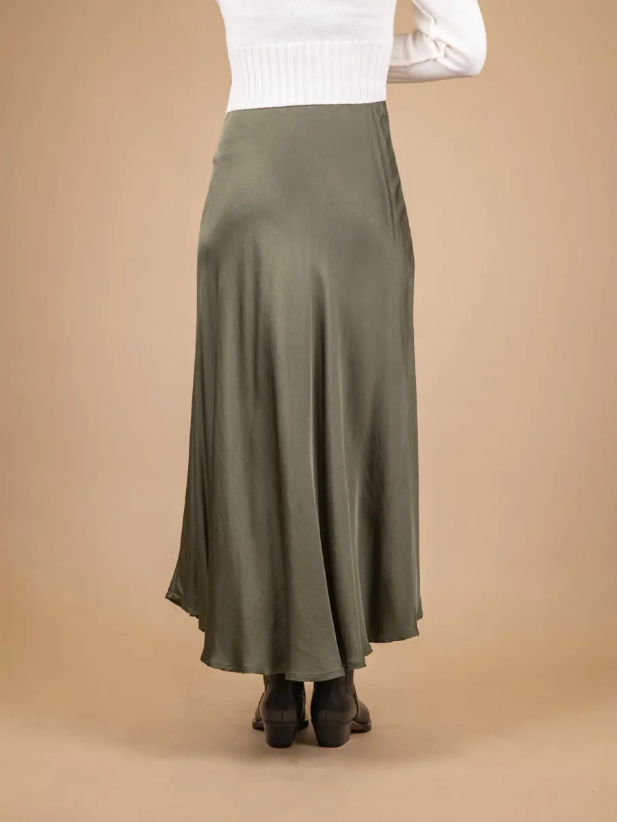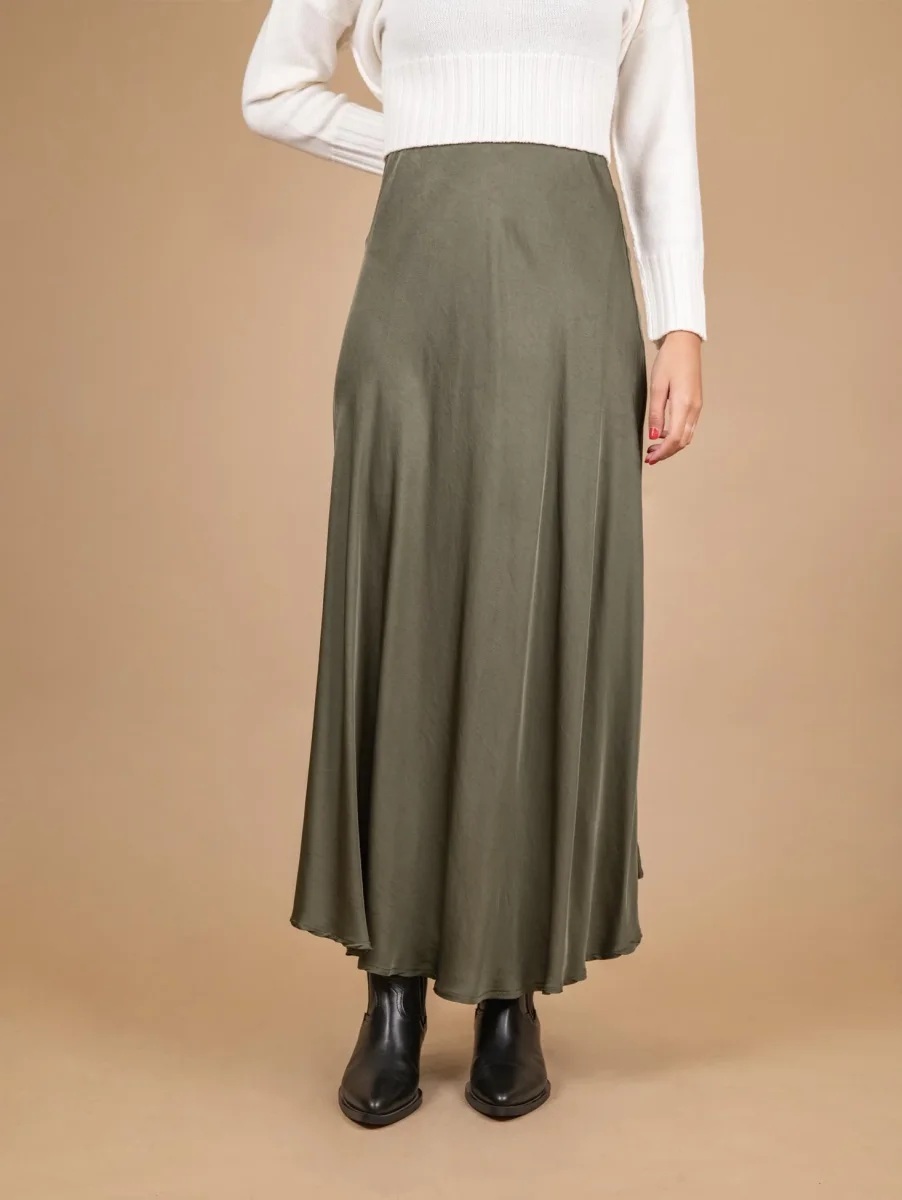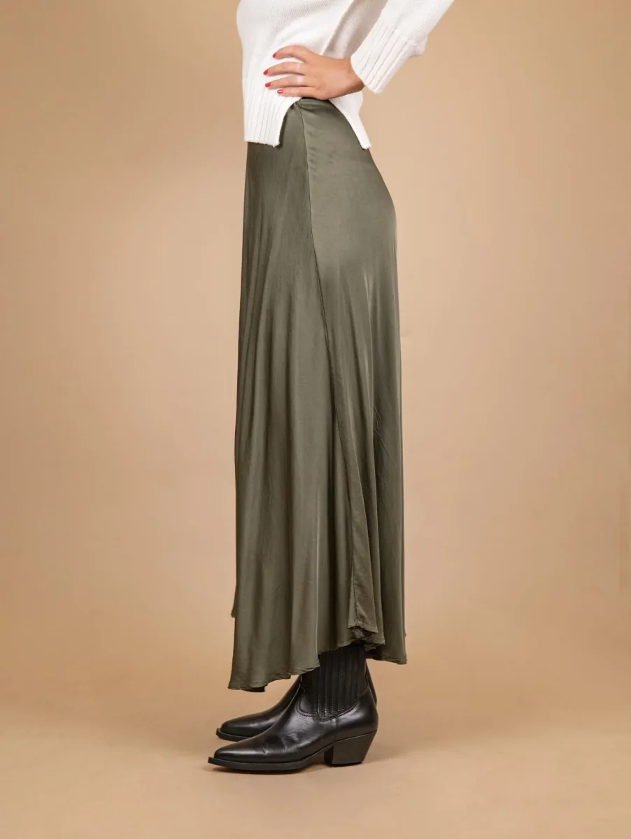 Gonna longuette in misto seta verde militare. Interno sfoderato. Elastico in vita. La vestibiltá di questo capo accompagna la silhouette del corpo esaltandone le parti migliori. Questa gonna si indossa infilandola direttamente dal basso o dall’alto a seconda delle preferenze. Peso leggero. Composizione: 70% viscosa, 30% seta.