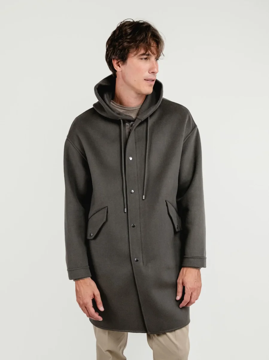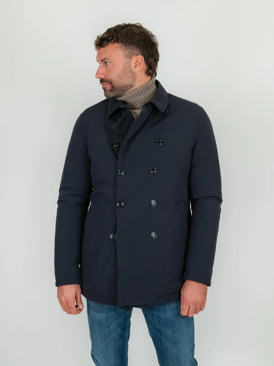 Collo importante che richiama il tradizionale peacoat, Le tasche con pattina e le tasche sul petto aggiungono carattere e funzionalità al capo.