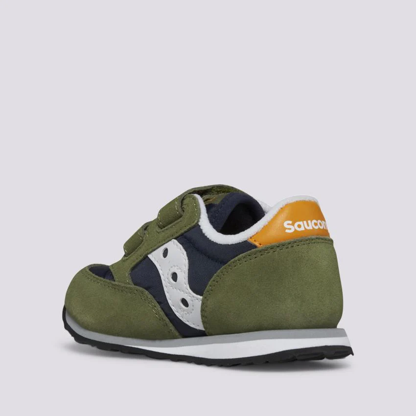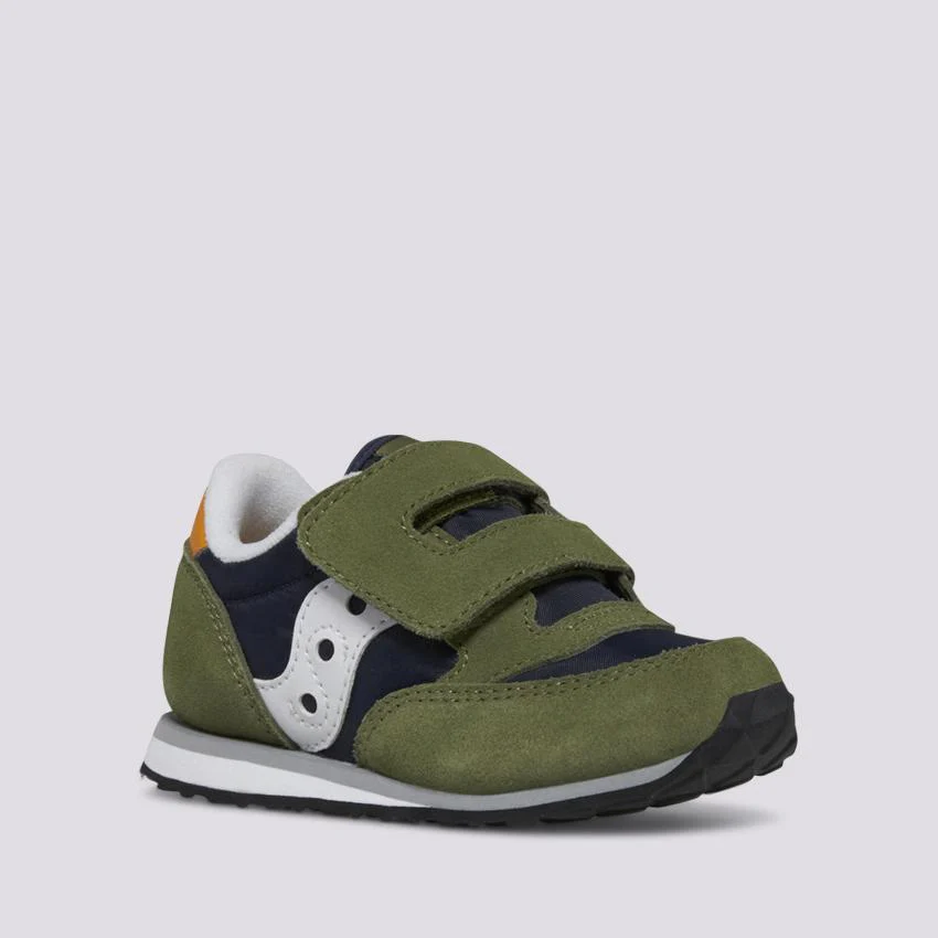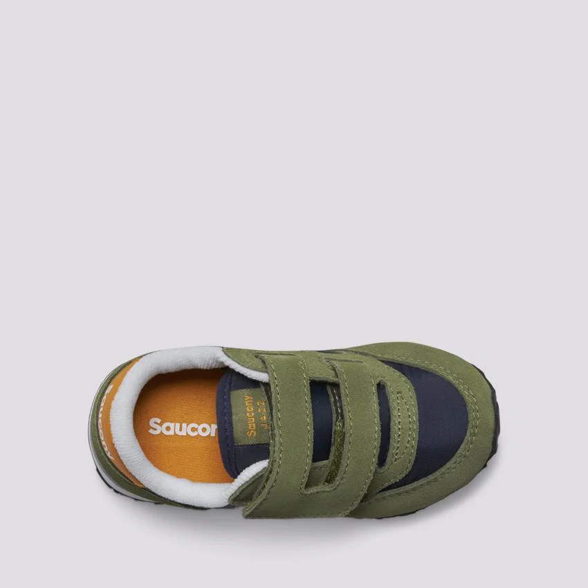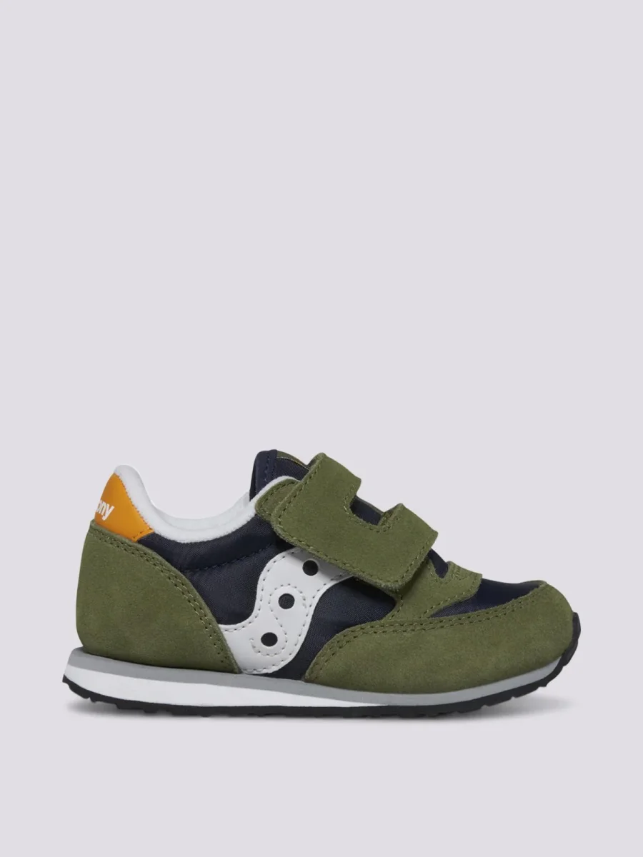 Le scarpe Jazz Saucony per bambino con strappo hanno uno stile tradizionale con tomaia in camoscio e nylon. Queste sneaker verde oliva, blu e oro sono leggere, traspiranti e resistenti, la prova che a volte niente può superare l’originale.